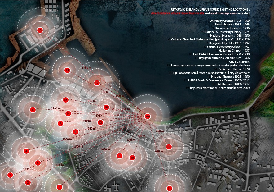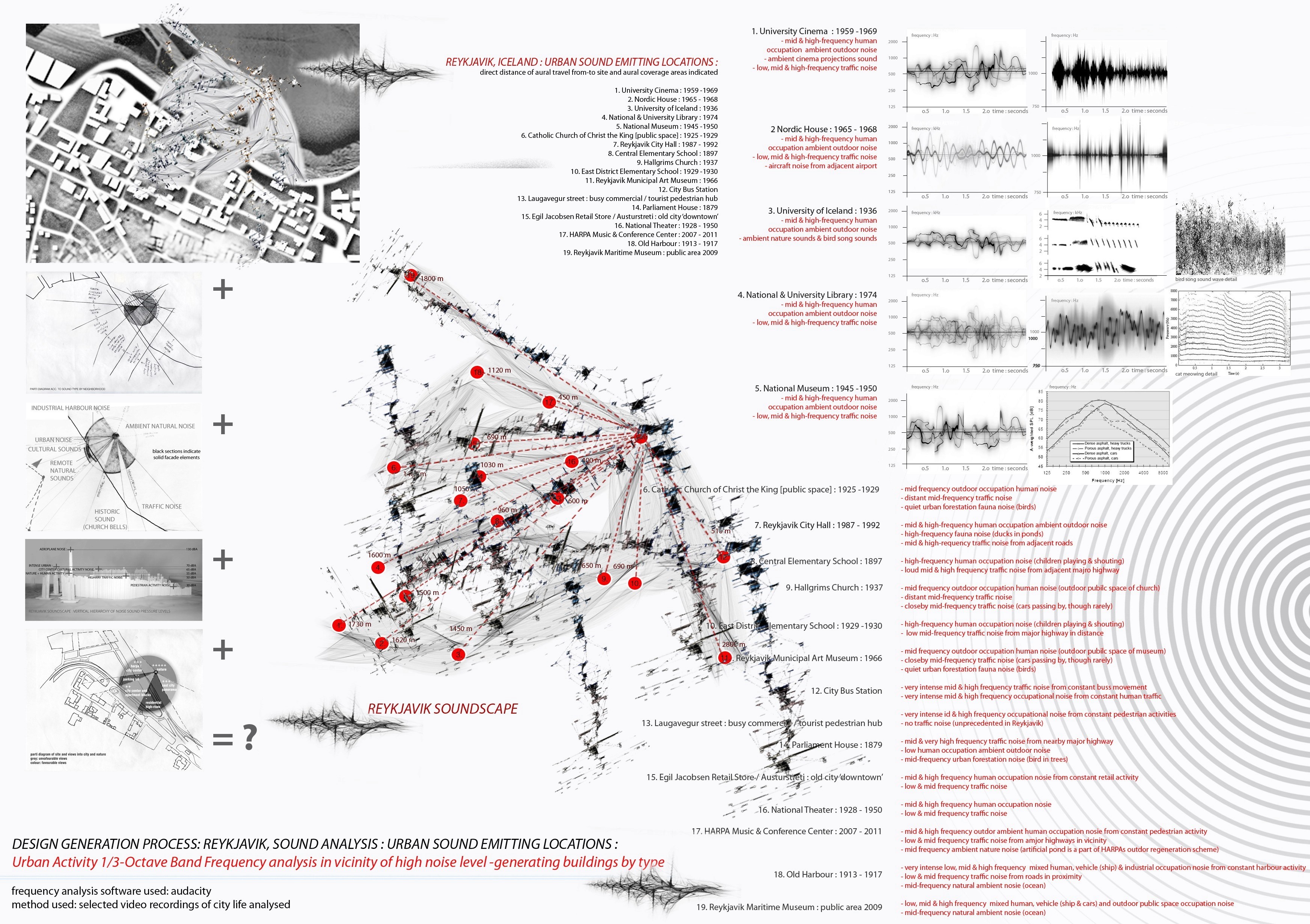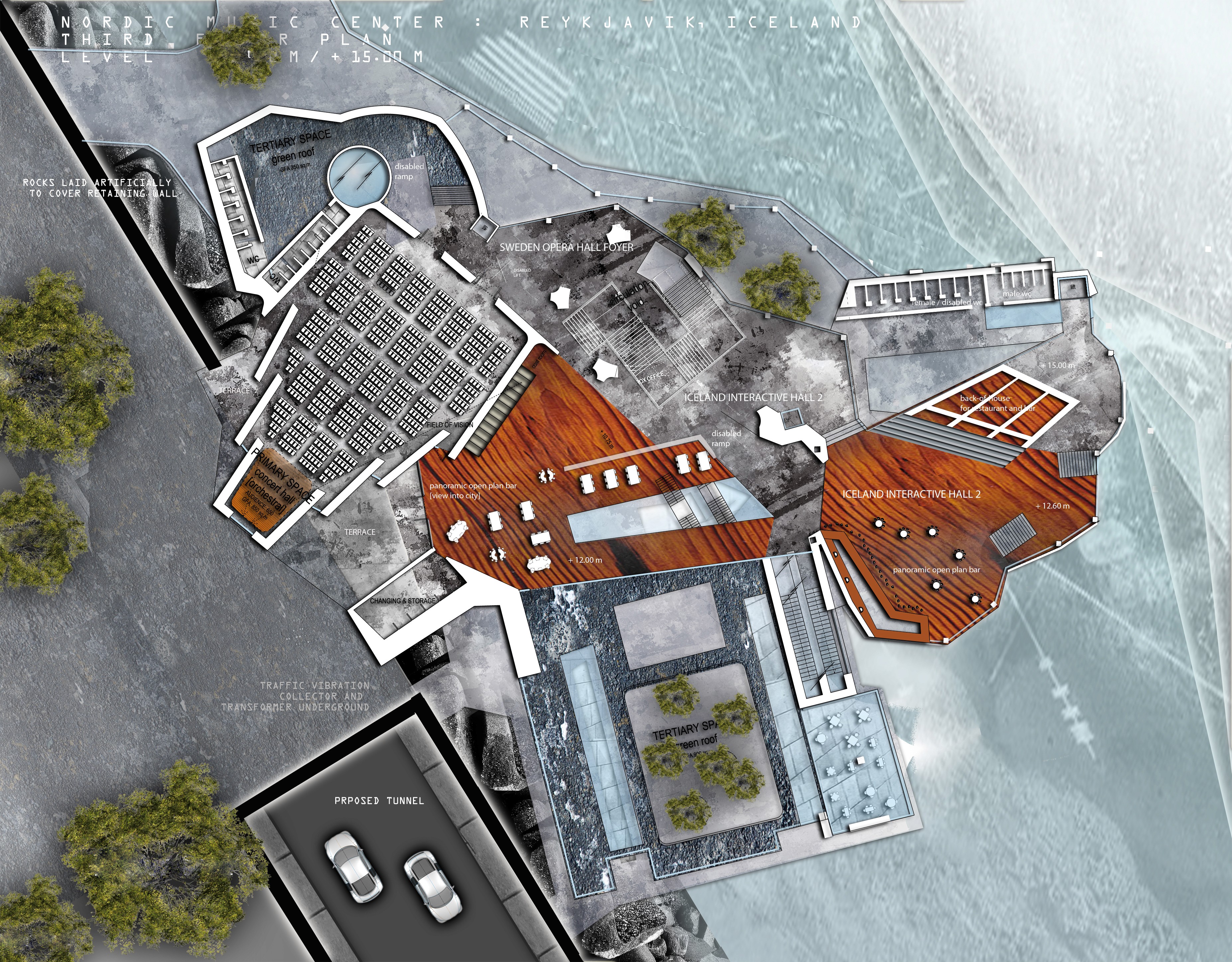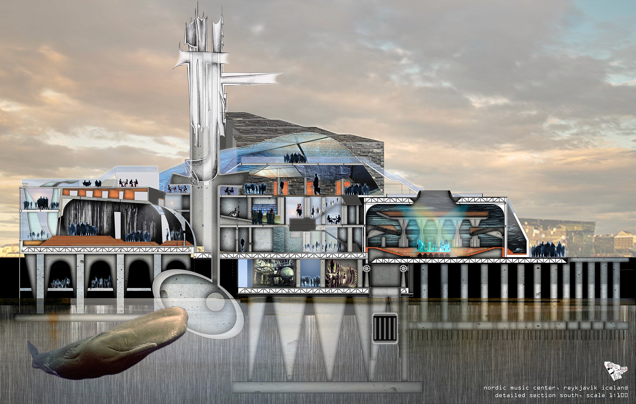 A Scandinavian music center based in the heart of Reykjavik. The project is a materialization of the detailed recording and analysis of the acoustic soundscape of Reykjavik. It consists of 5 music halls individually tailored in terms of form and acoustic properties to house experimental music from the 5 different countries of the Scandinavian world. Locally-sourced materials are preferred in light of sustainability and acoustic optimisation of sound of different pitch and frequencies. The building proposes the utilization of wind power and ocean power as it is located on the coast of the North Atlantic ocean, inclose proximity to the more traditional harpa music hall. It offers communal spaces with interactive audio-visual experiences and majestic views into the Icelandic ocean landscape. The building gathers sound from its environment as an Ambient Unifier.
