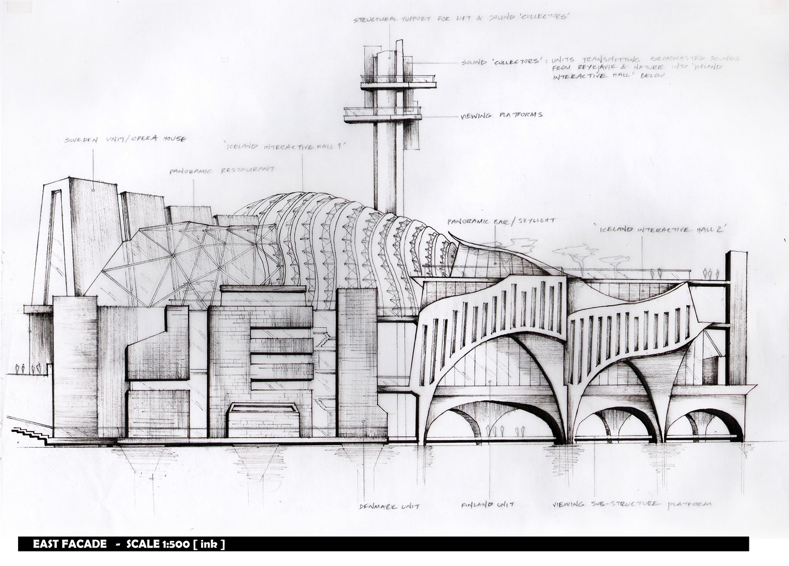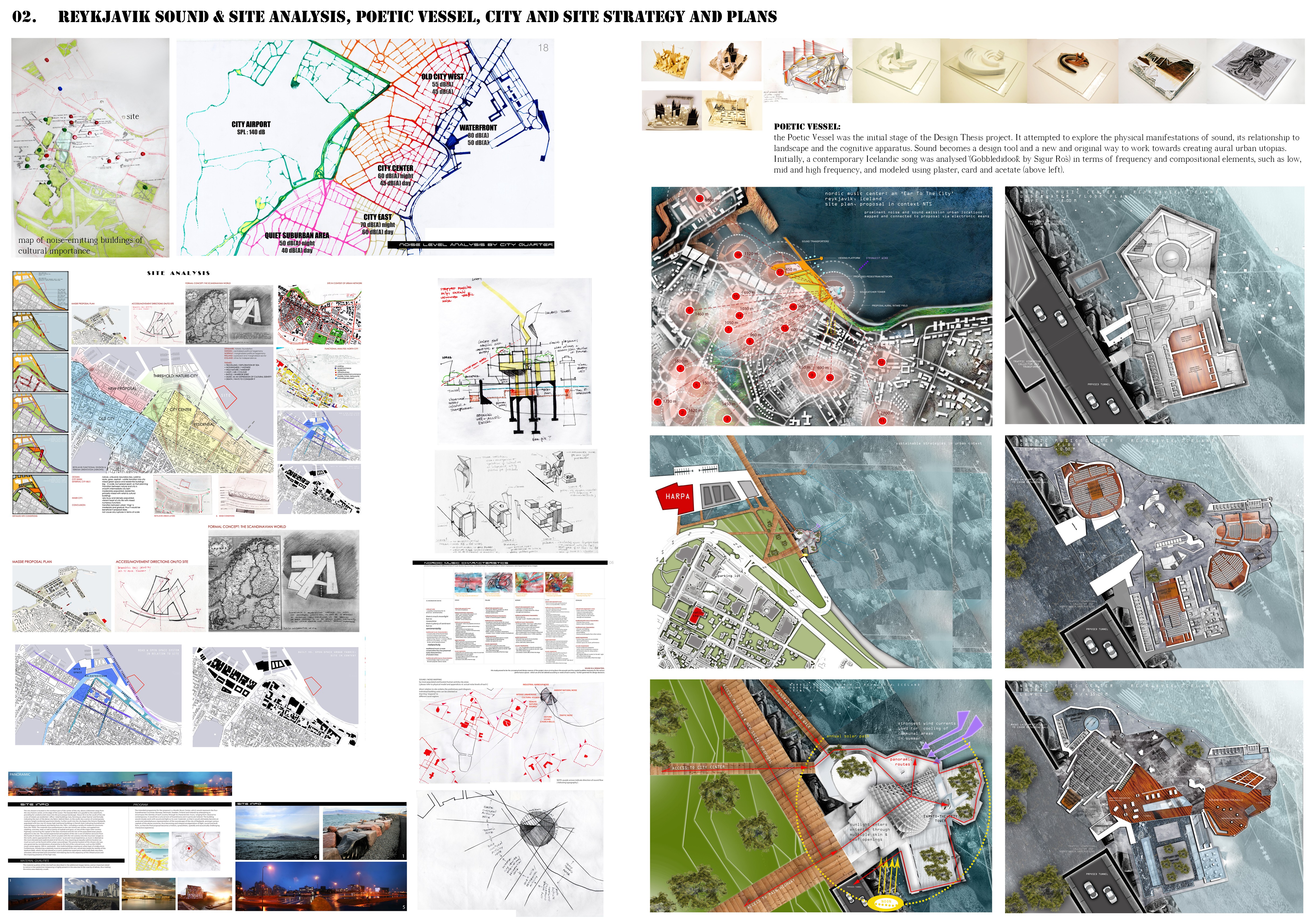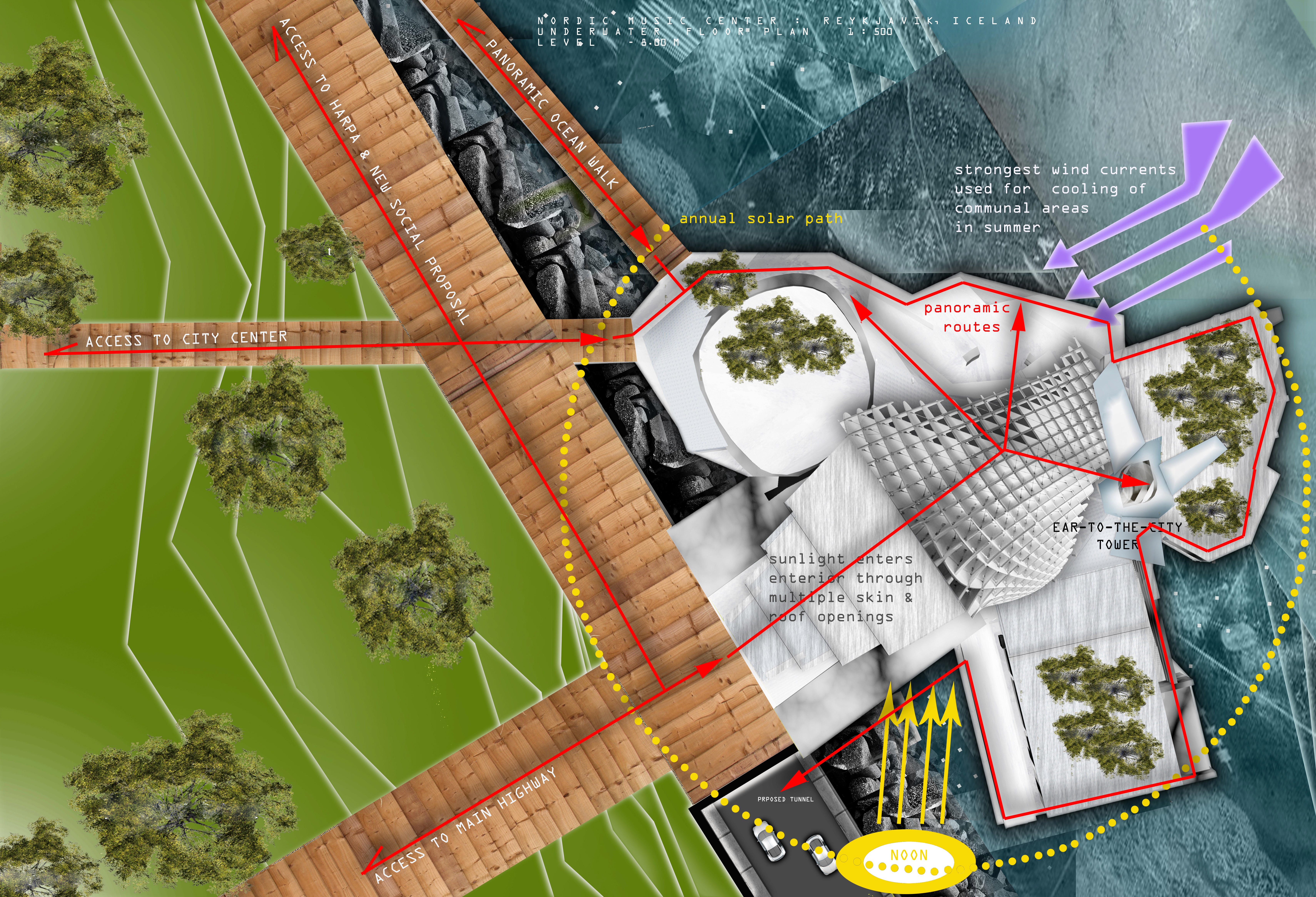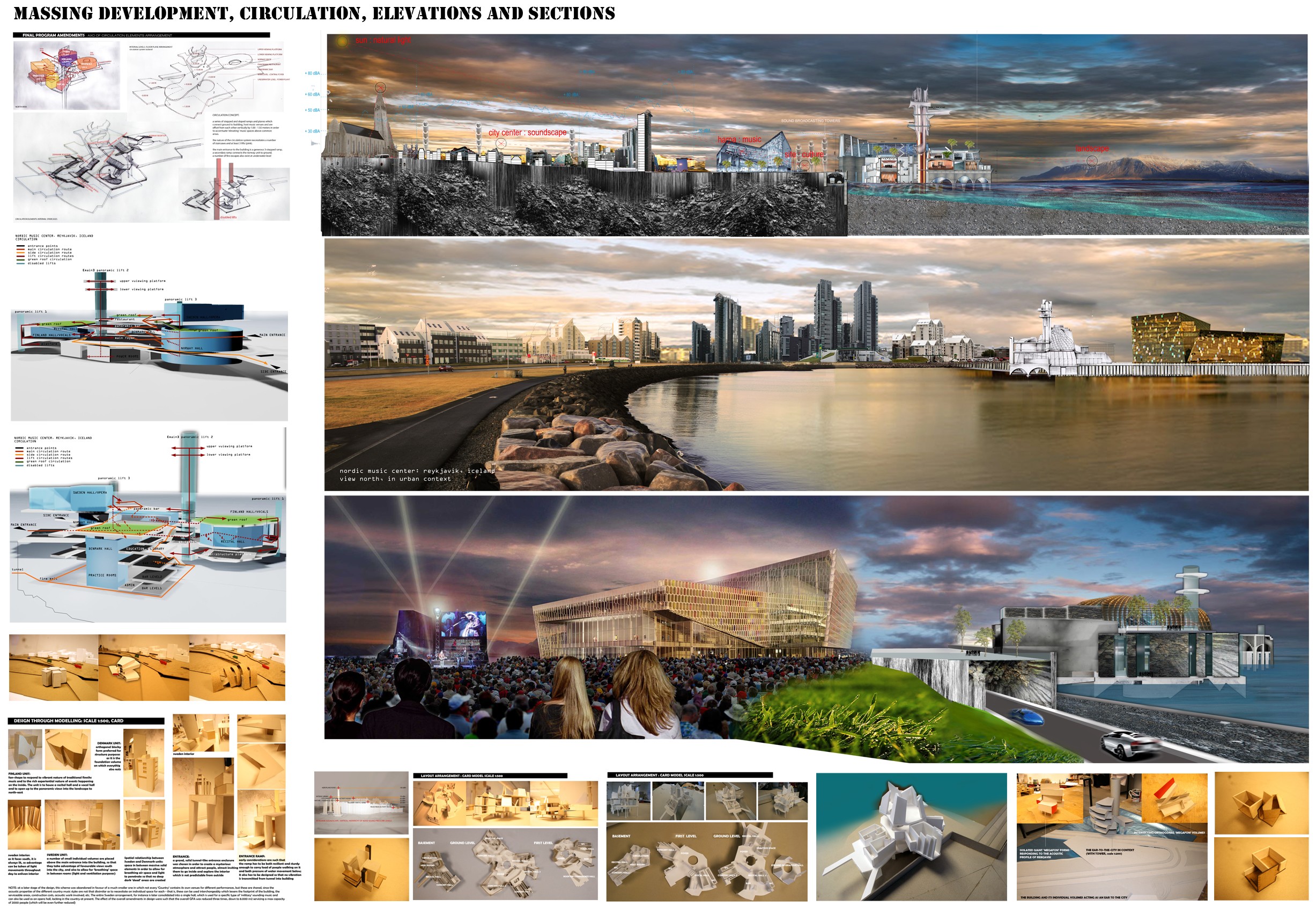 A Scandinavian music center based in the heart of Reykjavik. The project is a materialization of the detailed recording and analysis of the acoustic soundscape of Reykjavik. It consists of 5 music halls individually tailored in terms of form and acoustic properties to house experimental music from the 5 different countries of the Scandinavian world. Locally-sourced materials are preferred in light of sustainability and acoustic optimisation of sound of different pitch and frequencies. The building proposes the utilization of wind power and ocean power as it is located on the coast of the North Atlantic ocean, inclose proximity to the more traditional harpa music hall. It offers communal spaces with interactive audio-visual experiences and majestic views into the Icelandic ocean landscape. The building gathers sound from its environment as an Ambient Unifier.