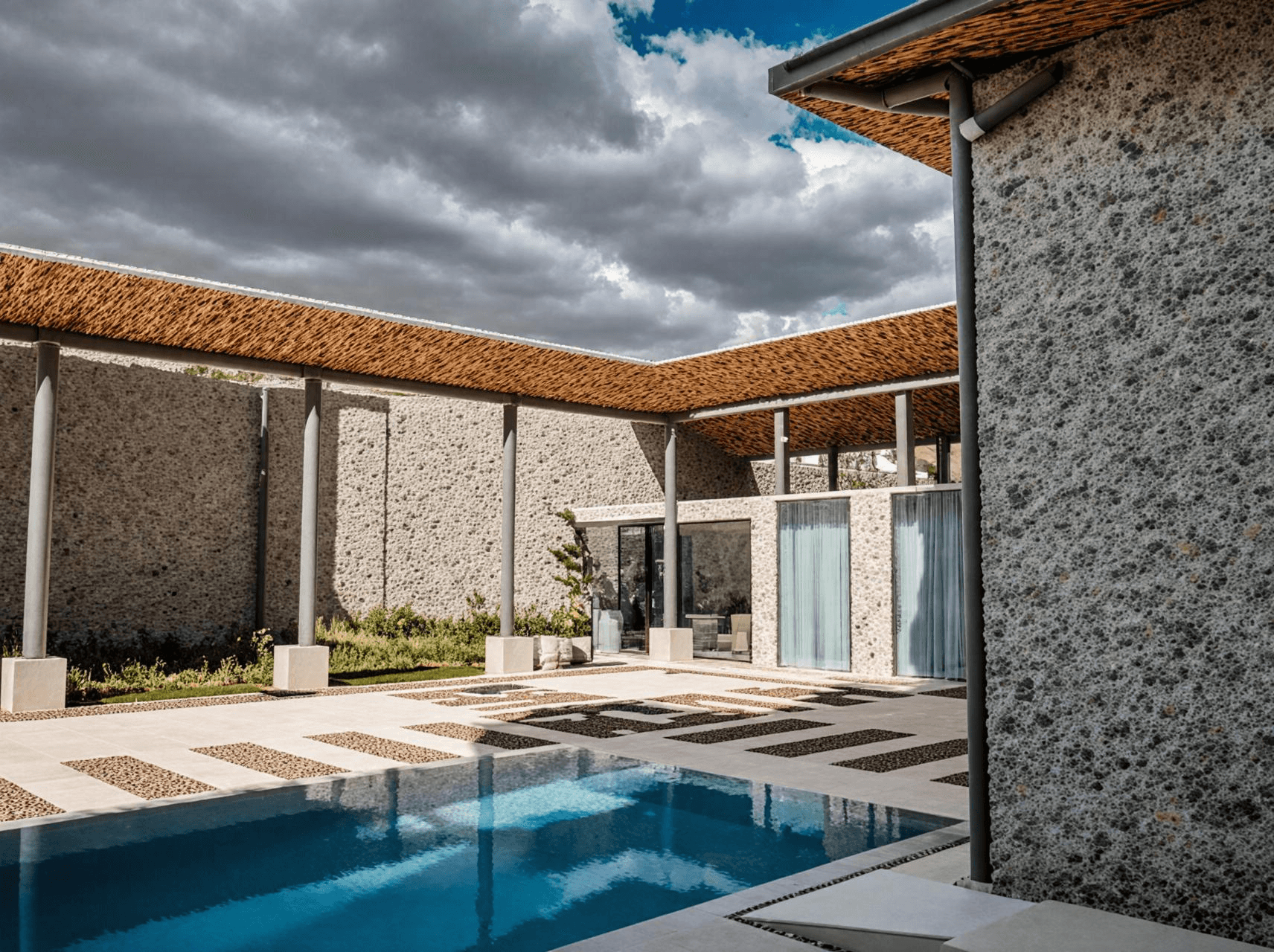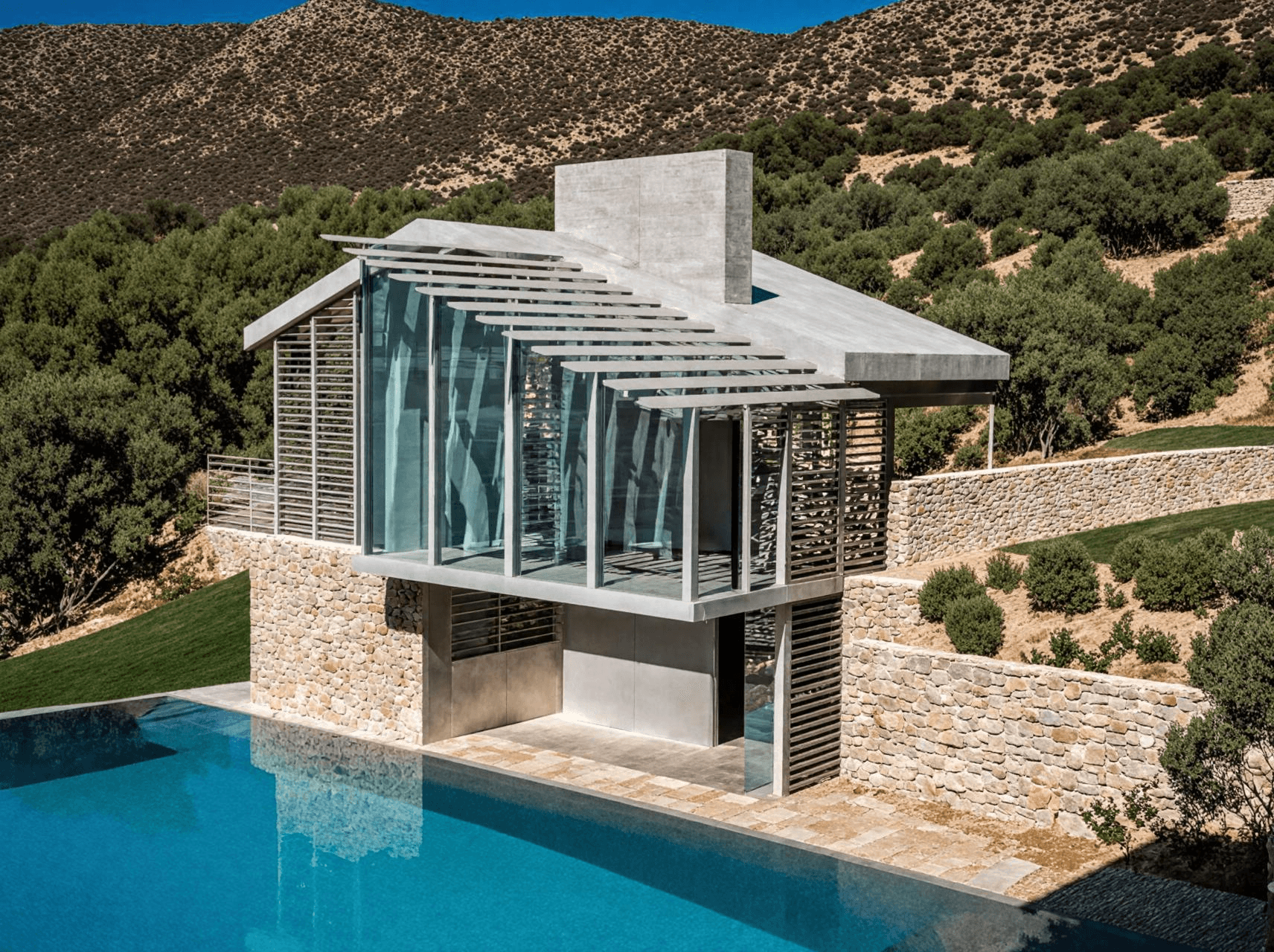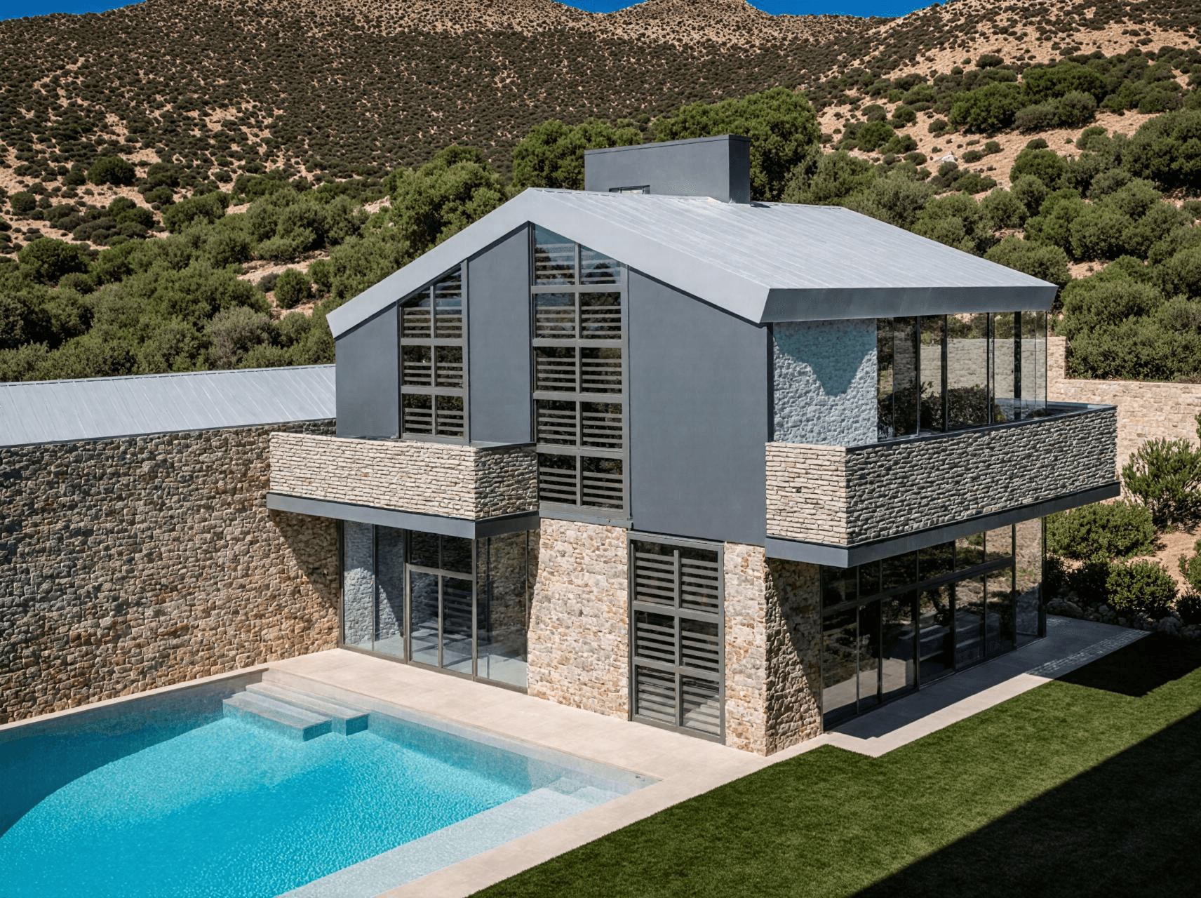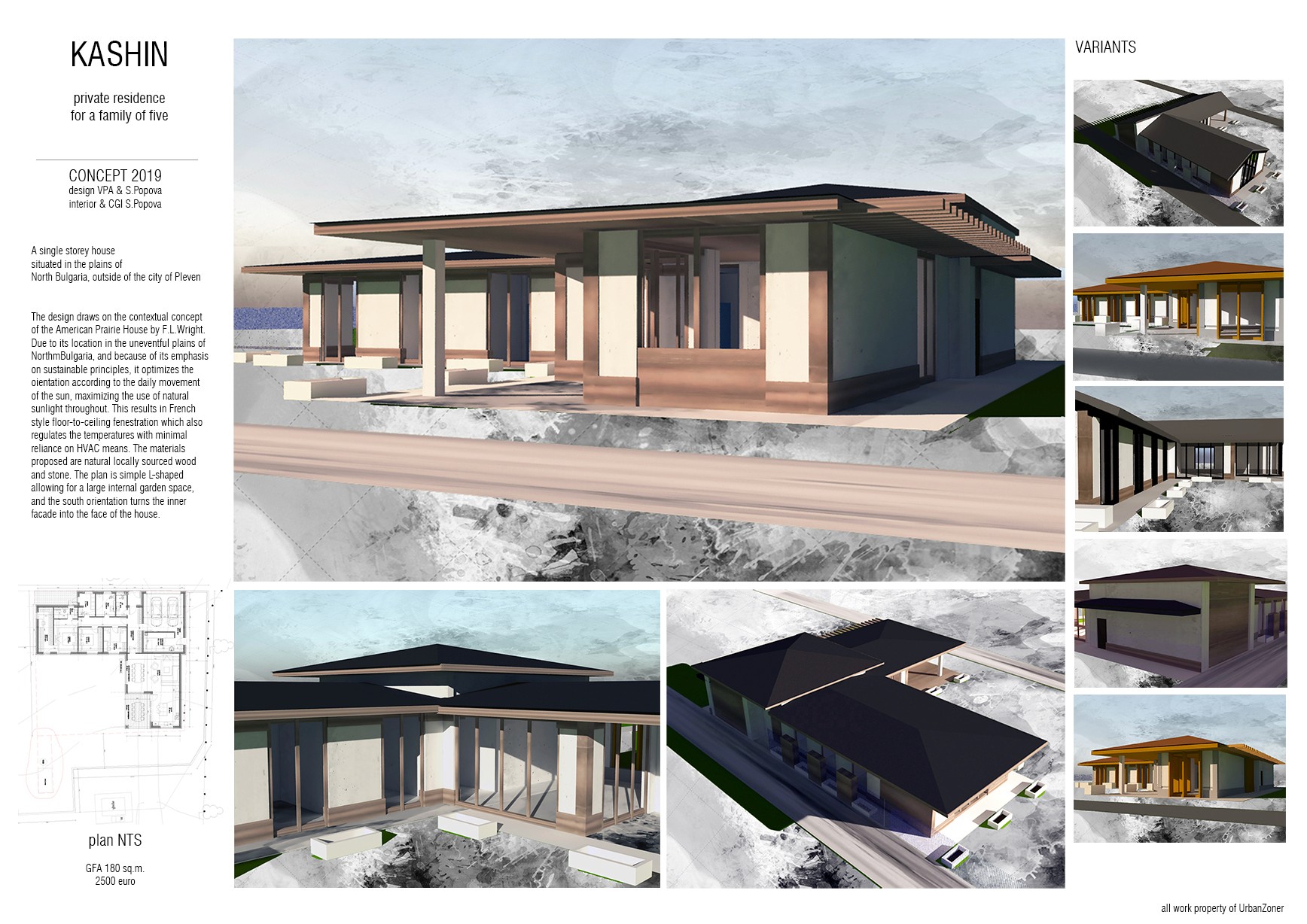 A family residence in North Bulgaria. The design is minimalist and consists of simple geometry, interlocking volumes and locally sourced eco materials, such as stone, pine and timber. The house is located in natural settings and takes into consideration views into the Central balkan mountain range.