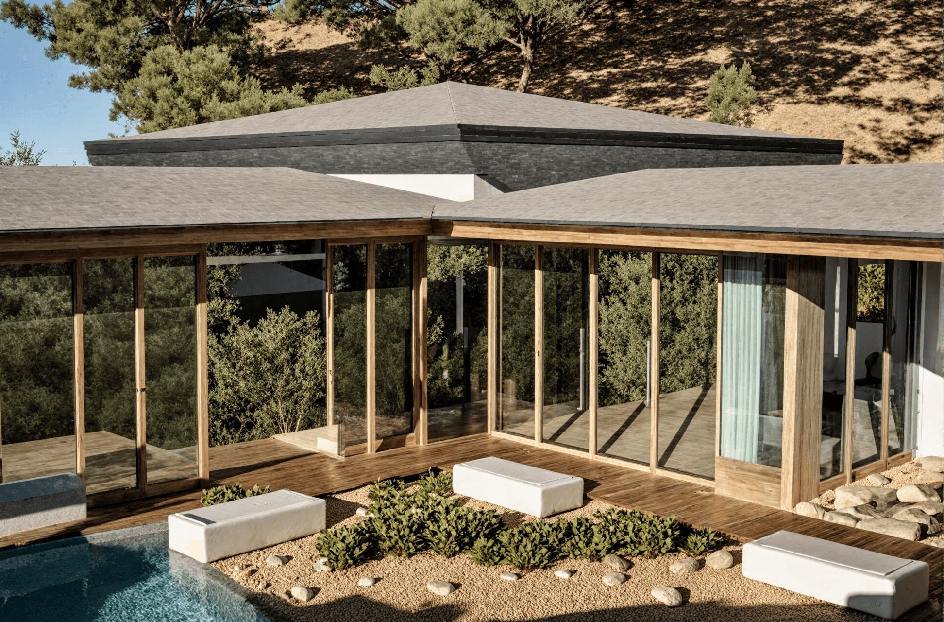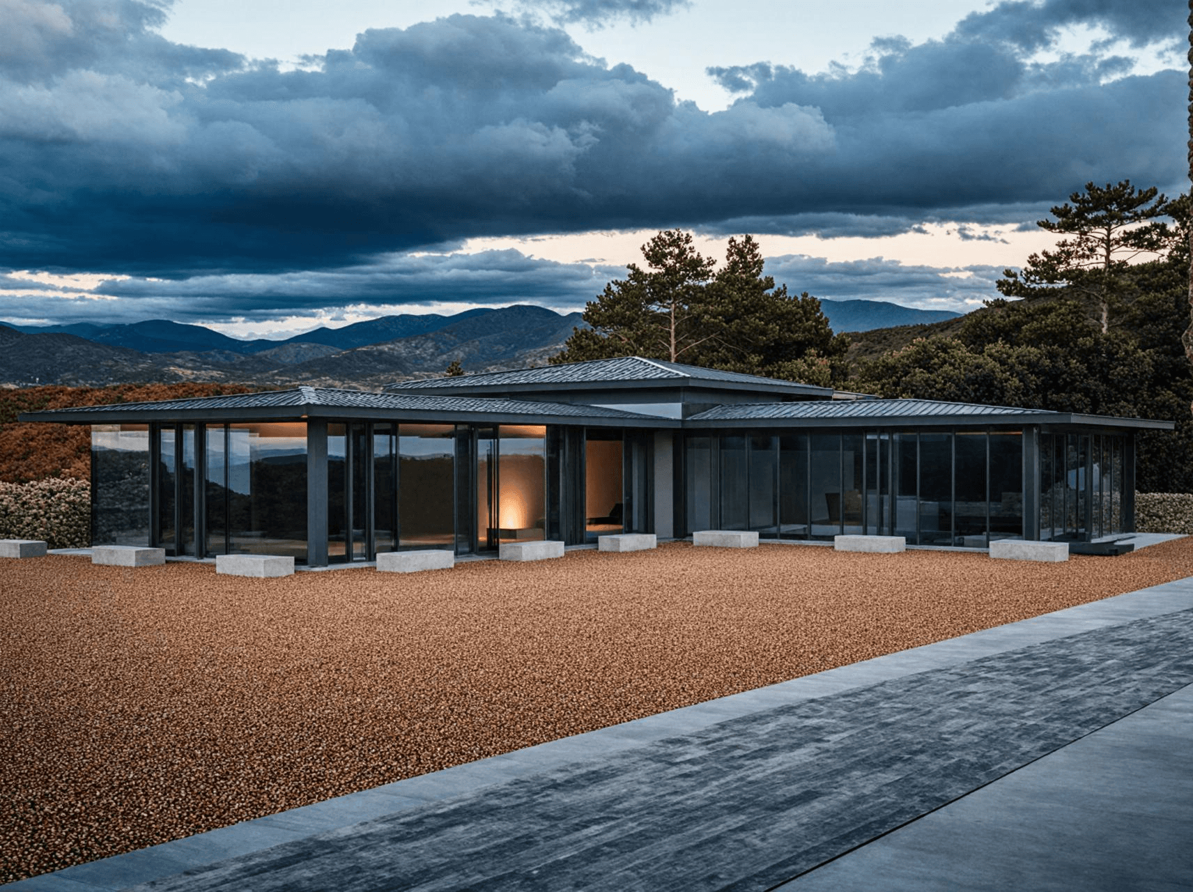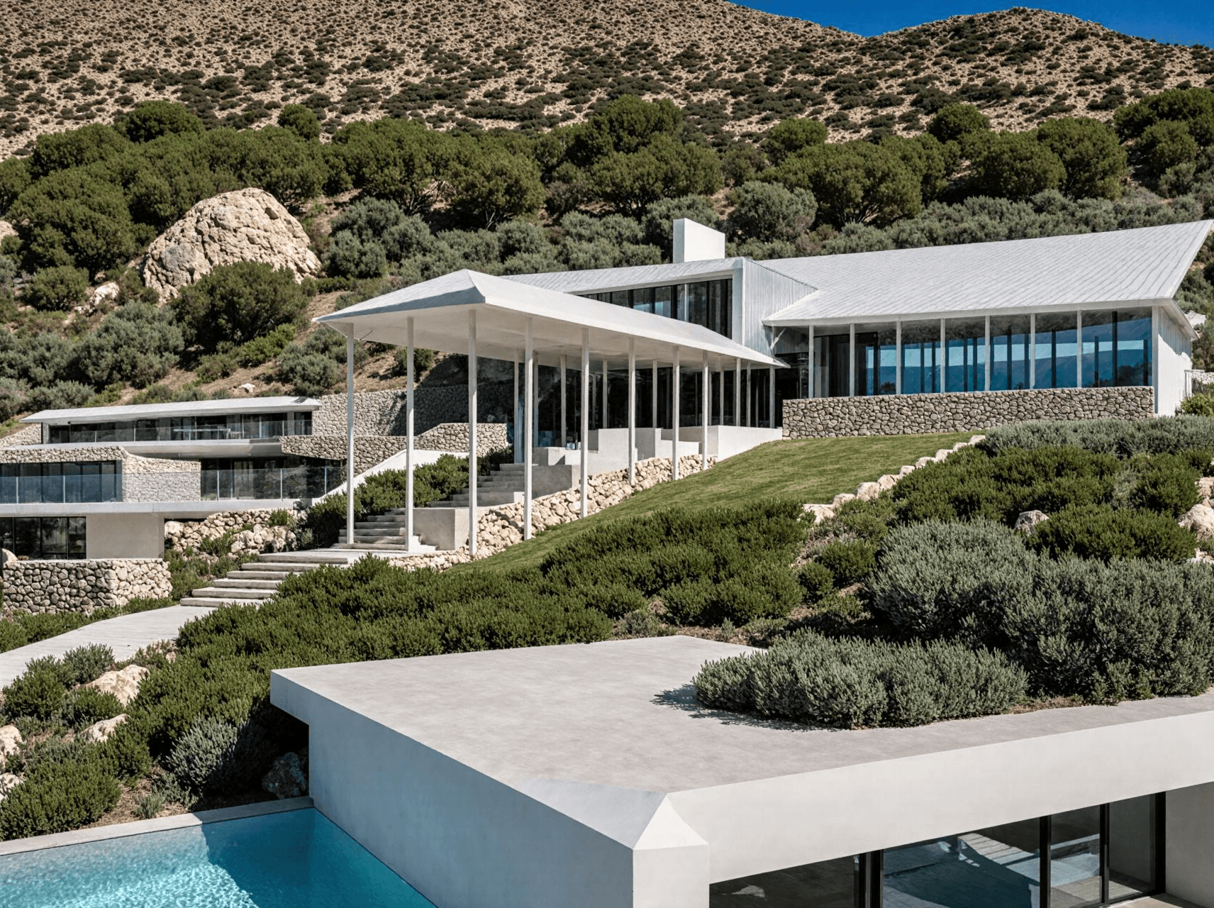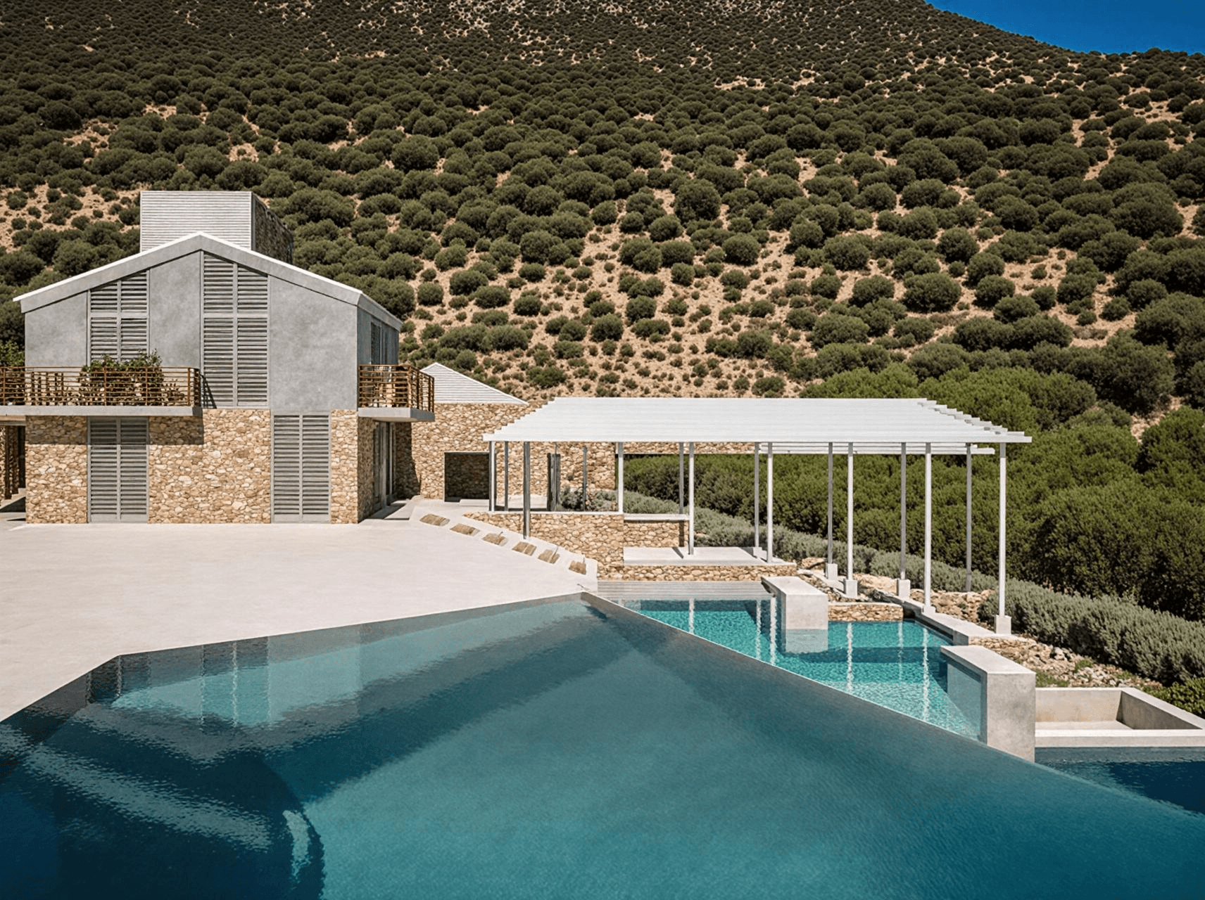 A family residence in North Bulgaria. The design is minimalist and consists of simple geometry, interlocking volumes and locally sourced eco materials, such as stone, pine and timber. The house is located in natural settings and takes into consideration views into the Central balkan mountain range.