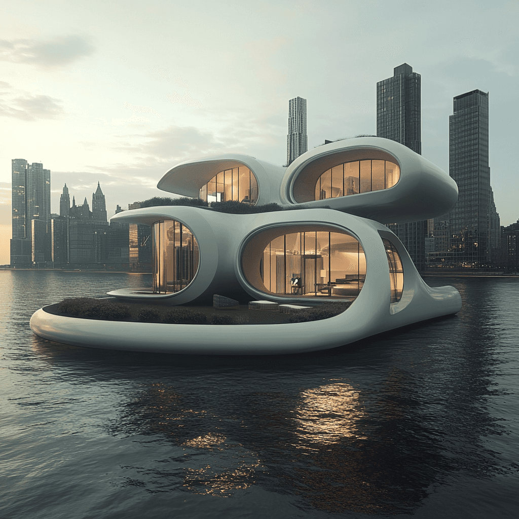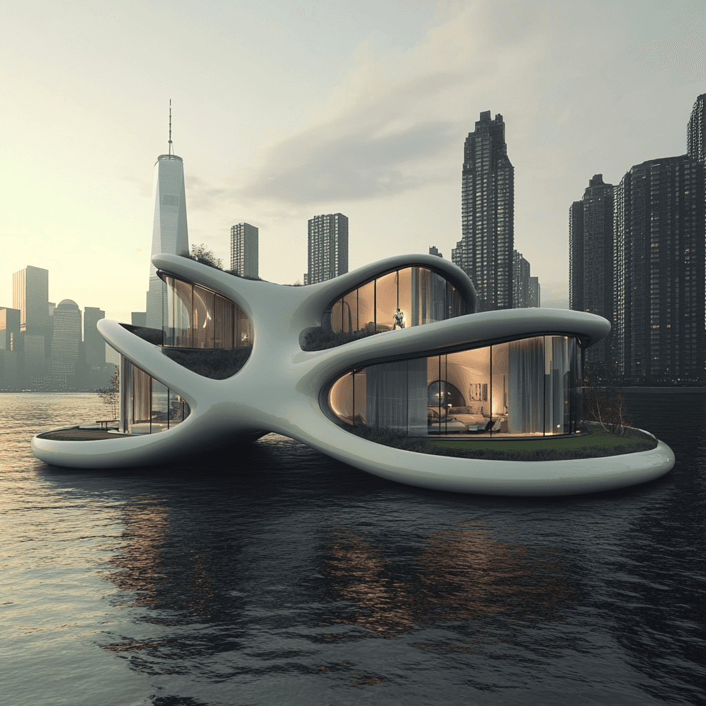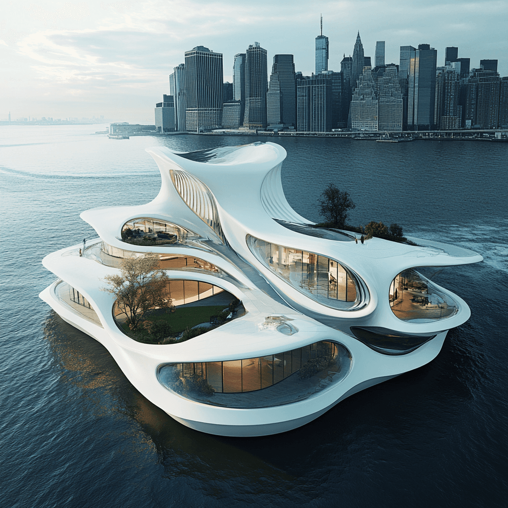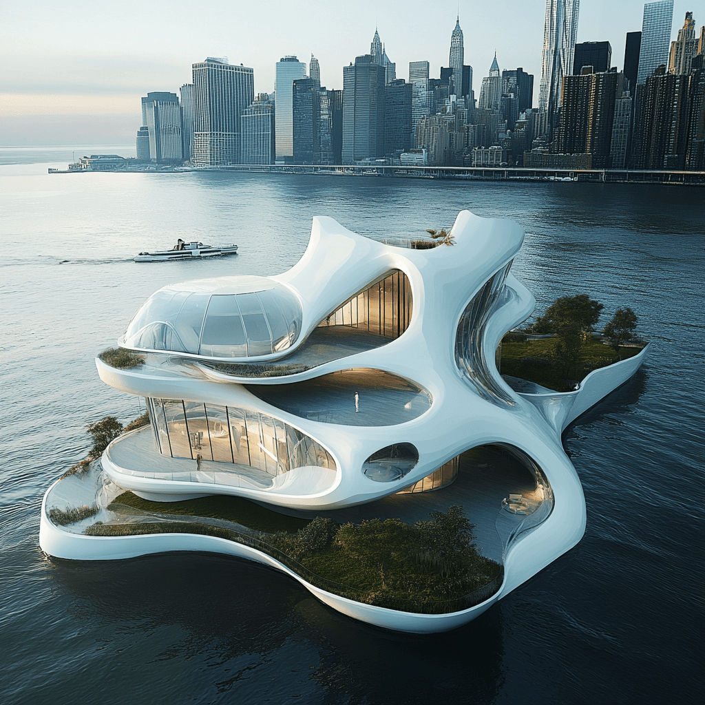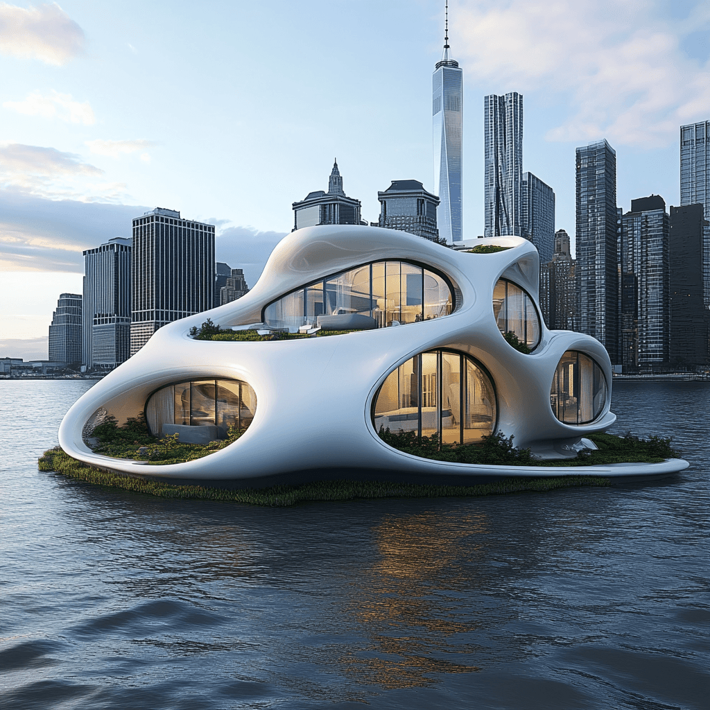 Floating houses built on water in harbors near existing metropolises. This series explores the NYC harbor and various organic-form residences. Despite their idiosyncratic shapes, they have the potential to be modularised and make a positive step towards solving the overpopulation housing crisis in New York - and the realistic threat of the rising manhattan floodline.