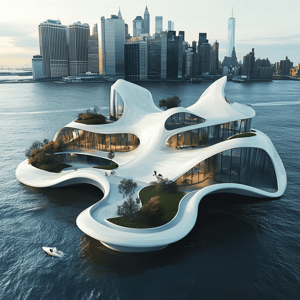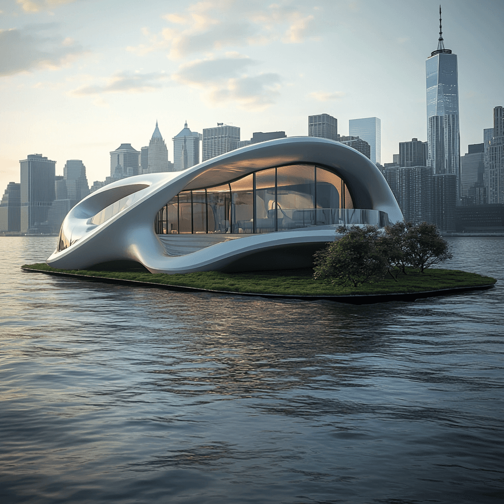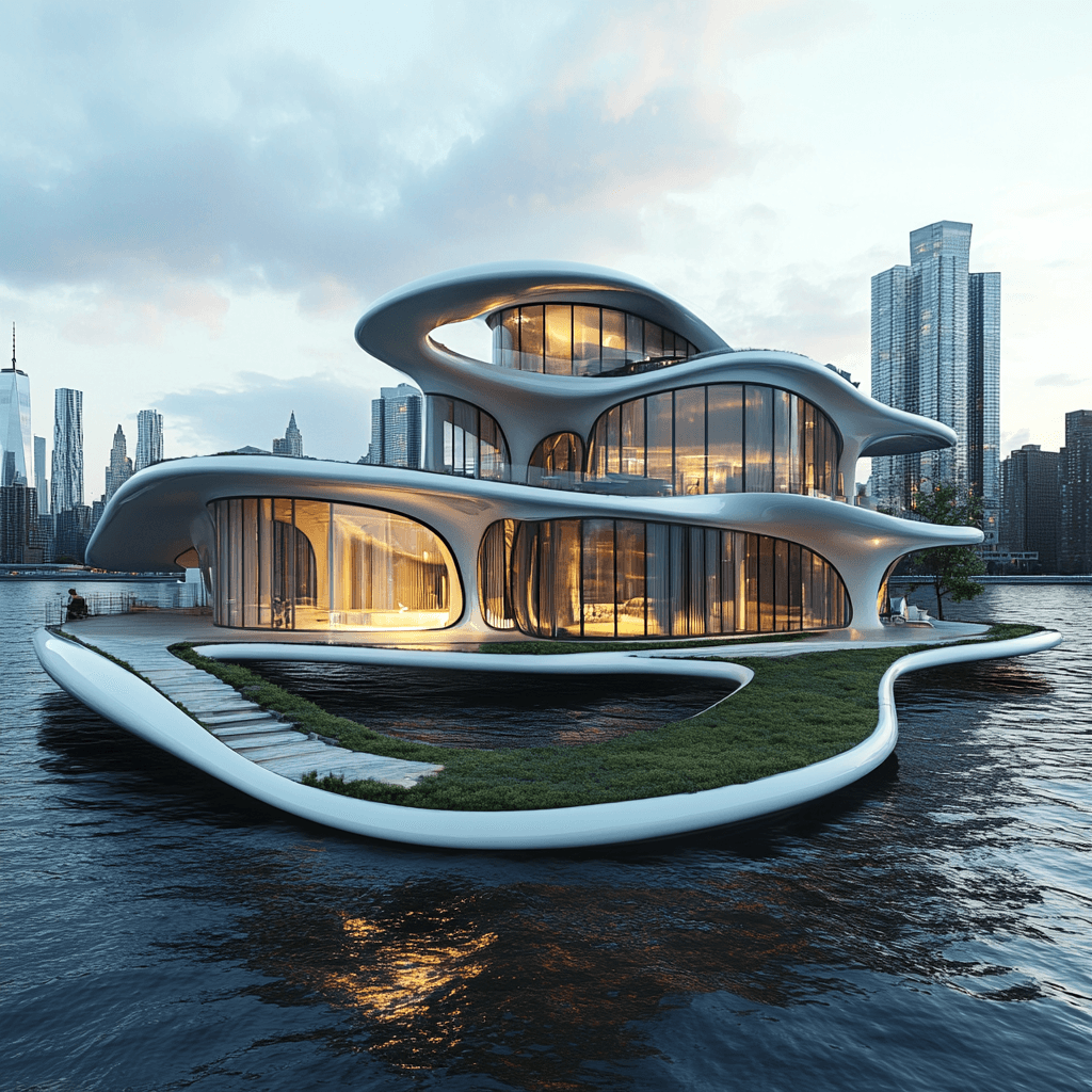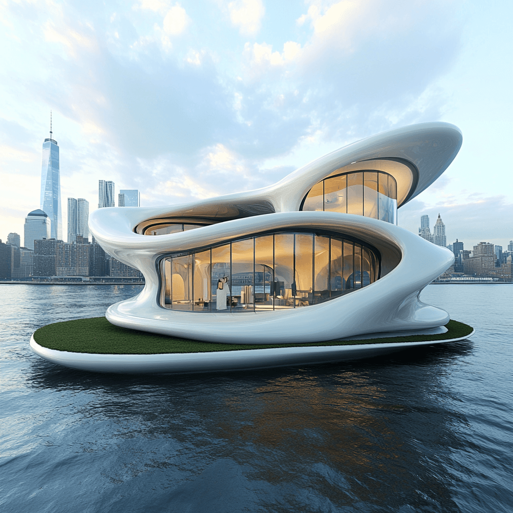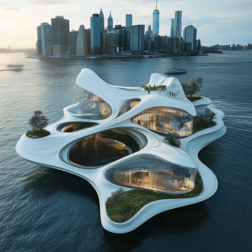 Floating houses built on water in harbors near existing metropolises. This series explores the NYC harbor and various organic-form residences. Despite their idiosyncratic shapes, they have the potential to be modularised and make a positive step towards solving the overpopulation housing crisis in New York - and the realistic threat of the rising manhattan floodline.