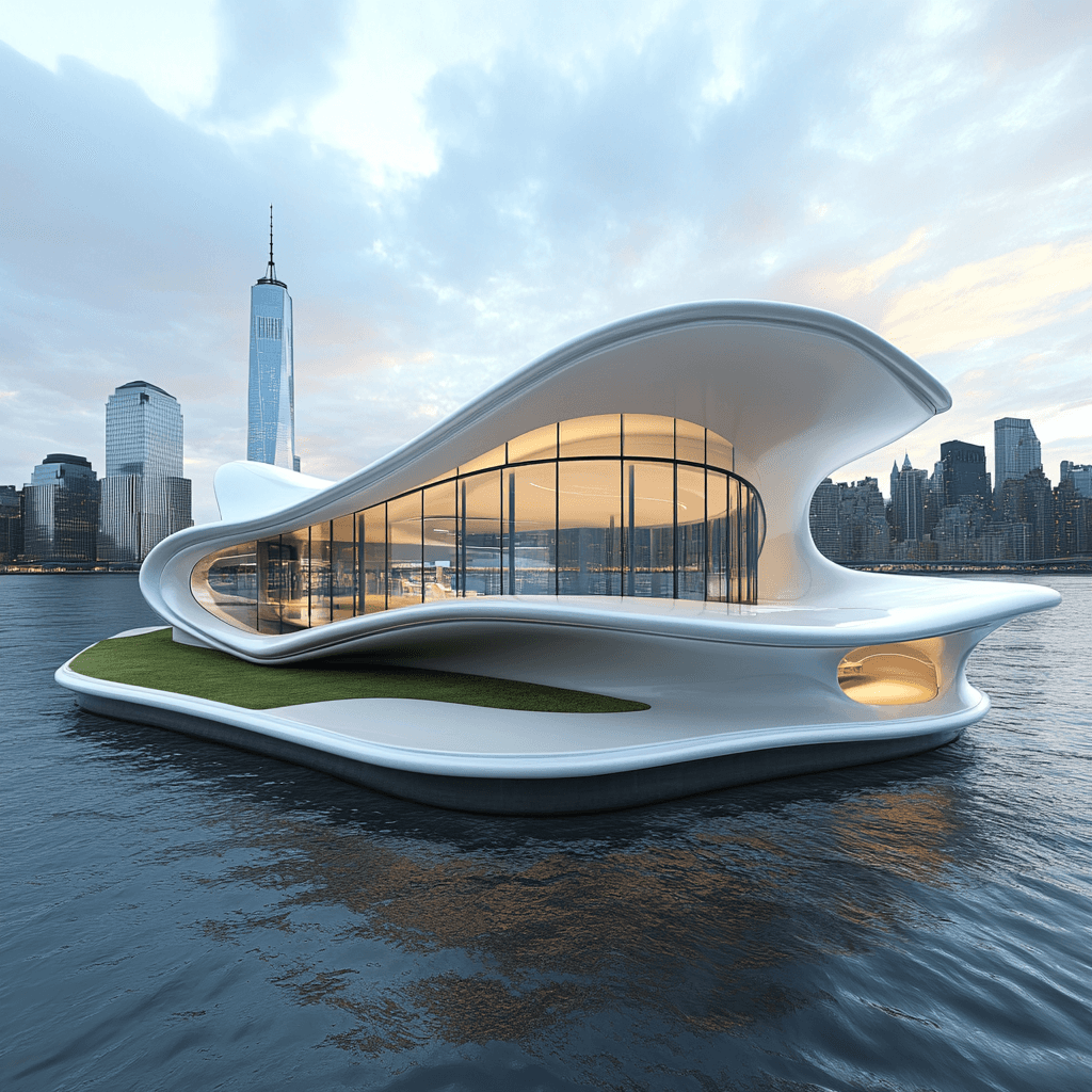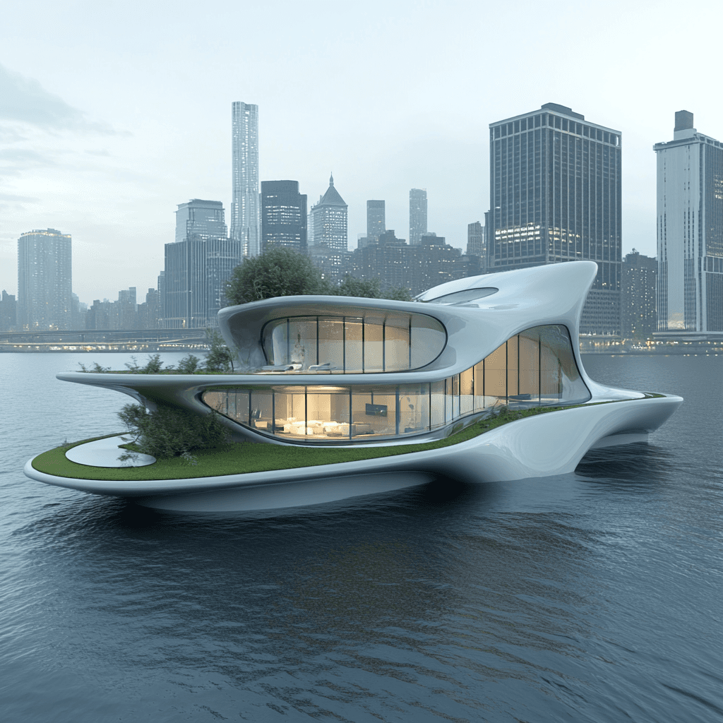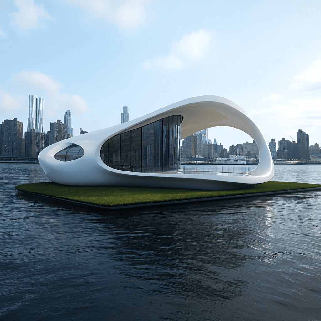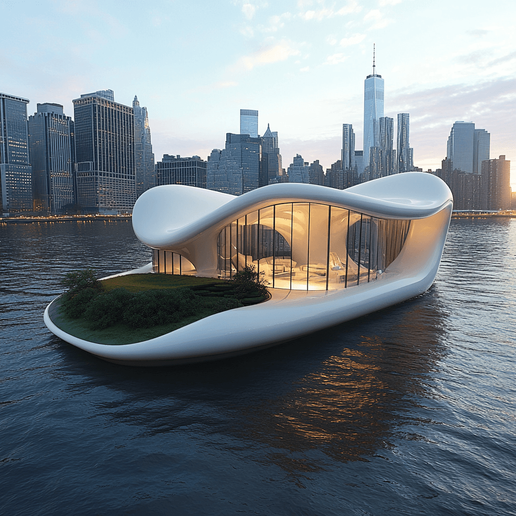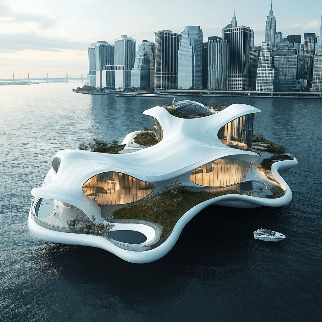 Floating houses built on water in harbors near existing metropolises. This series explores the NYC harbor and various organic-form residences. Despite their idiosyncratic shapes, they have the potential to be modularised and make a positive step towards solving the overpopulation housing crisis in New York - and the realistic threat of the rising manhattan floodline.