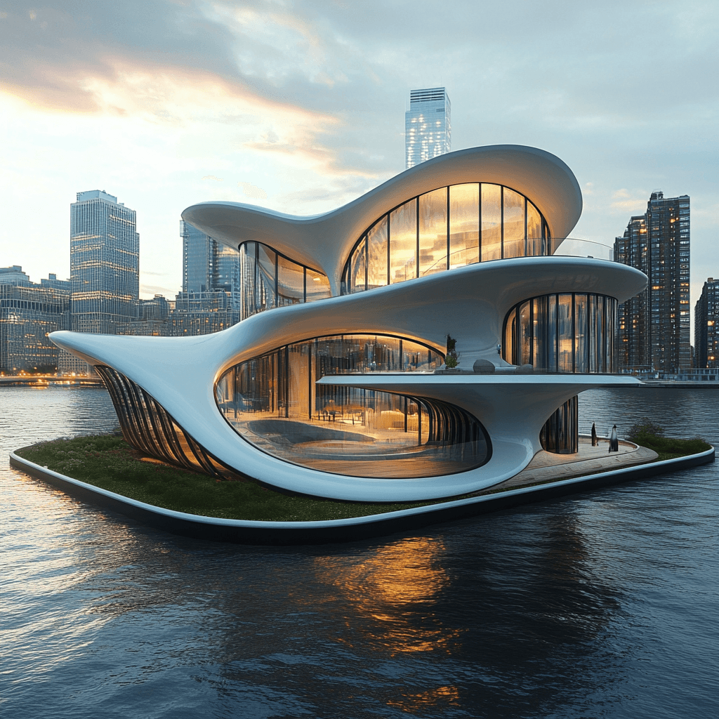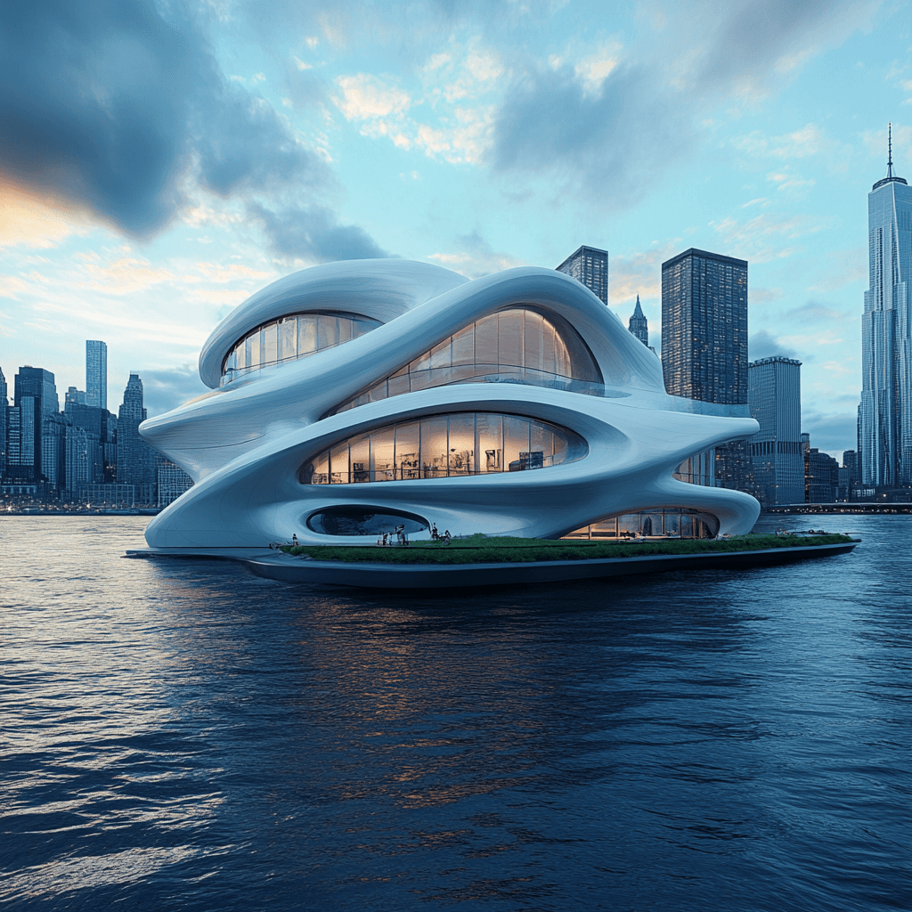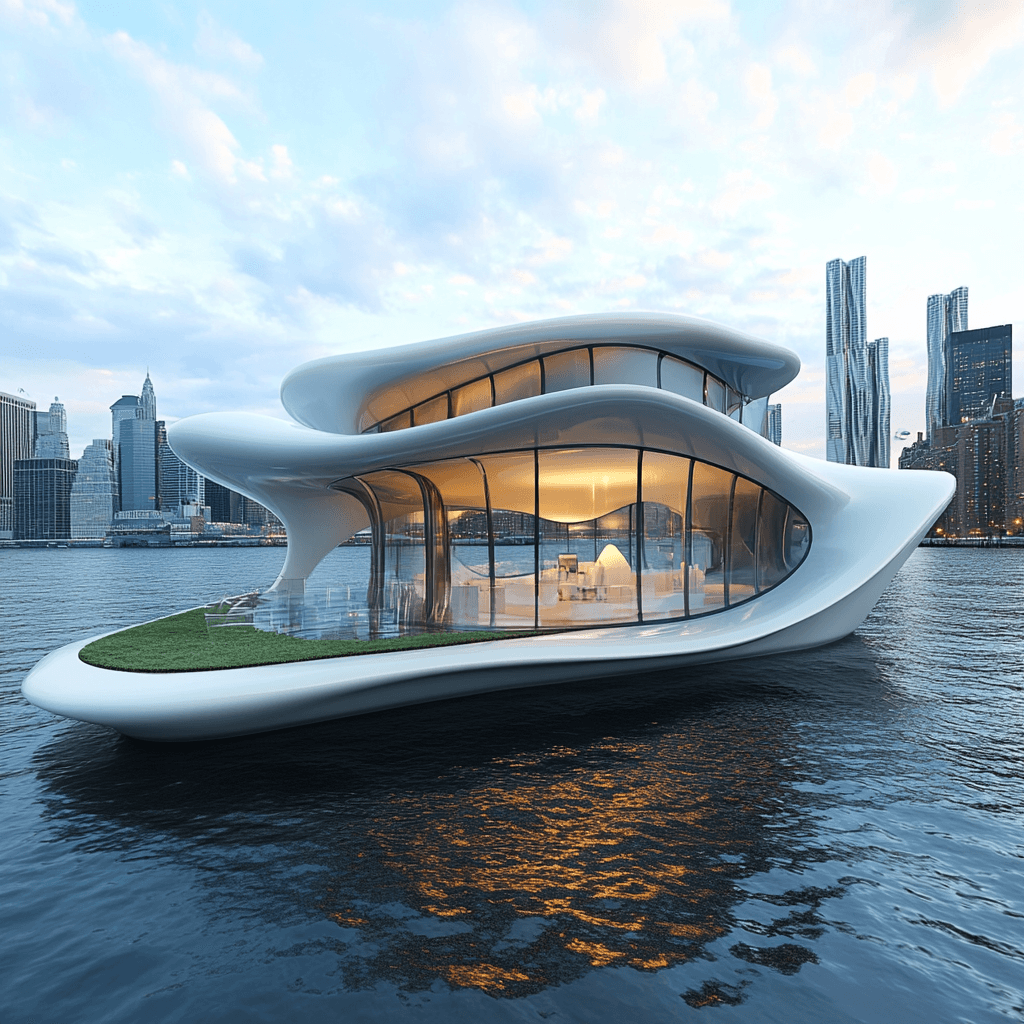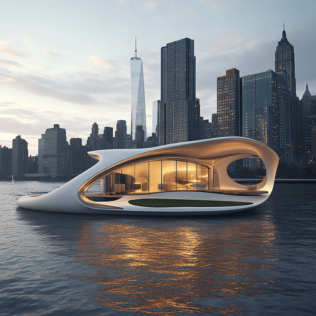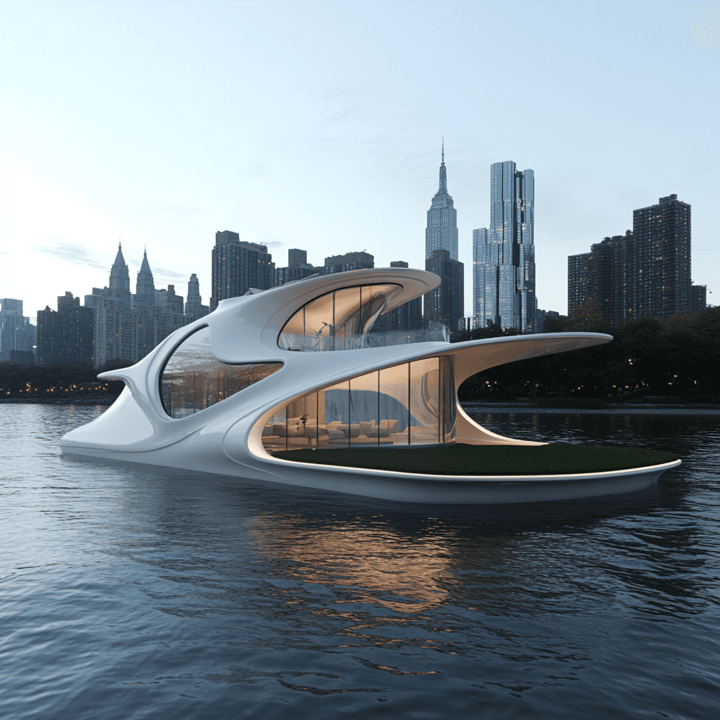 Floating houses built on water in harbors near existing metropolises. This series explores the NYC harbor and various organic-form residences. Despite their idiosyncratic shapes, they have the potential to be modularised and make a positive step towards solving the overpopulation housing crisis in New York - and the realistic threat of the rising manhattan floodline.