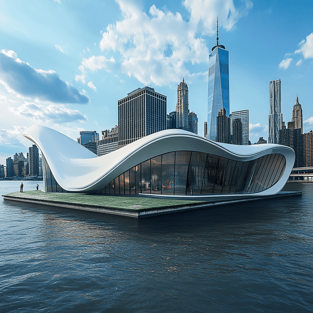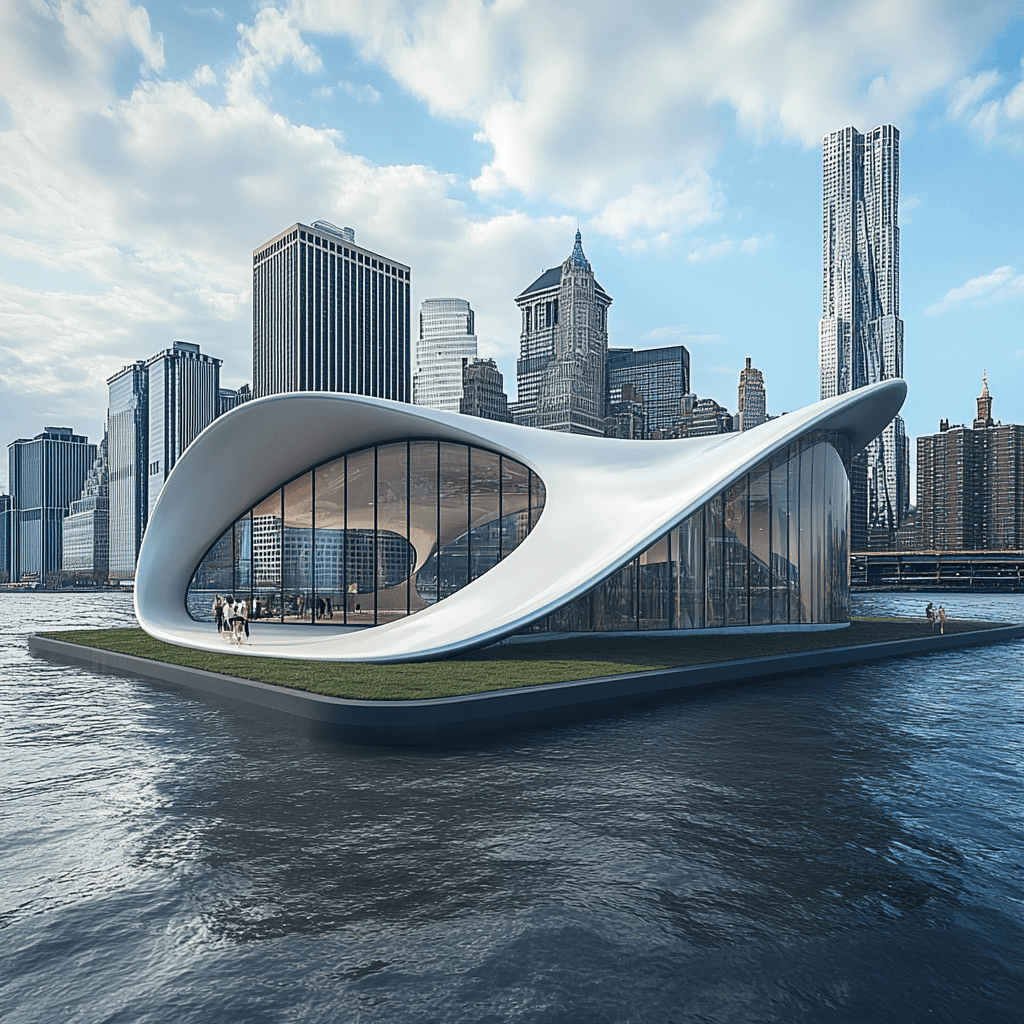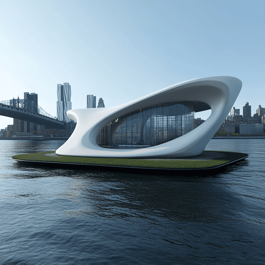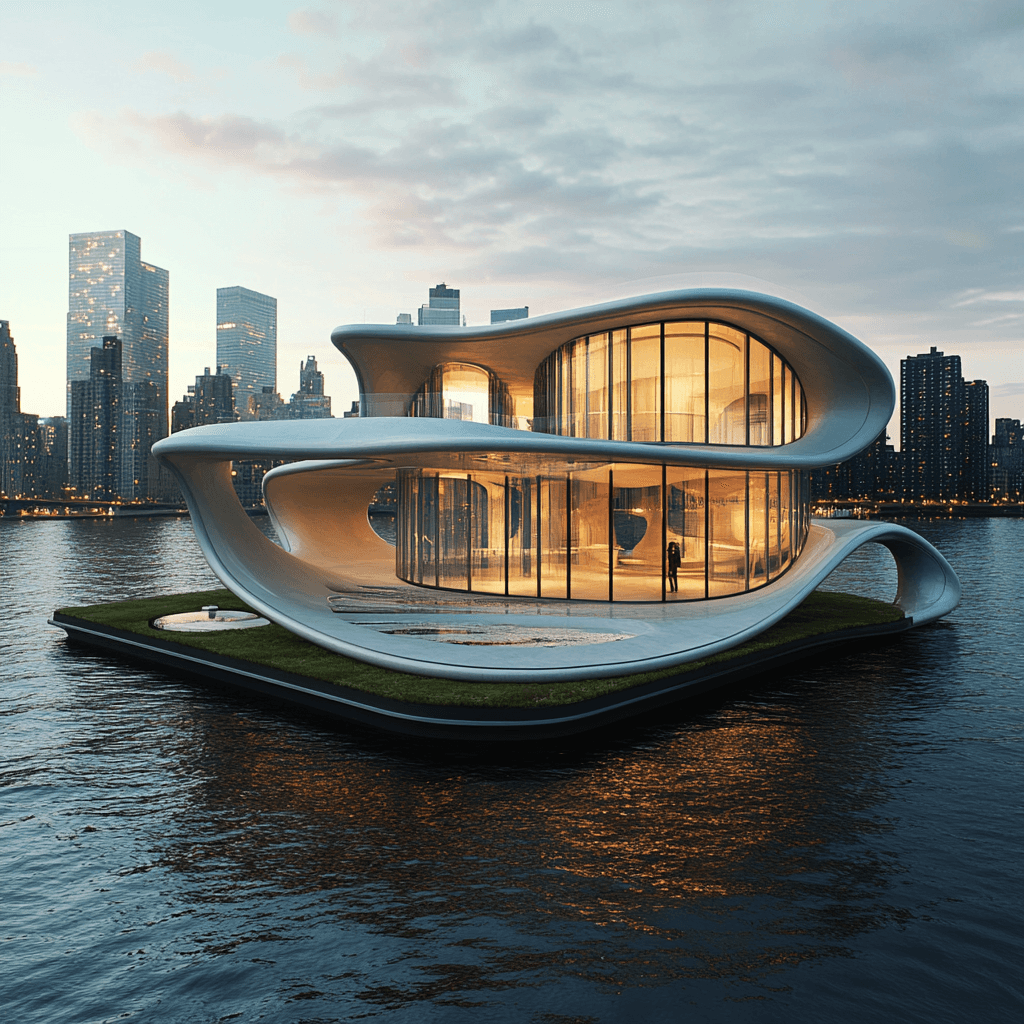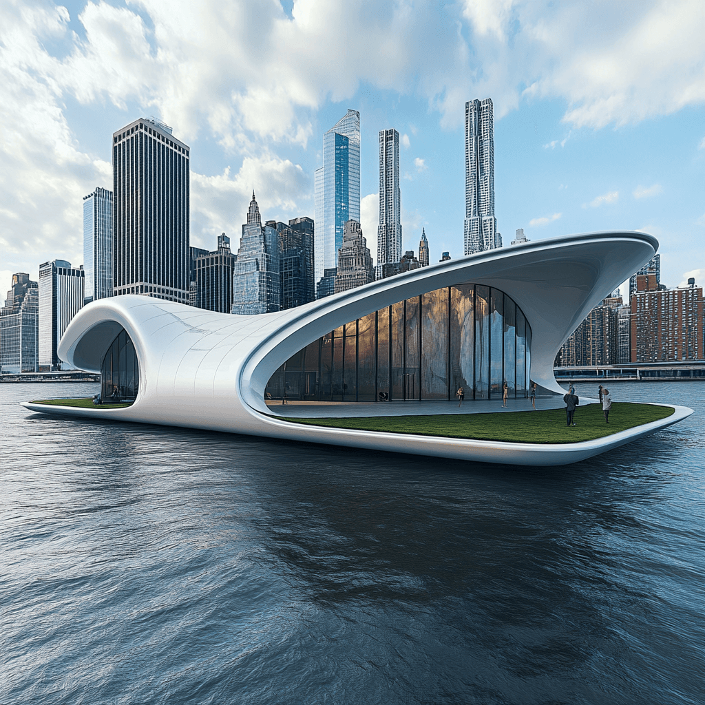 Floating houses built on water in harbors near existing metropolises. This series explores the NYC harbor and various organic-form residences. Despite their idiosyncratic shapes, they have the potential to be modularised and make a positive step towards solving the overpopulation housing crisis in New York - and the realistic threat of the rising manhattan floodline.