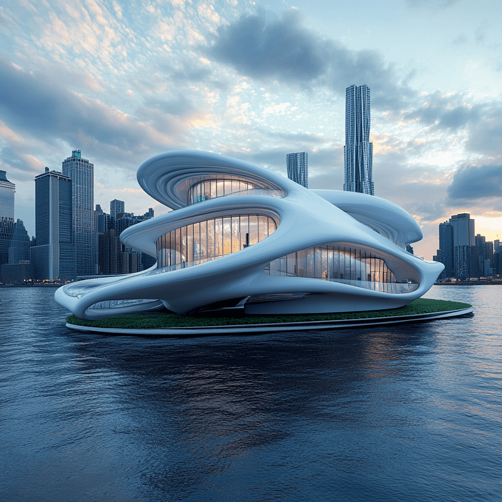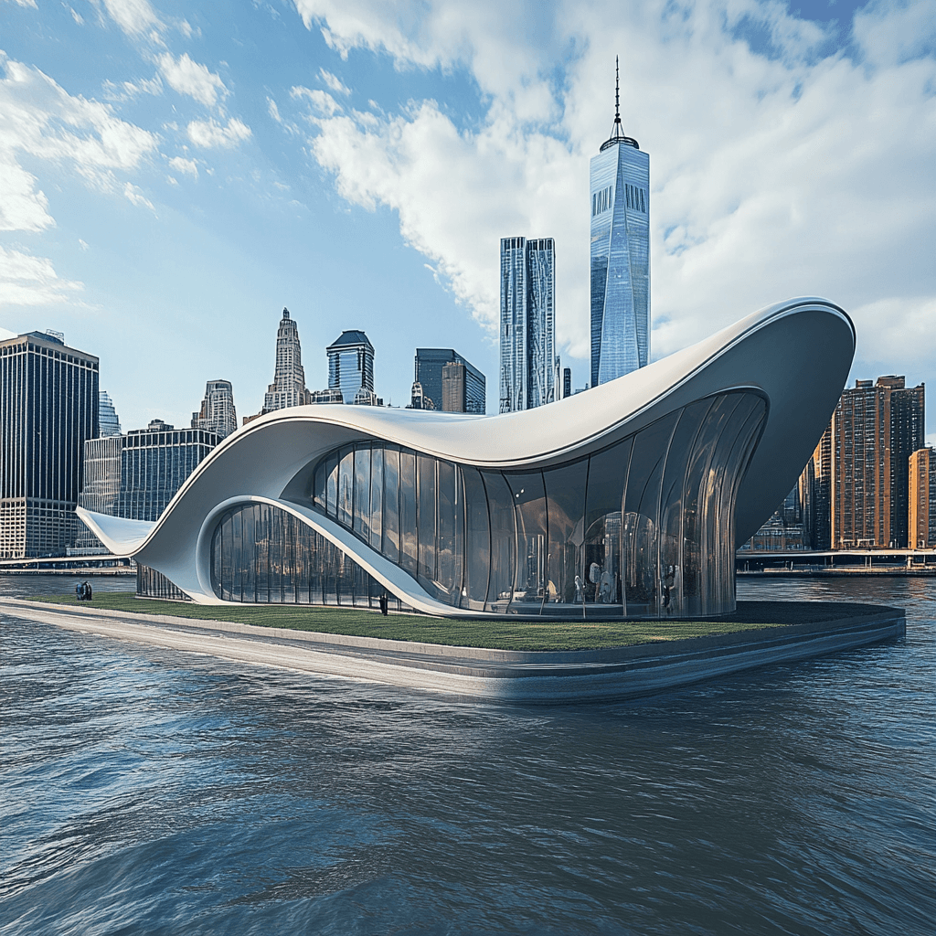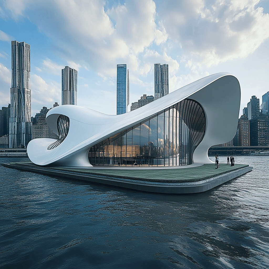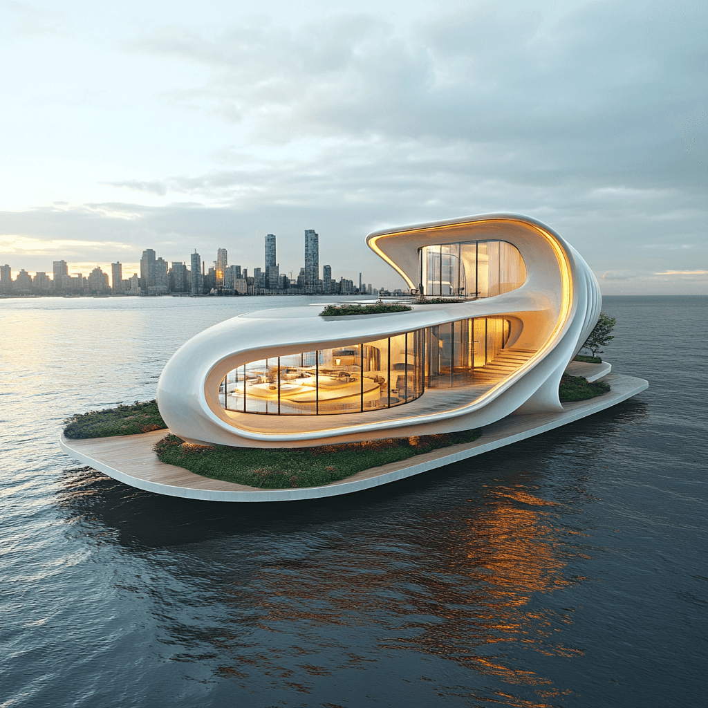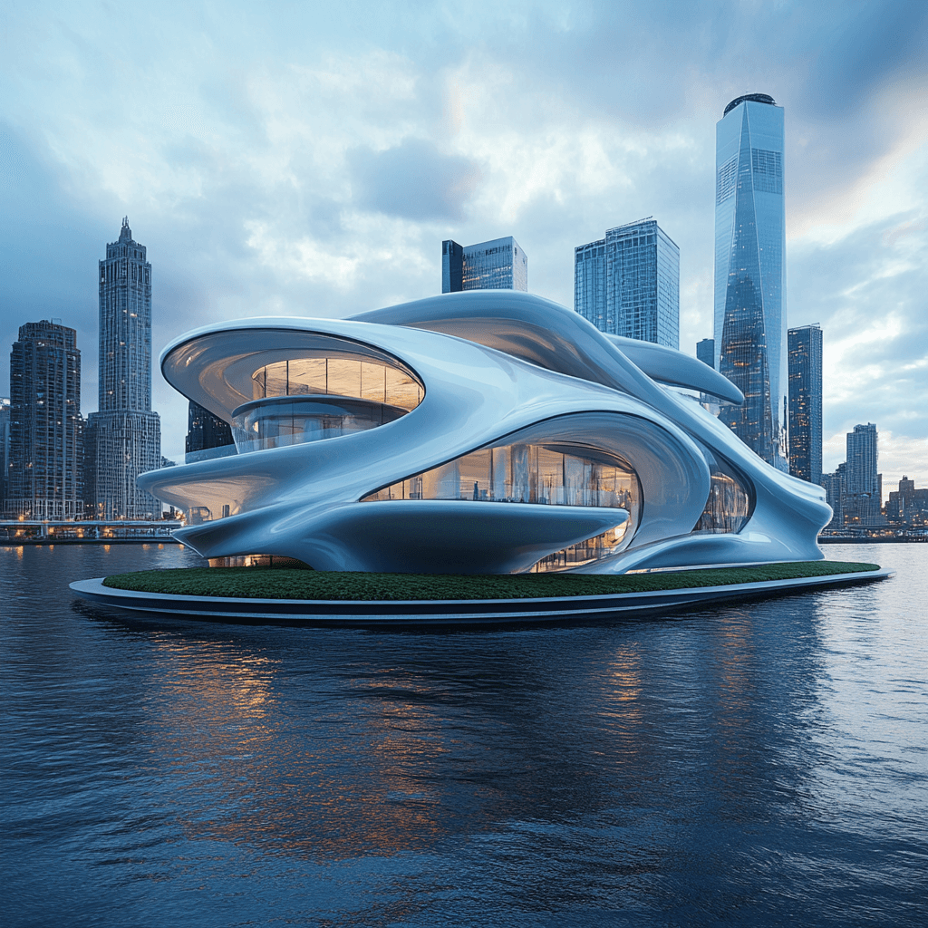 Floating houses built on water in harbors near existing metropolises. This series explores the NYC harbor and various organic-form residences. Despite their idiosyncratic shapes, they have the potential to be modularised and make a positive step towards solving the overpopulation housing crisis in New York - and the realistic threat of the rising manhattan floodline.