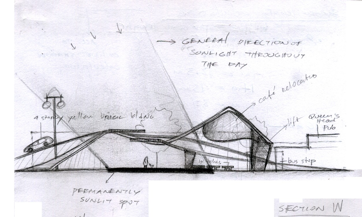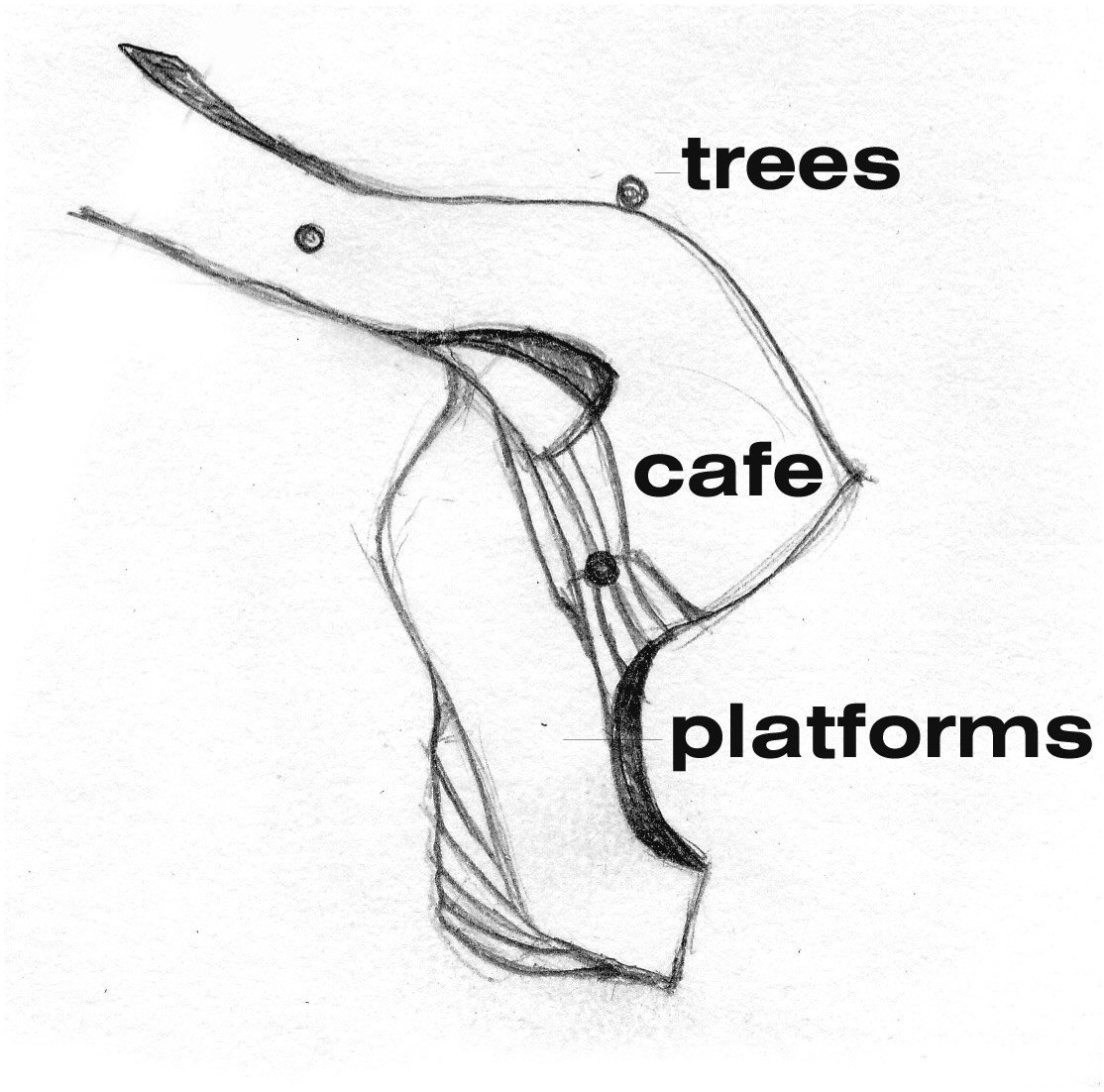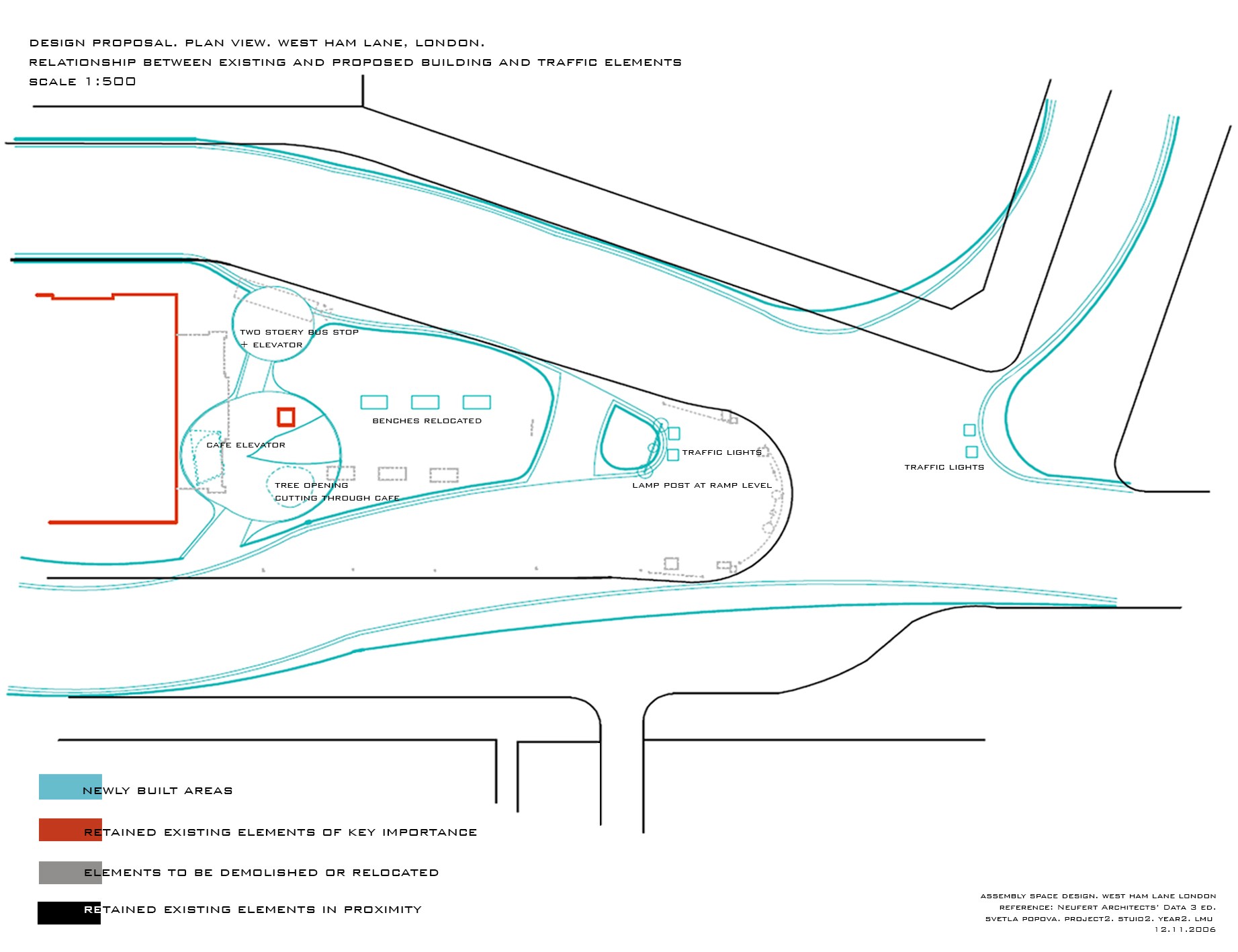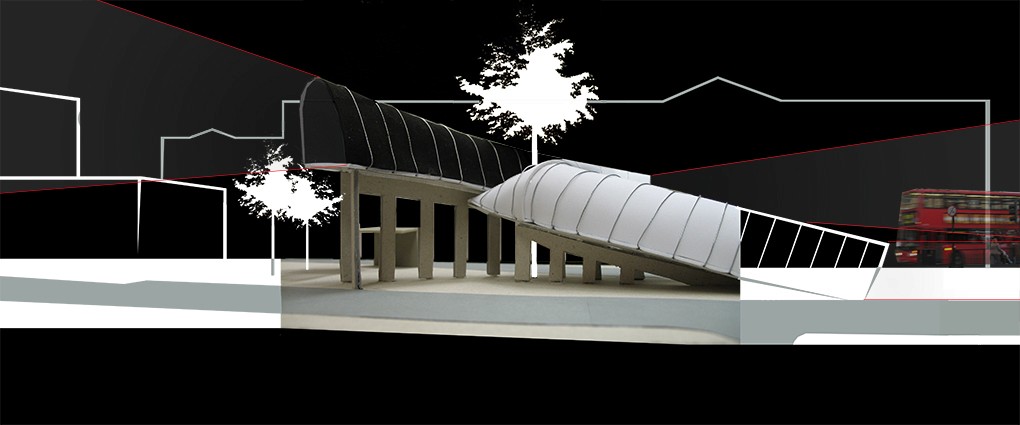 A freestanding elevated cafe on Golbourne Road, London. The cafe is placed on pillars and accessile via various ramps, thus not interfering with the road traffic below, and allowing for city views.