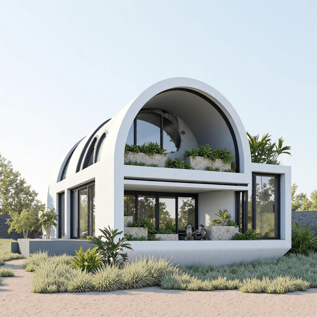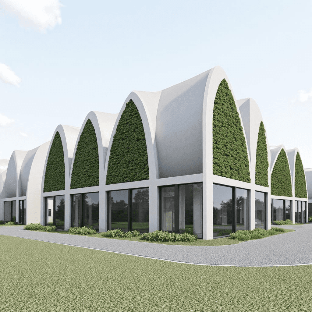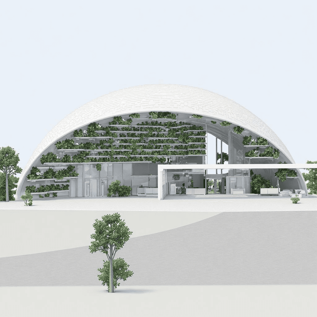 Small scale family homes. Vault shaped and hemispherical volumetric arrangements. The houses integrate vertical urban farms in the interior and the facades.