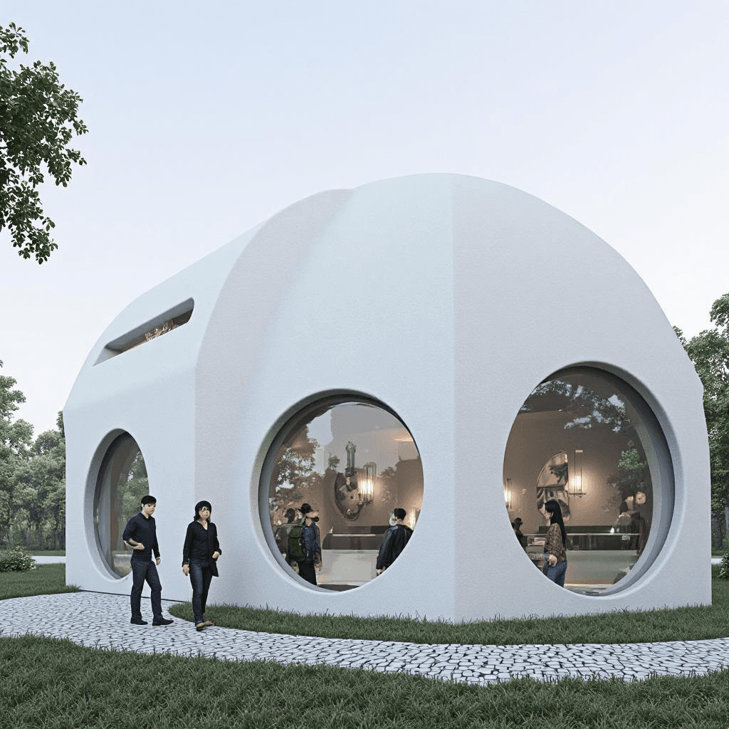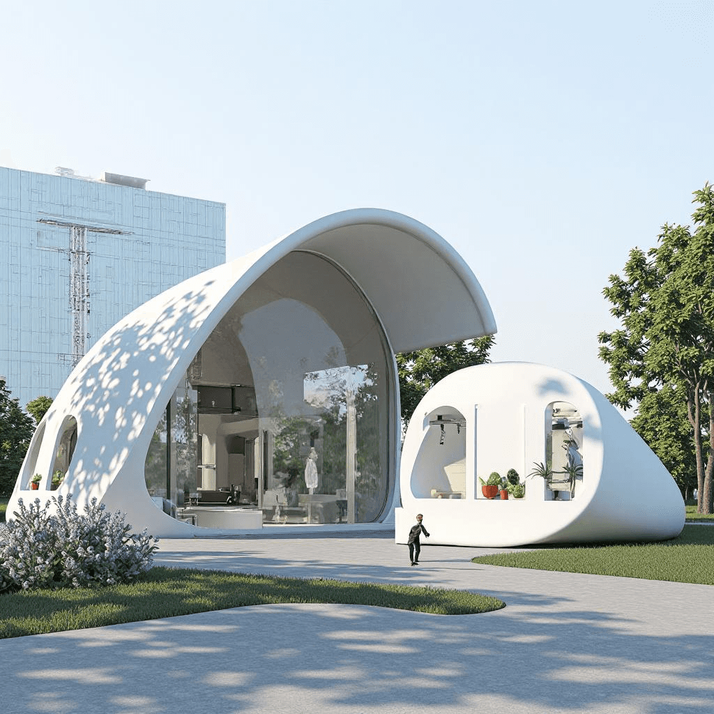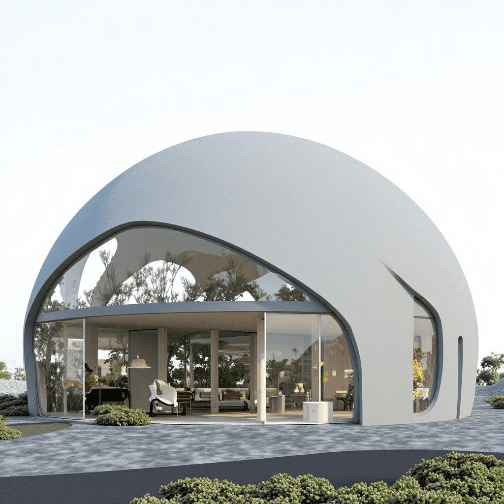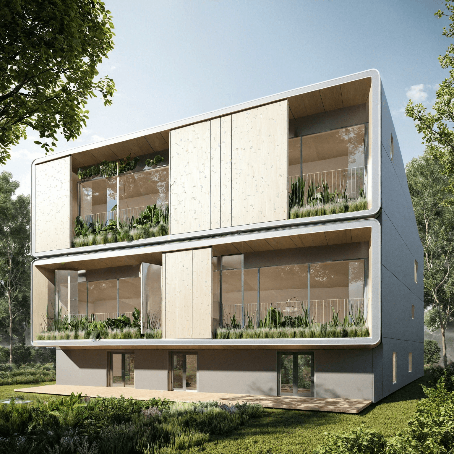 Small scale family homes. Vault shaped and hemispherical volumetric arrangements. The houses integrate vertical urban farms in the interior and the facades.