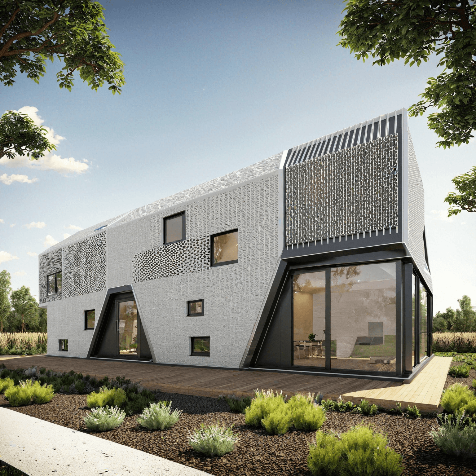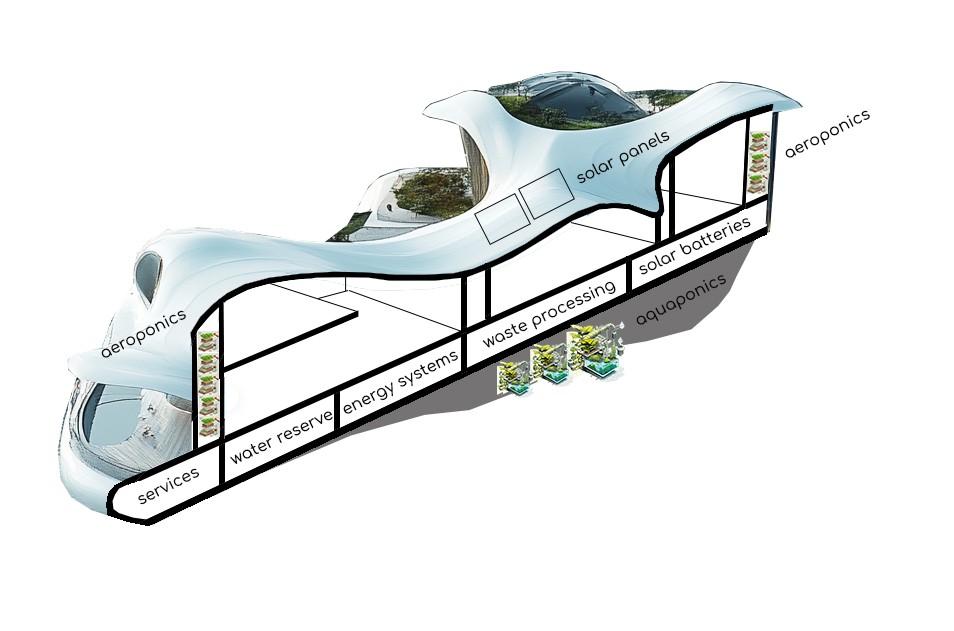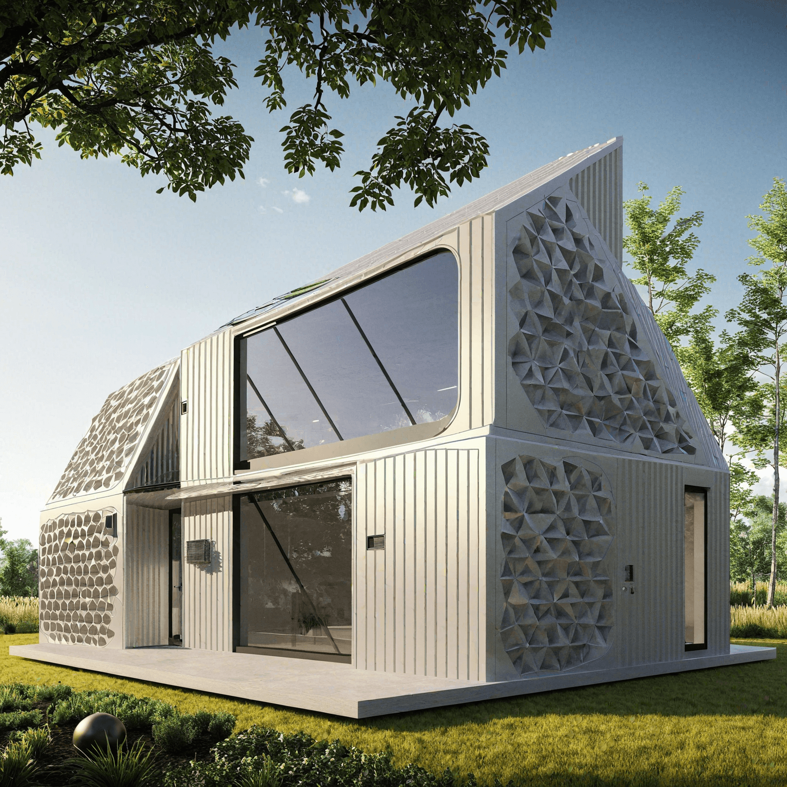 An innovative proposal for an eco house which is transportable, expands to double its size and uses a combination of fully reused upscaled waste materials (turned into triangular building blocks), artificial intelligence and nanotechnologies simply, affordably and efficiently to achieve an end product of at least 50% the current construction cost, while maintaining the comfort and happiness home factor. Not only that - it can adjust itself in size and volume according to the occupier's needs and site context.