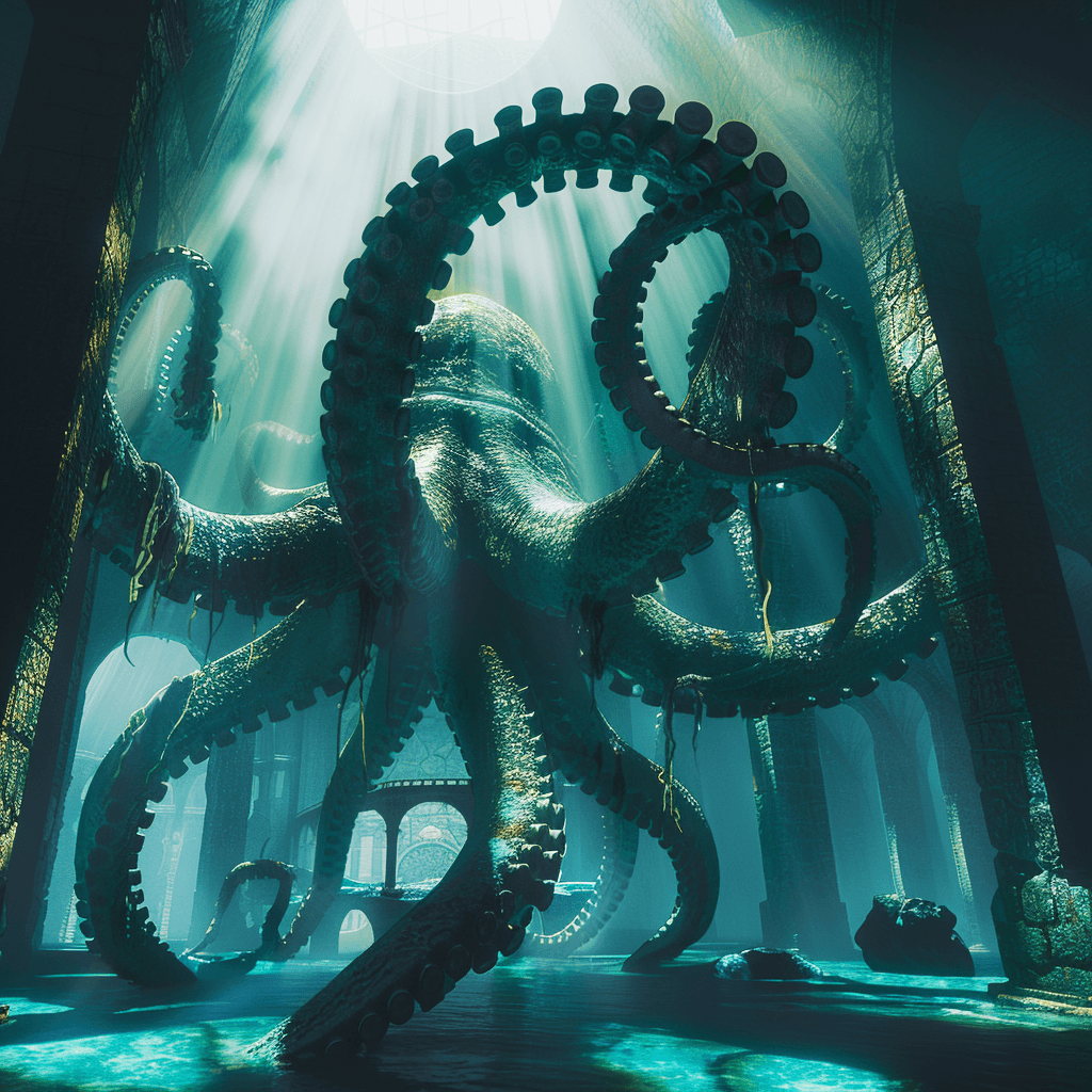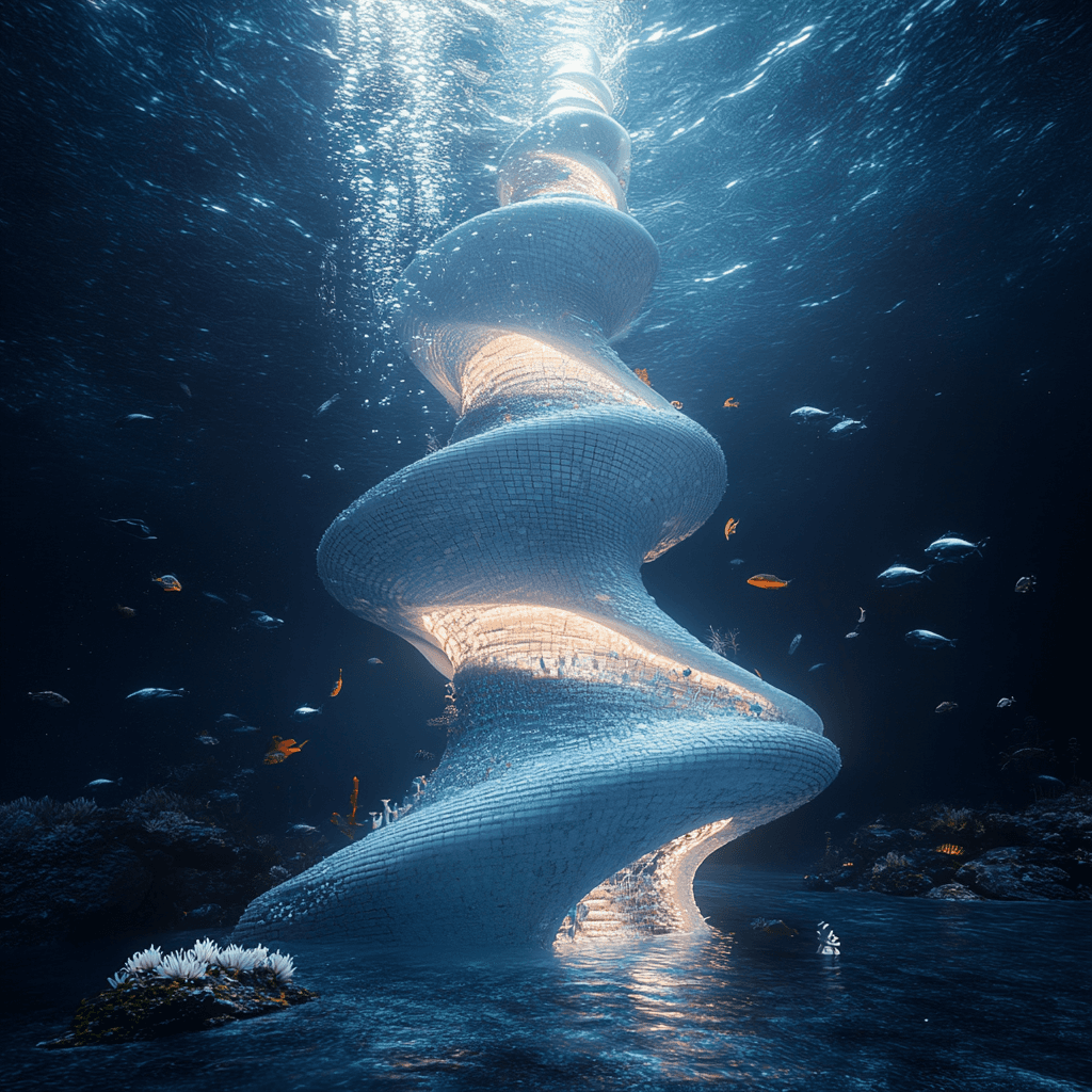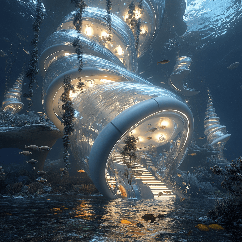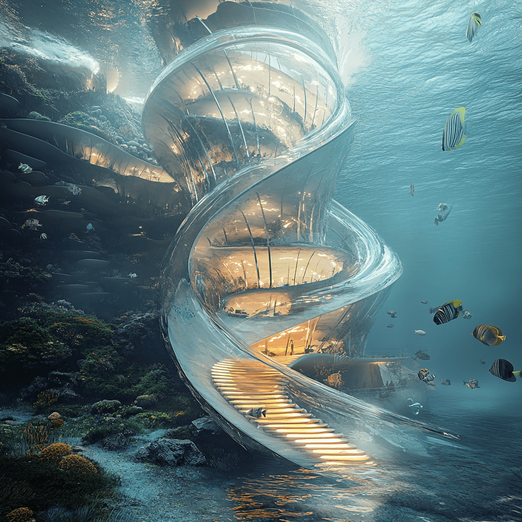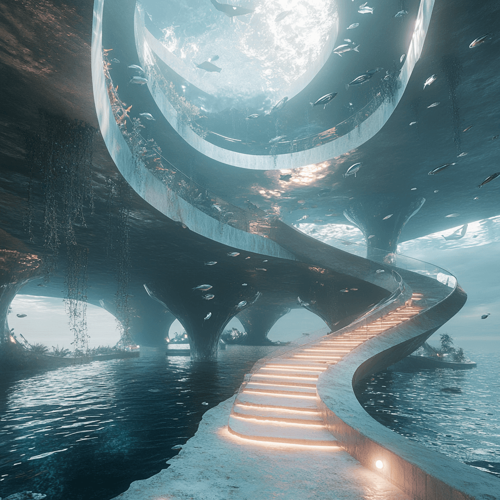 Underwater staircases and entryways into buildings submerged into water. Imagined is the access to buildings which sit on the ocean floor - how are they to be serviced and what would the infrastructure be?