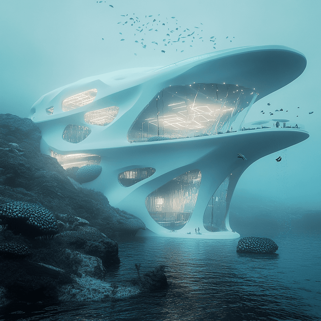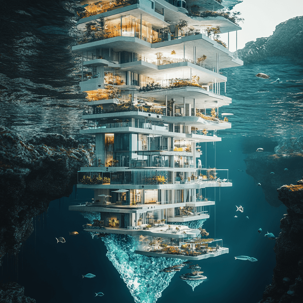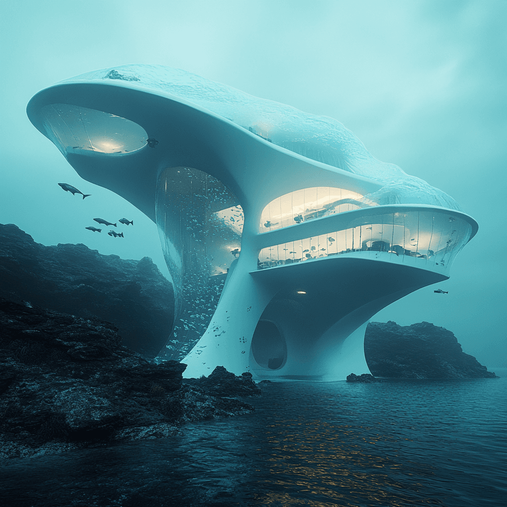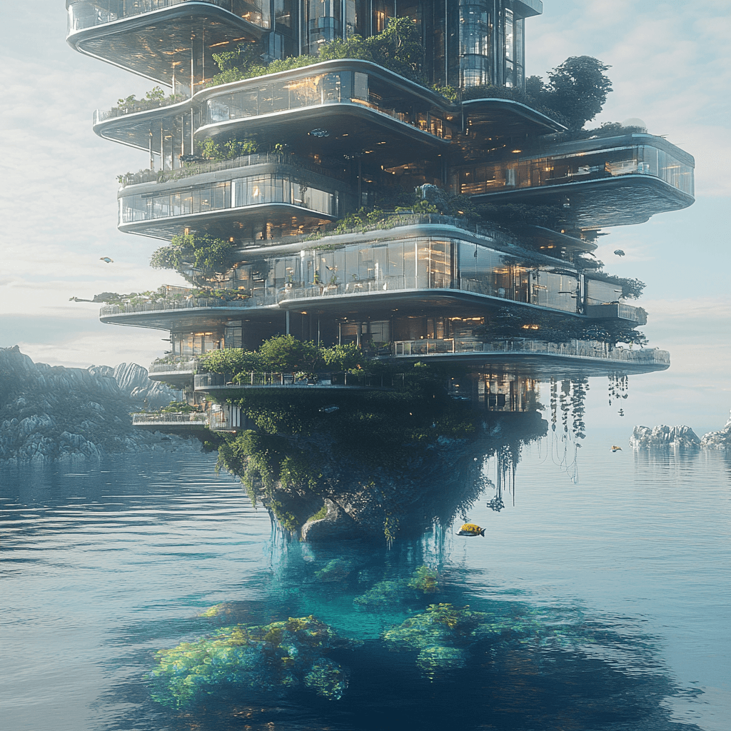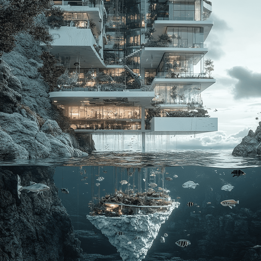 Residential buildings growing as organic formations on rocks in the ocean. Each building has an aquaponic farm at its base, integrating marine life with human habitats.