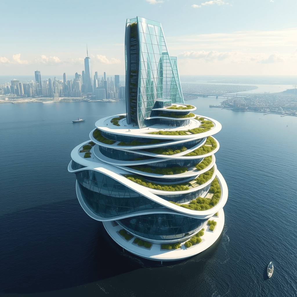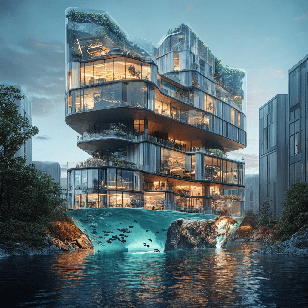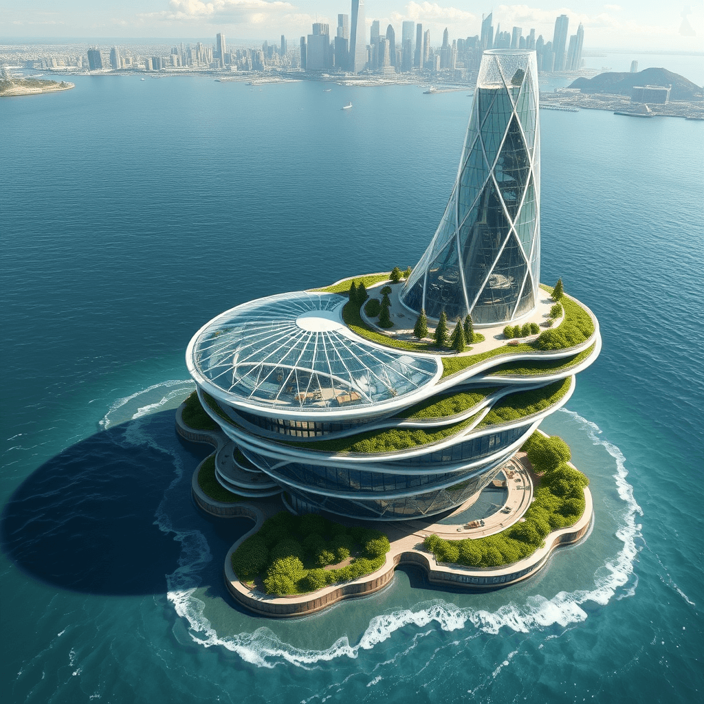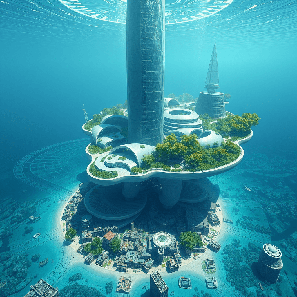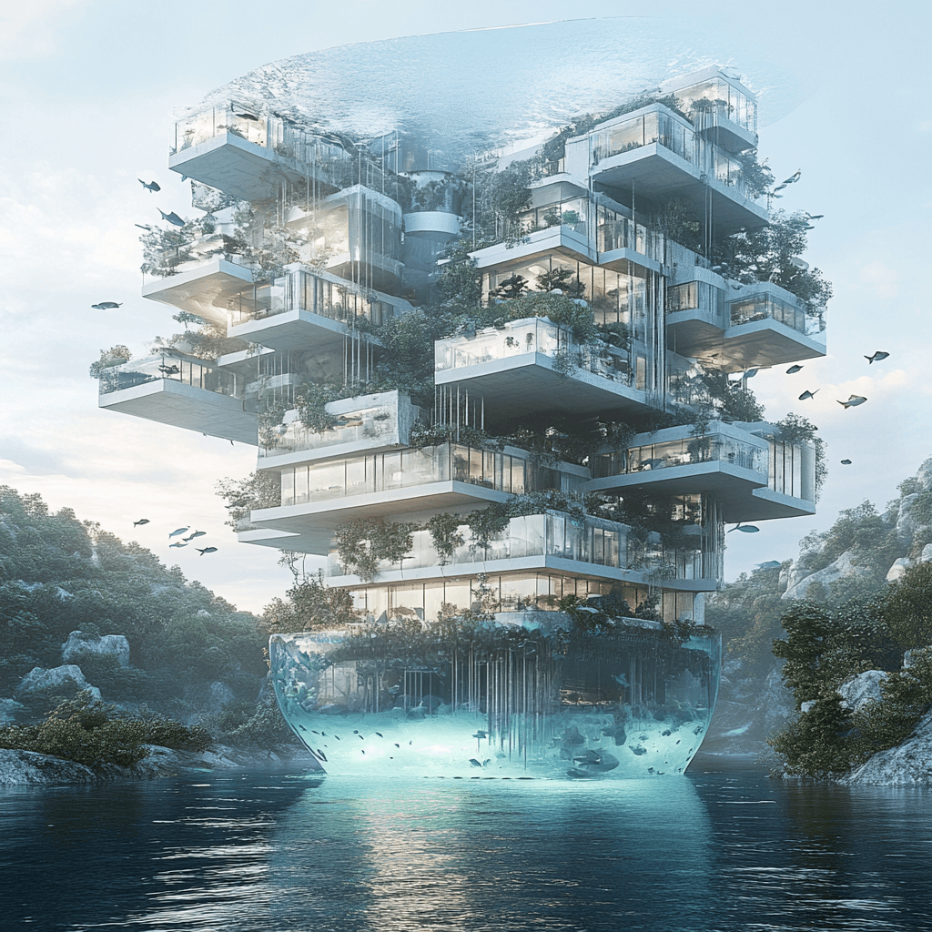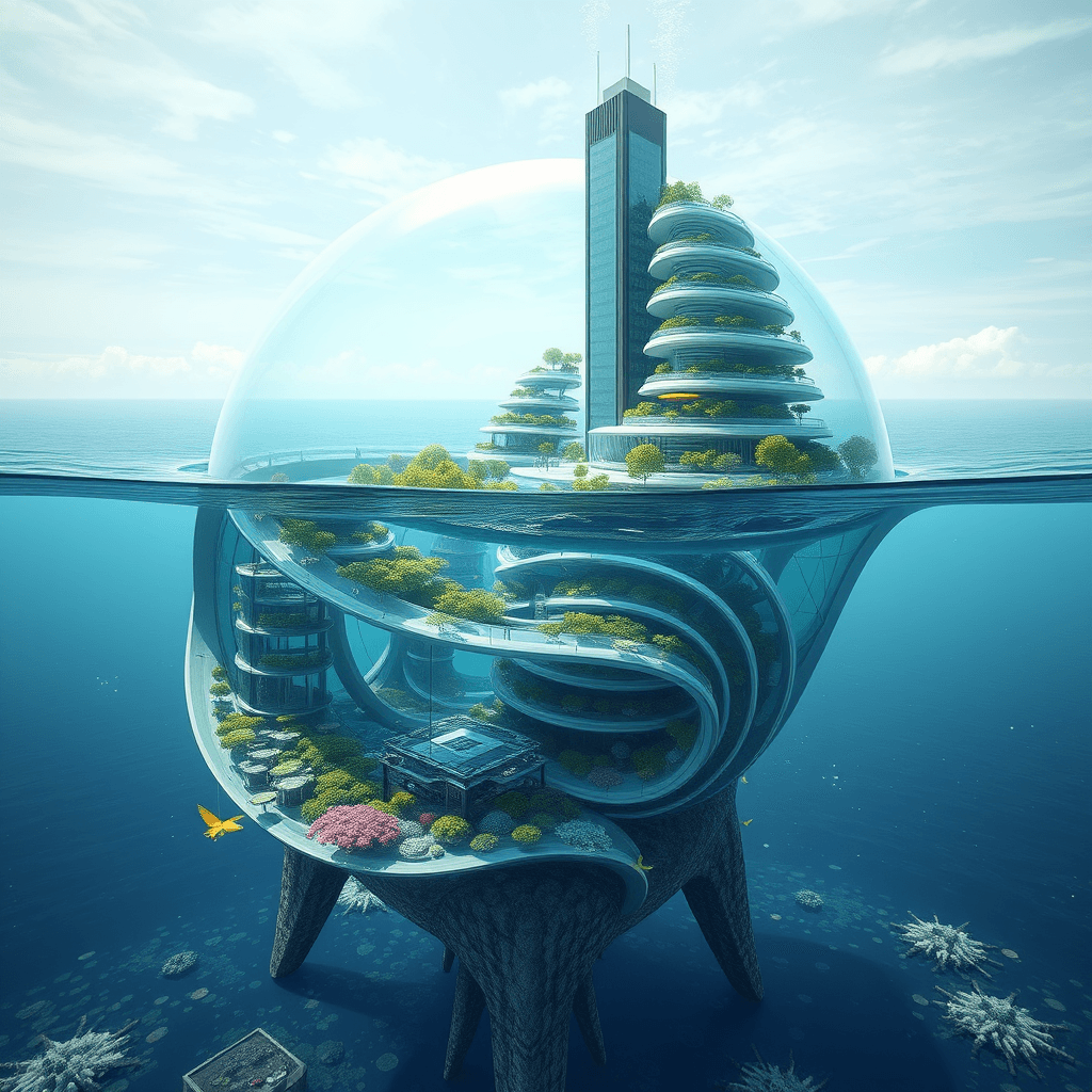 Residential buildings growing as organic formations on rocks in the ocean. Each building has an aquaponic farm at its base, integrating marine life with human habitats.