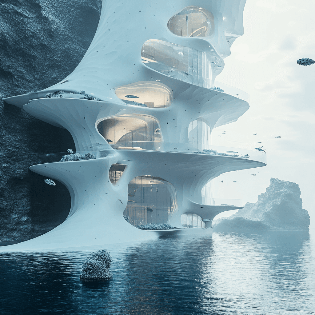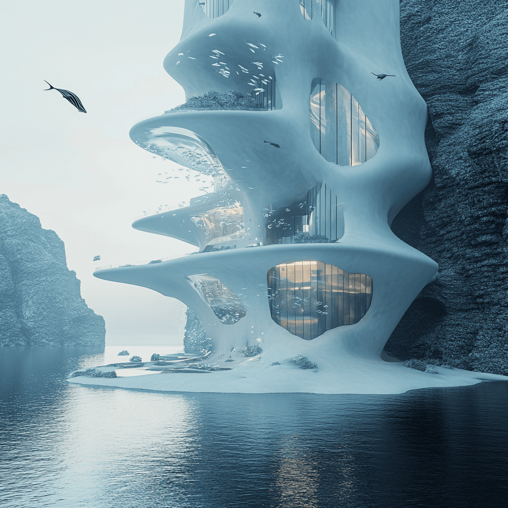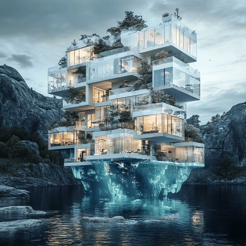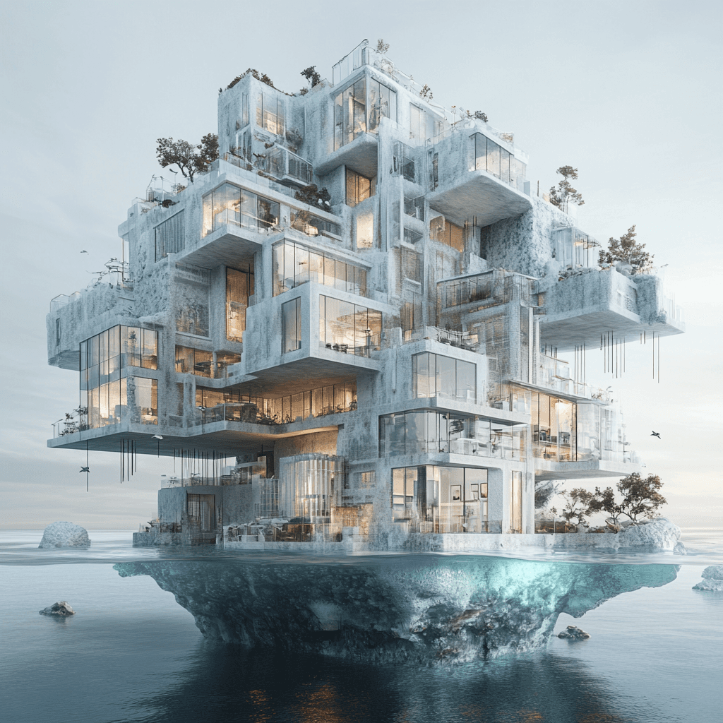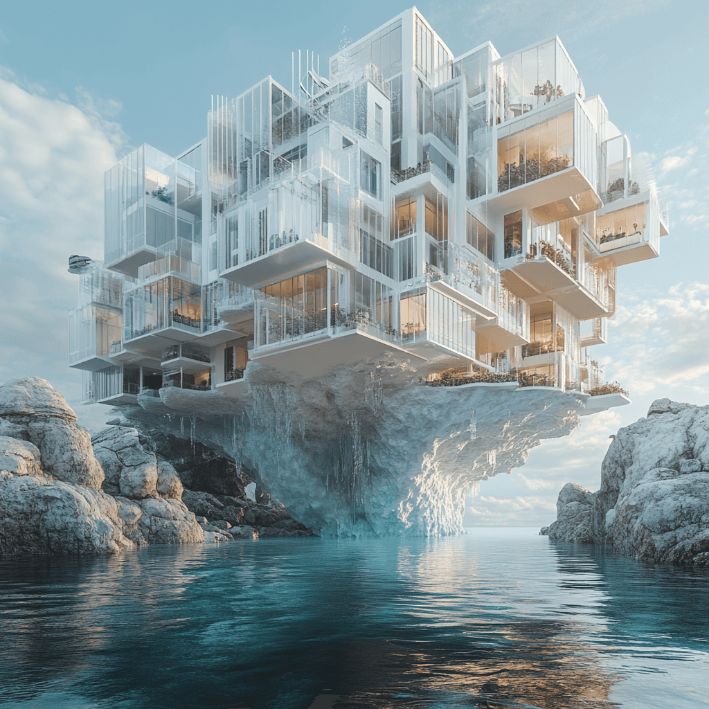 Ocean buildings built from and inside iceberg formations.