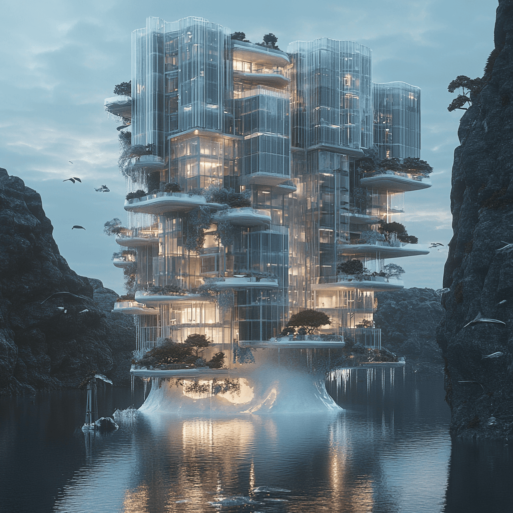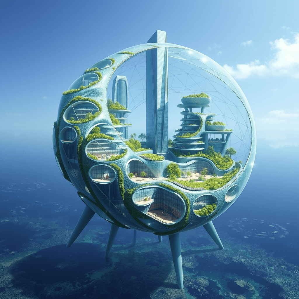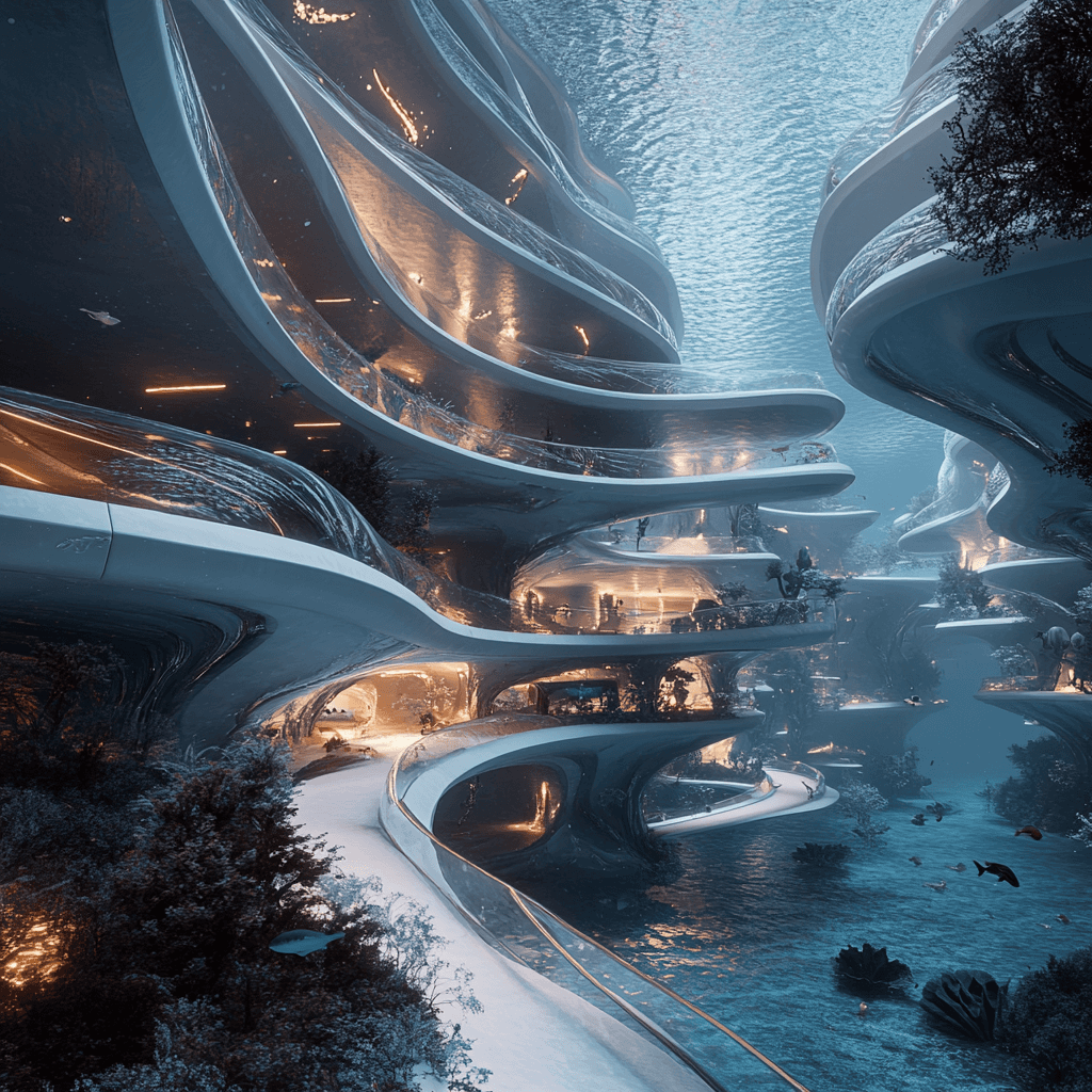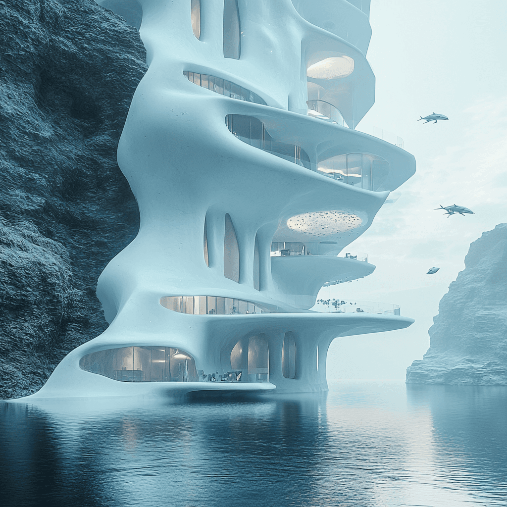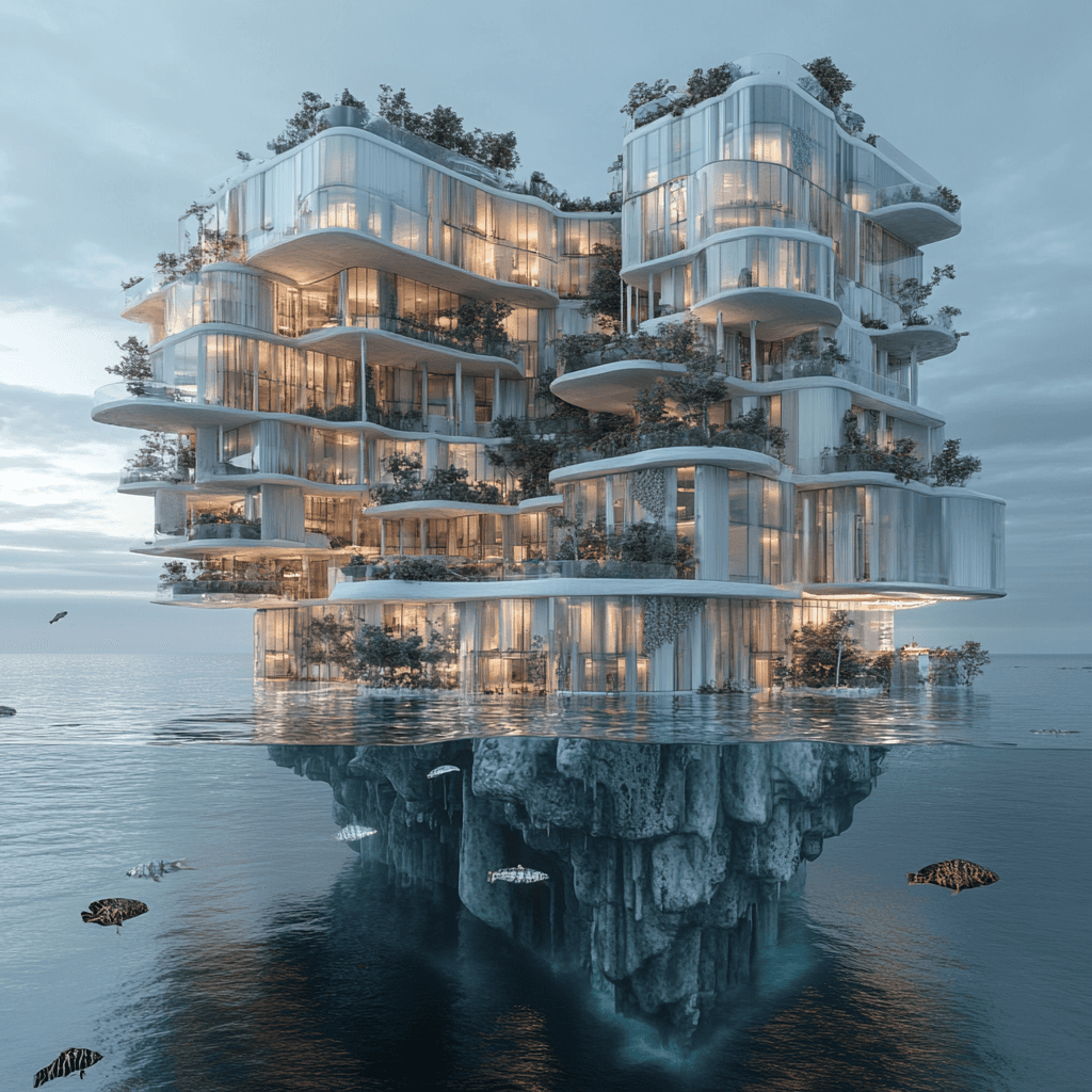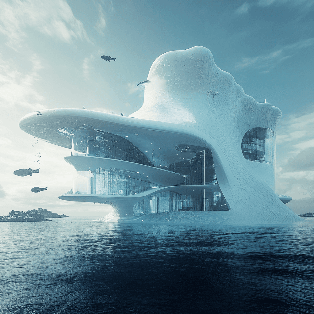 Ocean buildings built from and inside iceberg formations.