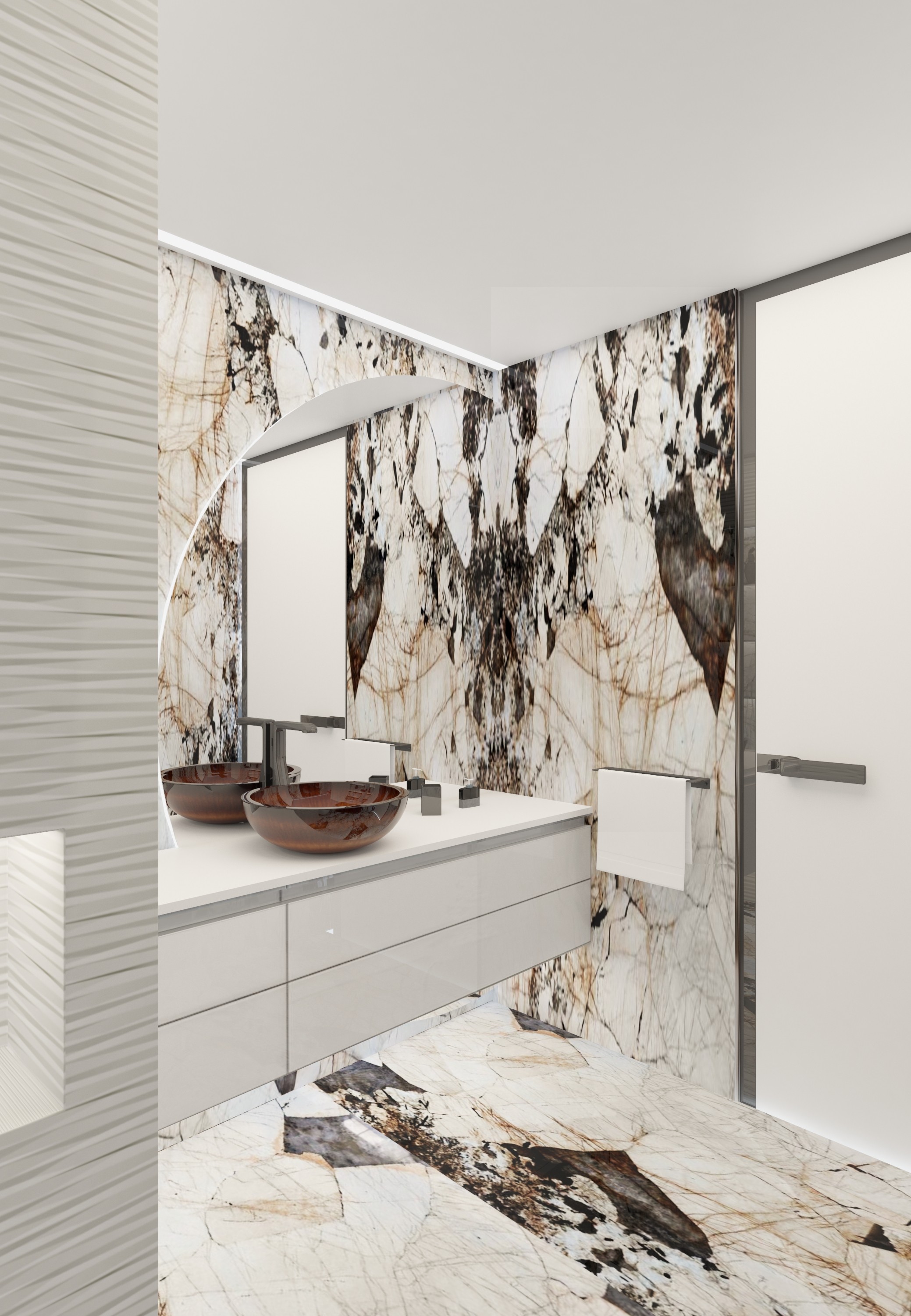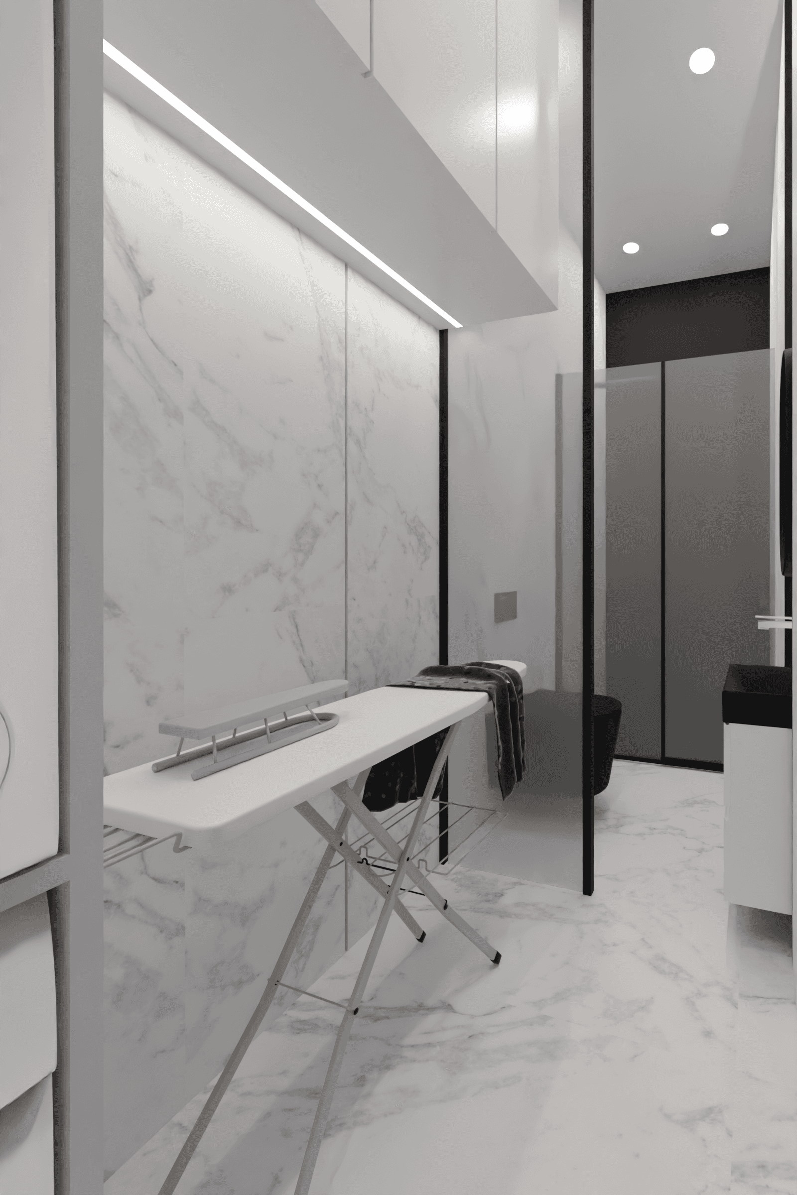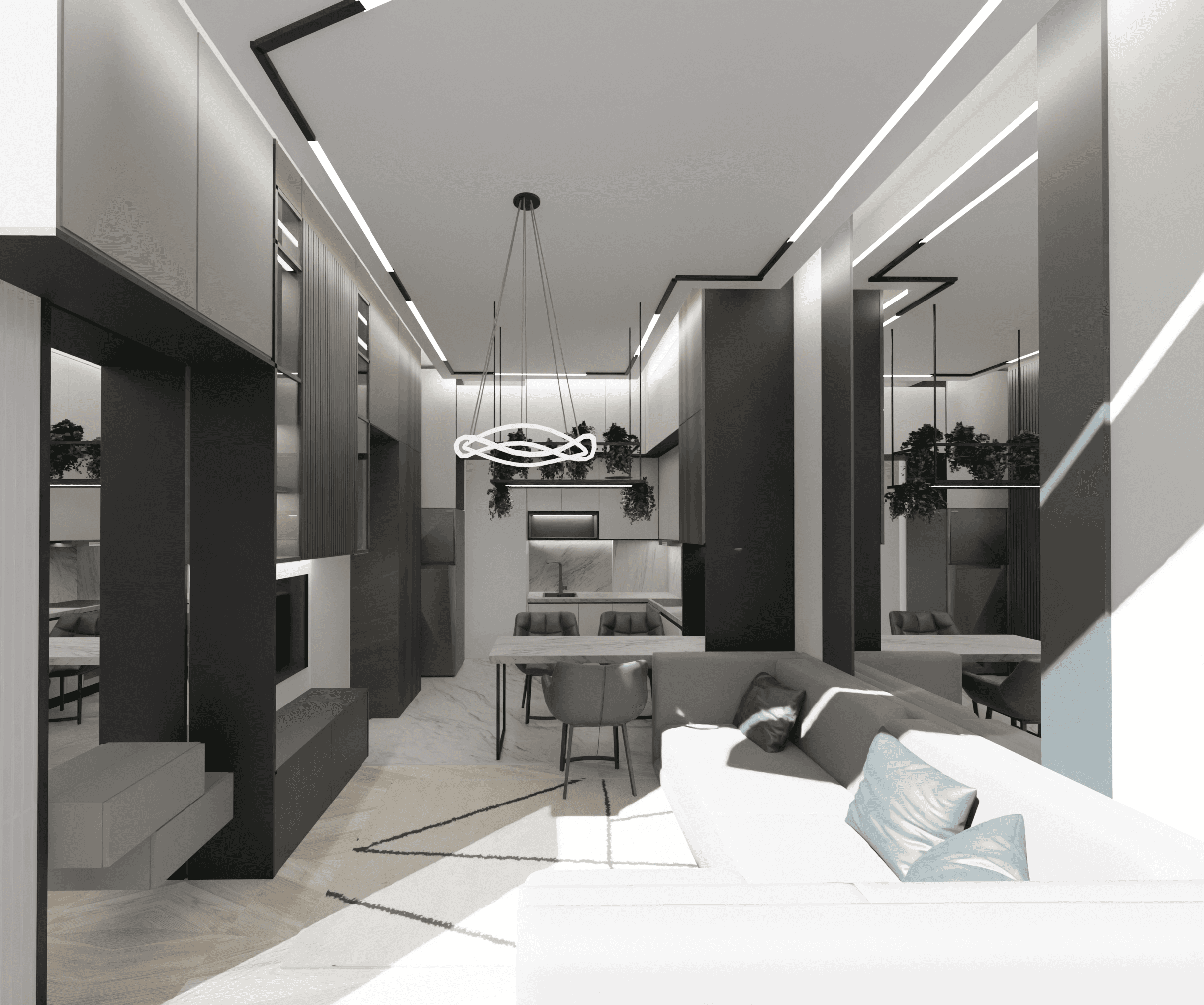 A minimalist apartment interior design using luxury materials and fully bespoke furniture.