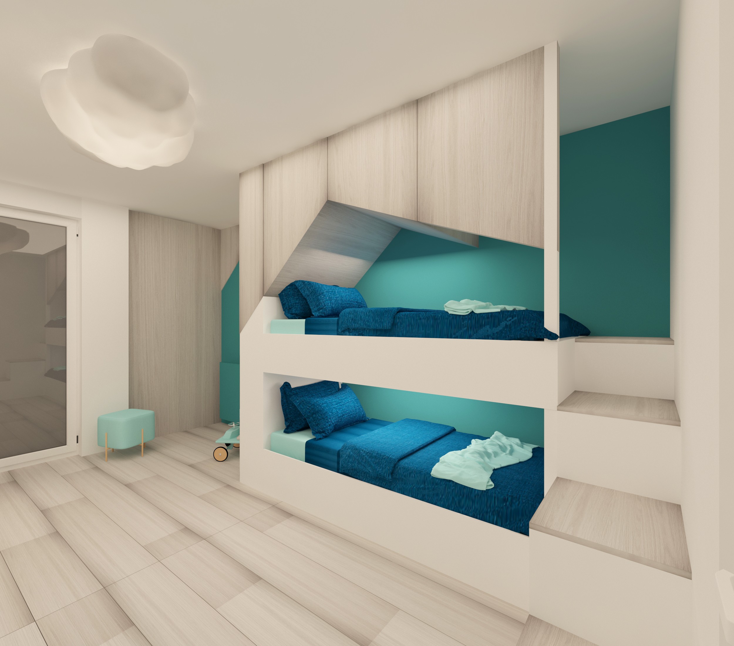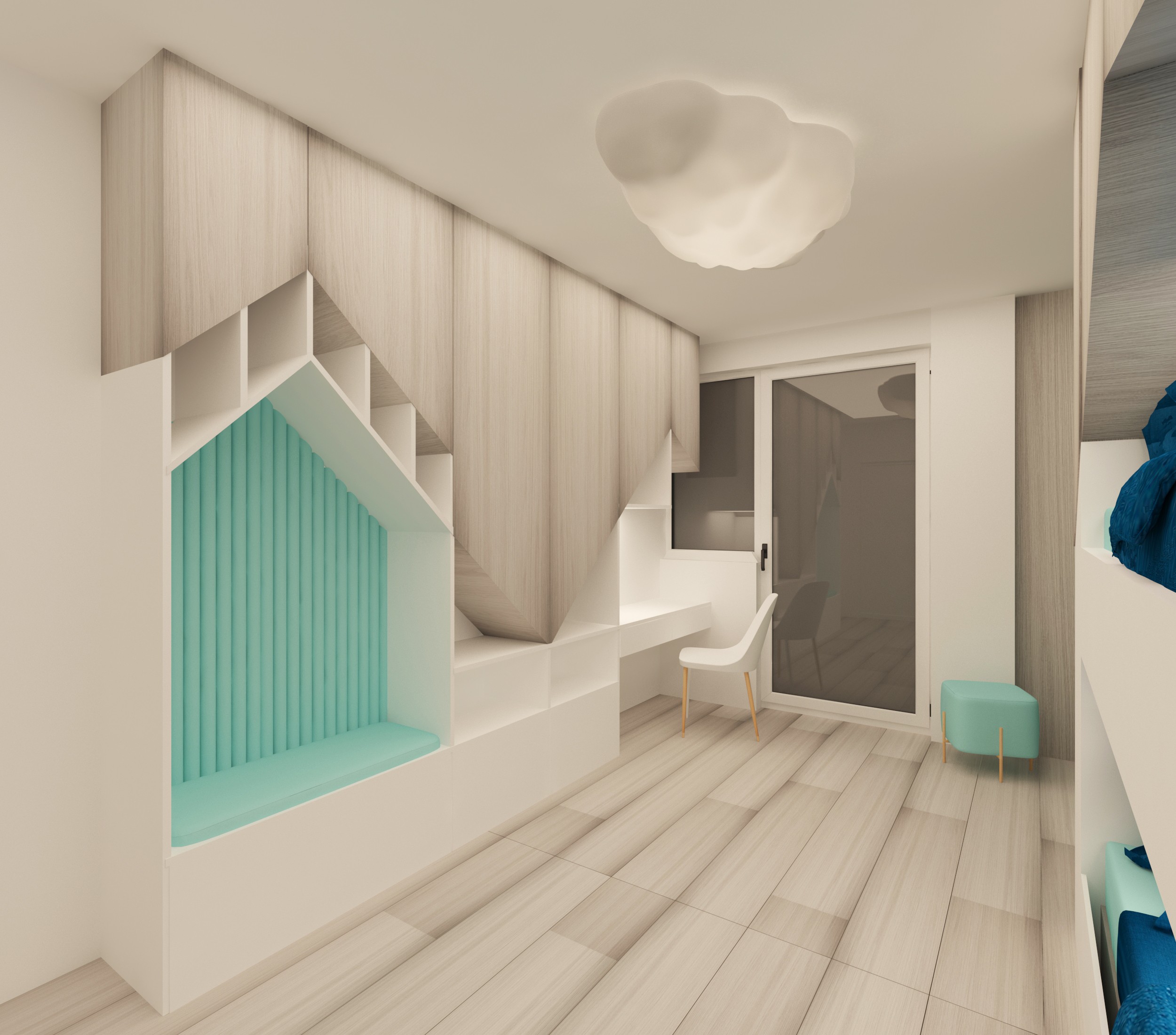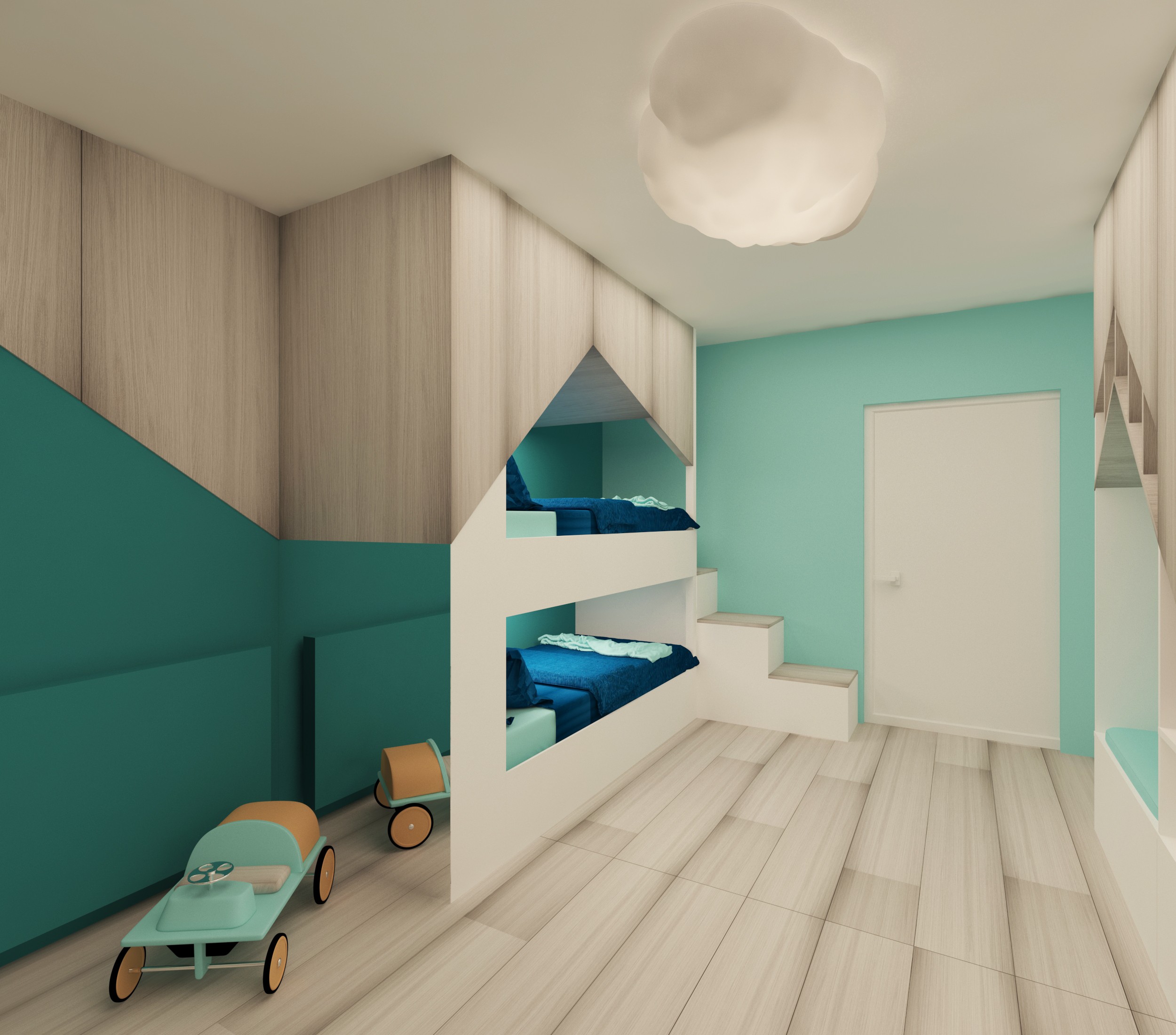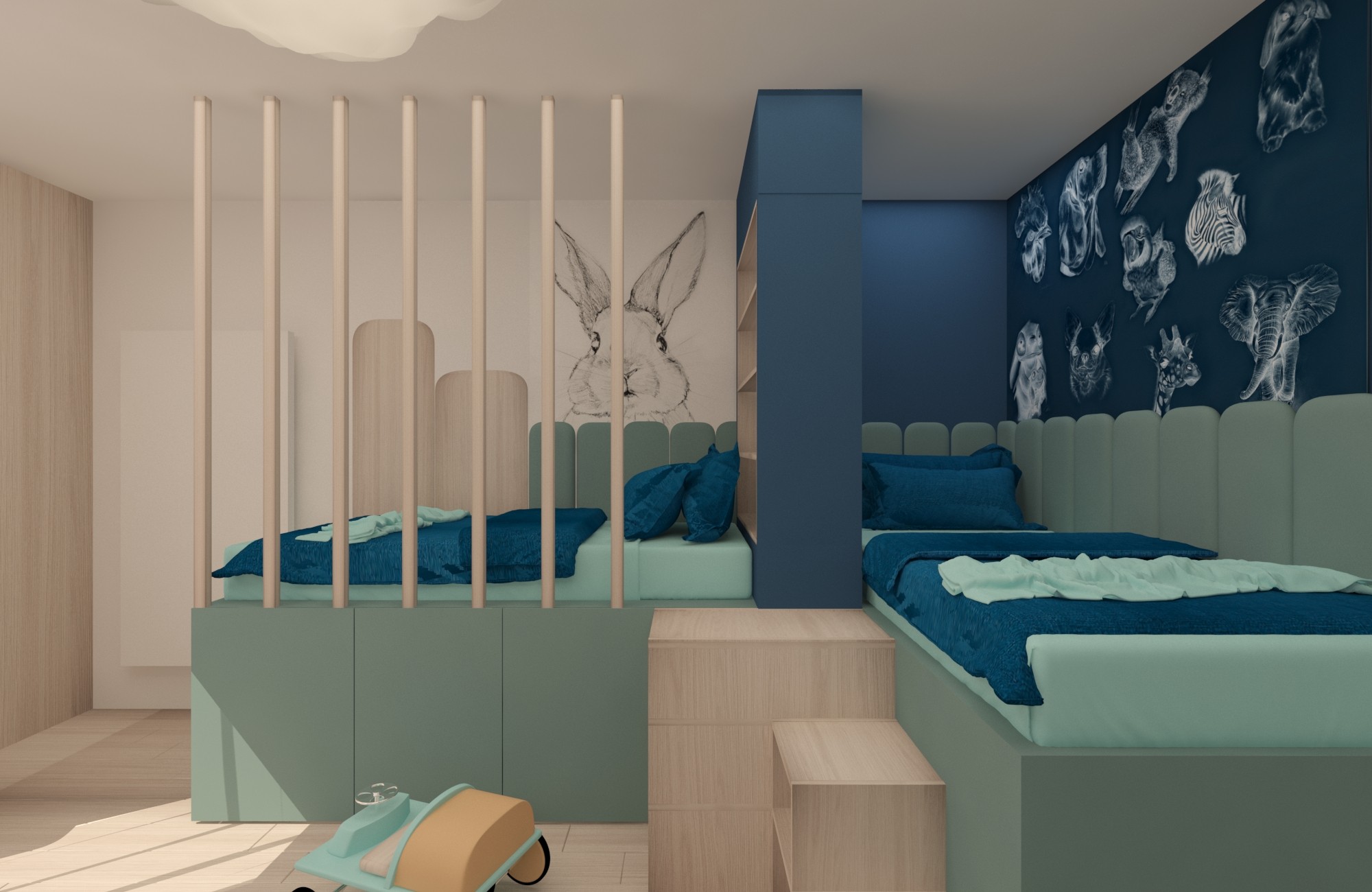 A minimalist kids room interior design for two siblings, fully custom designed furniture, three themes explored - mountain, blue bunny and yellow bunny.