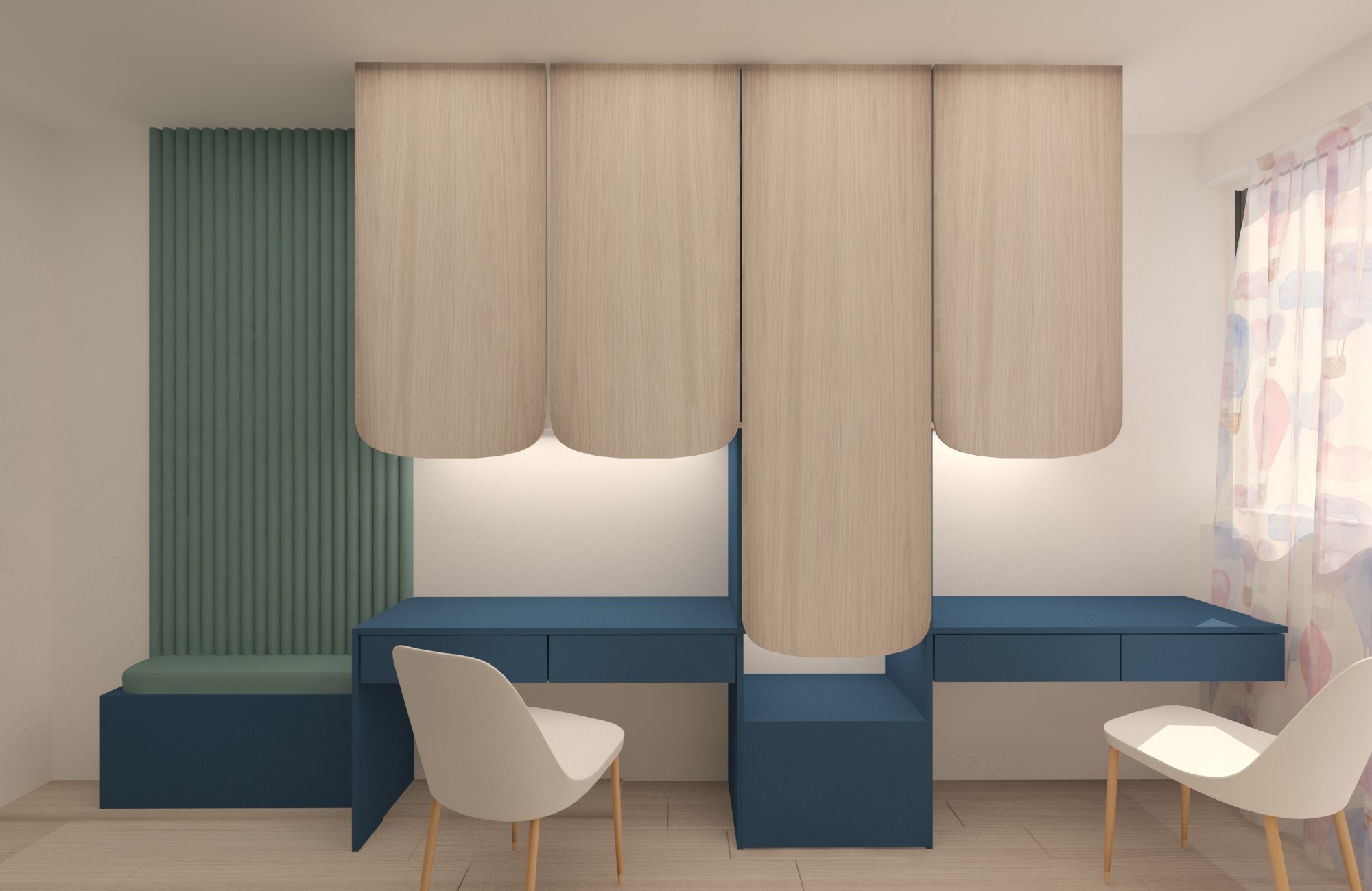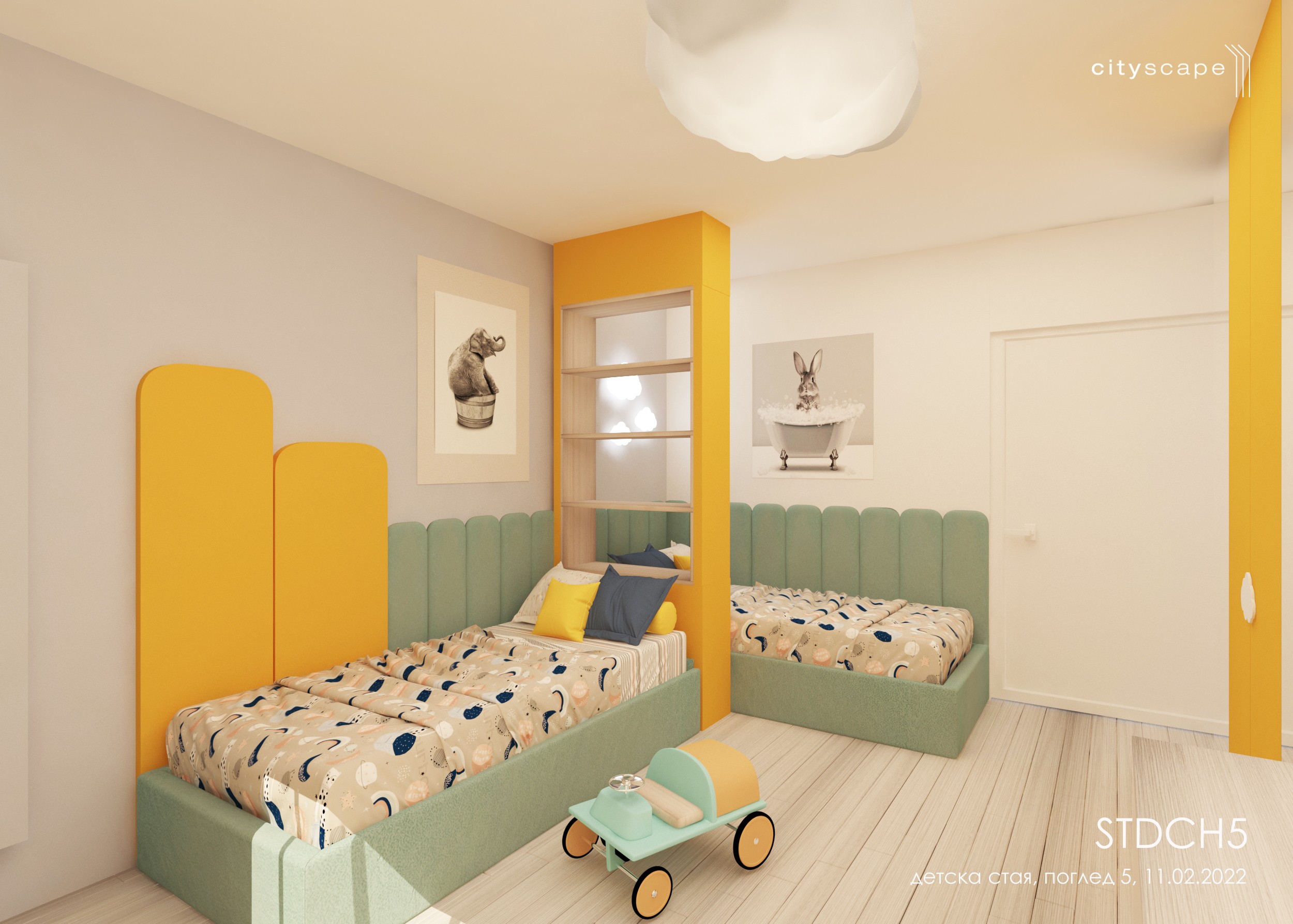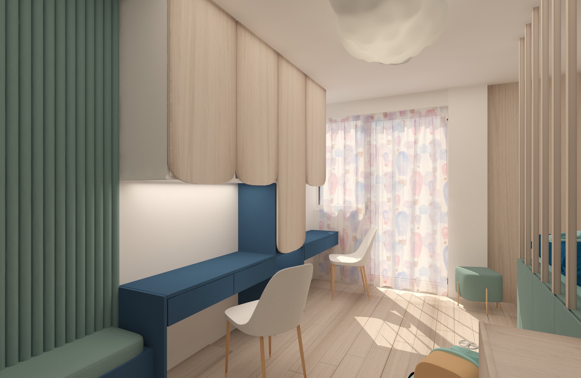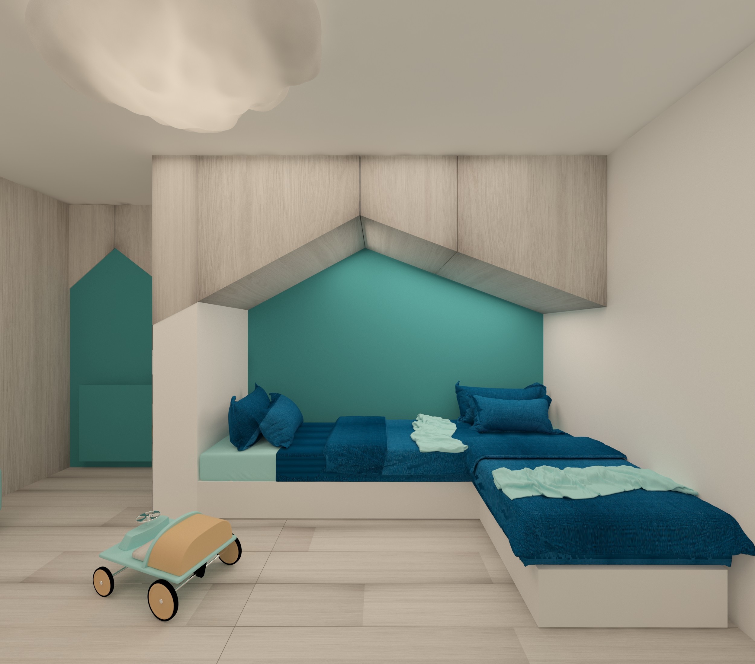A minimalist kids room interior design for two siblings, fully custom designed furniture, three themes explored - mountain, blue bunny and yellow bunny.