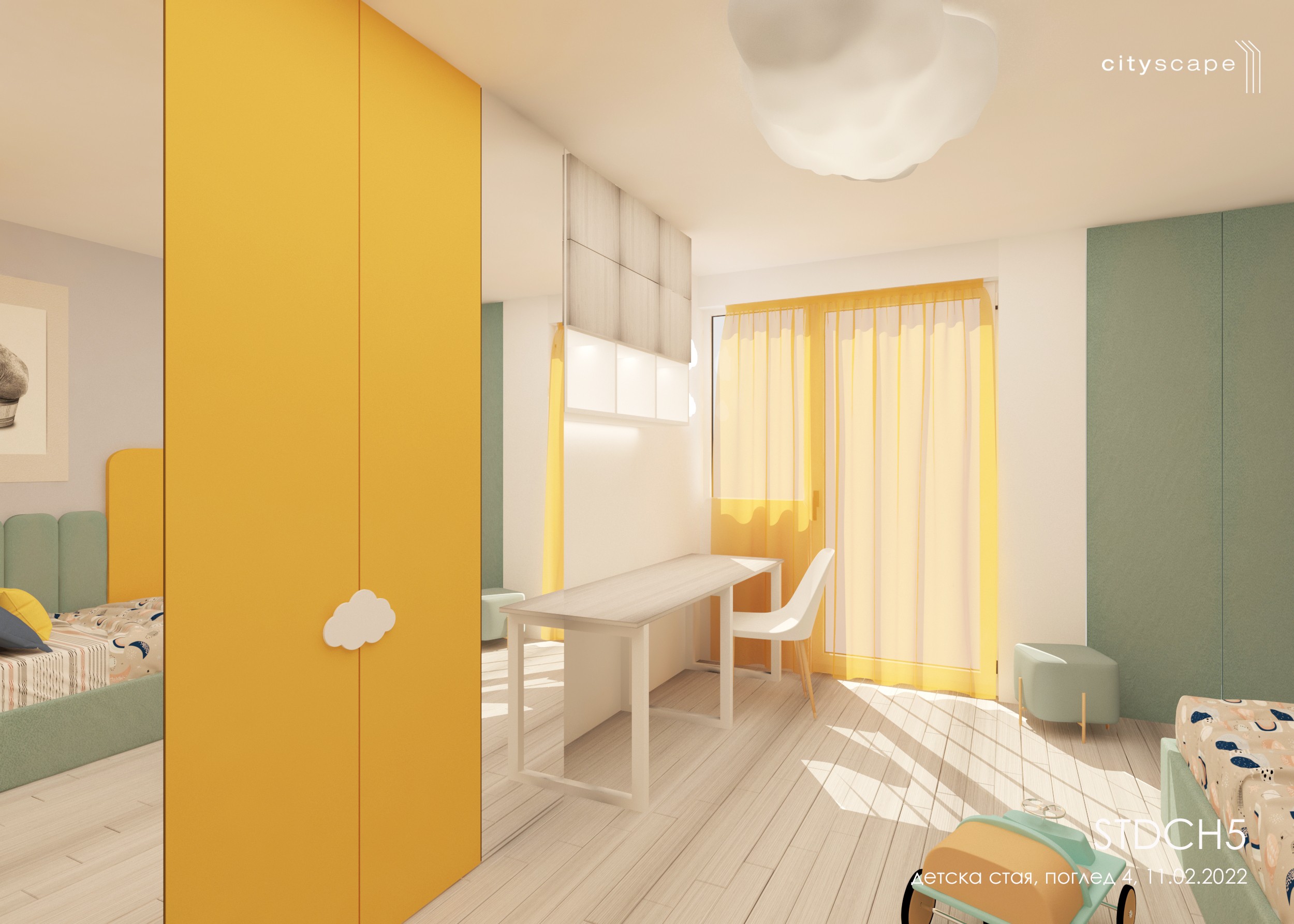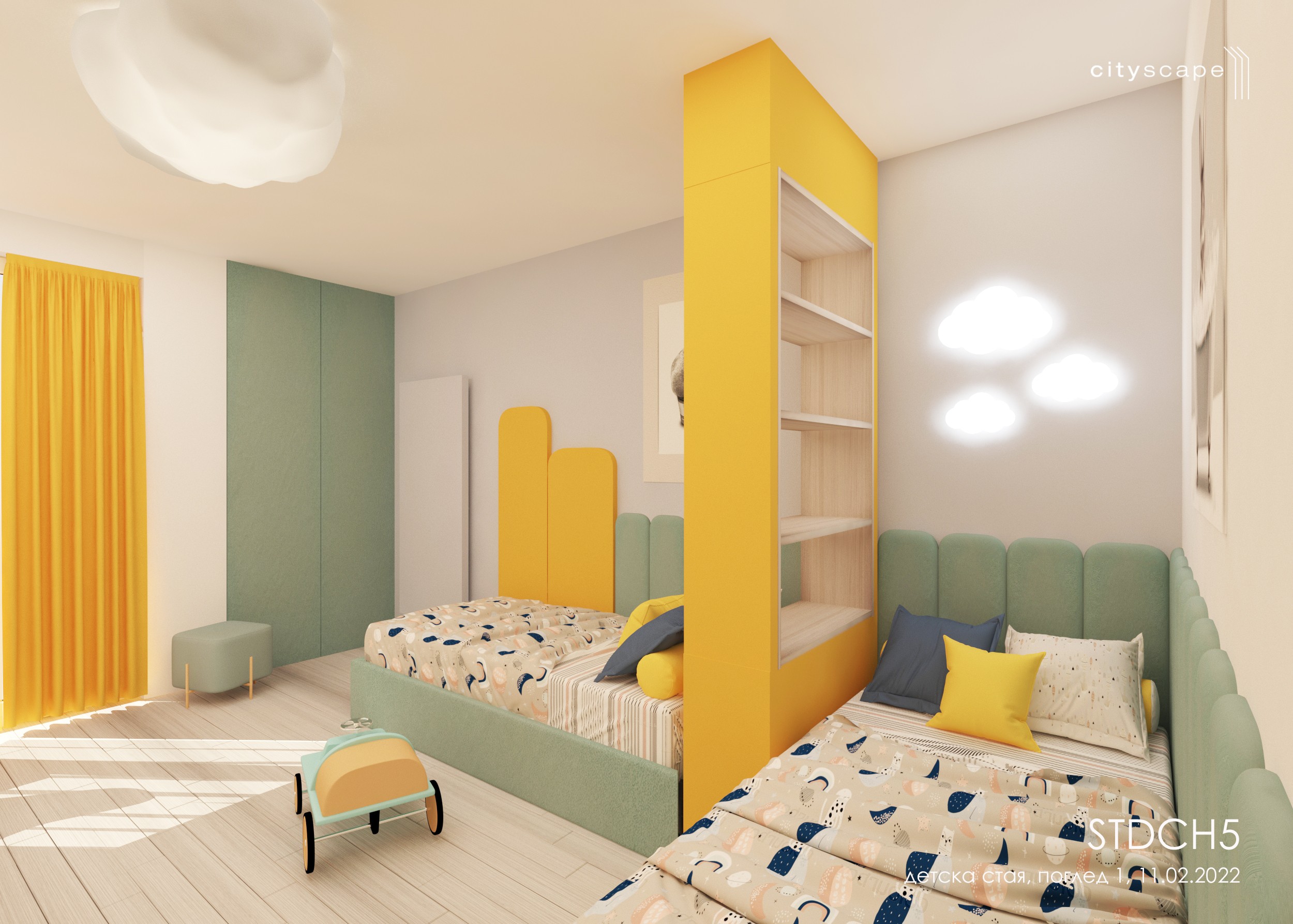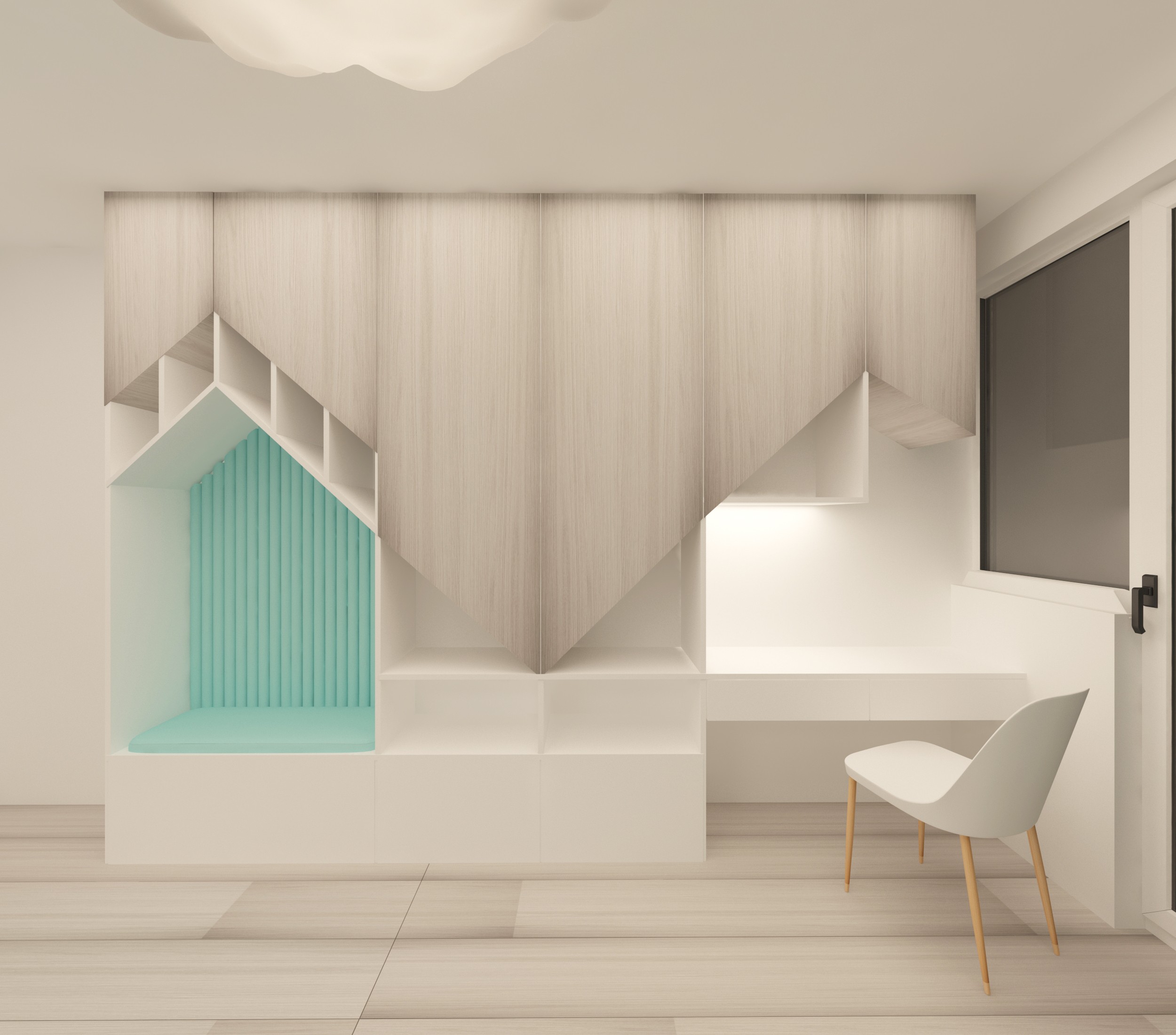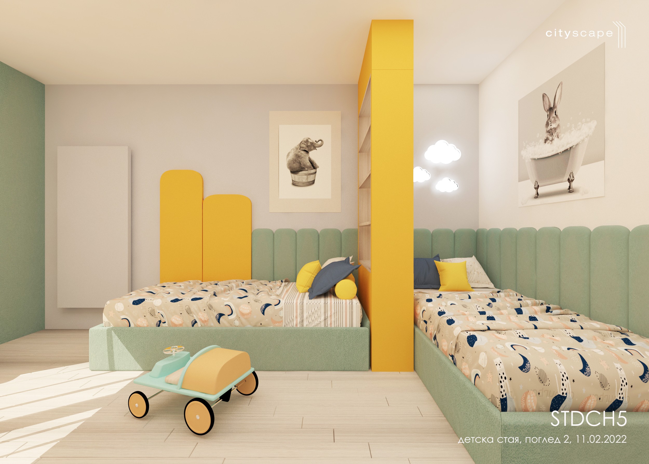 A minimalist kids room interior design for two siblings, fully custom designed furniture, three themes explored - mountain, blue bunny and yellow bunny.