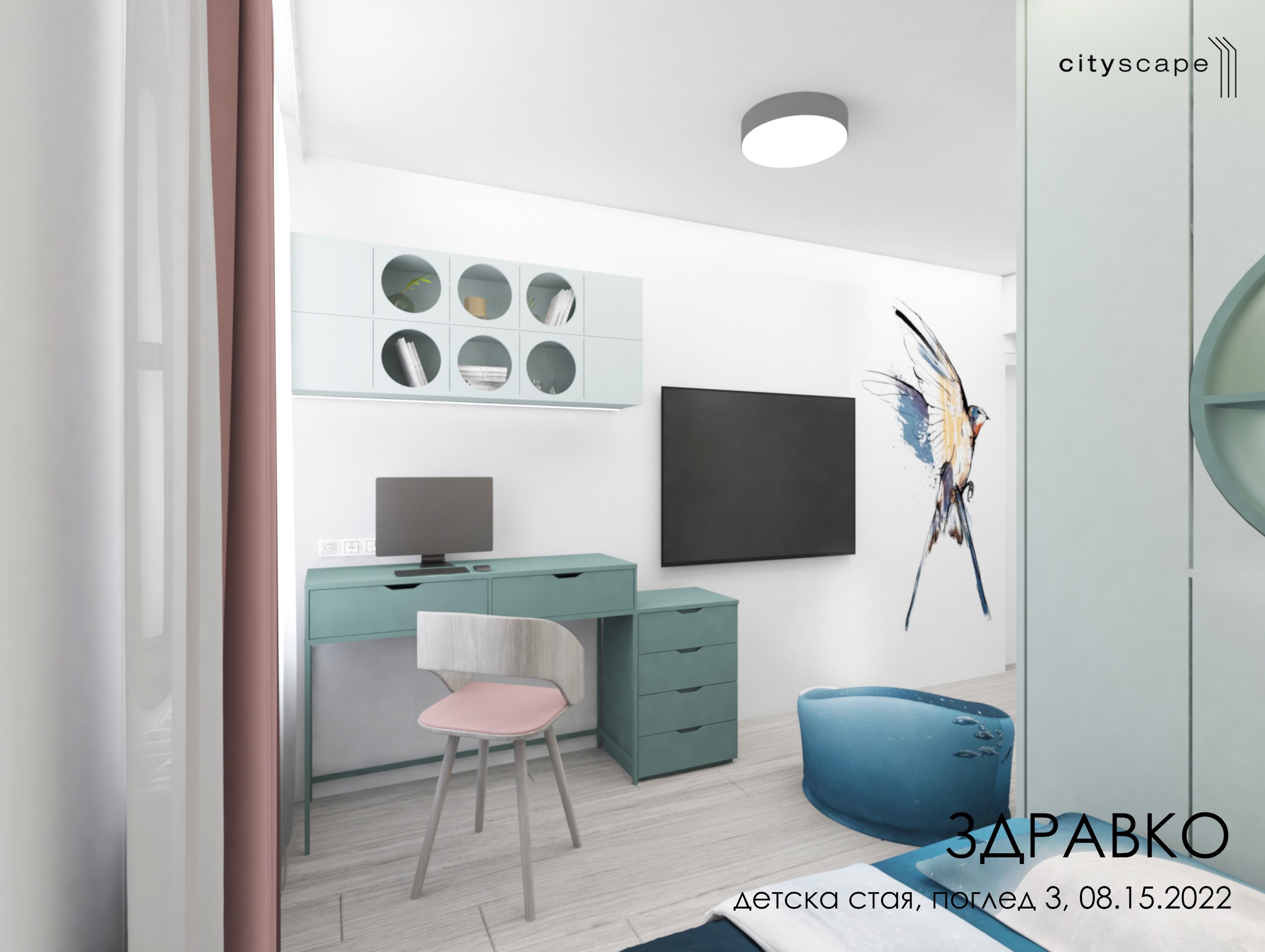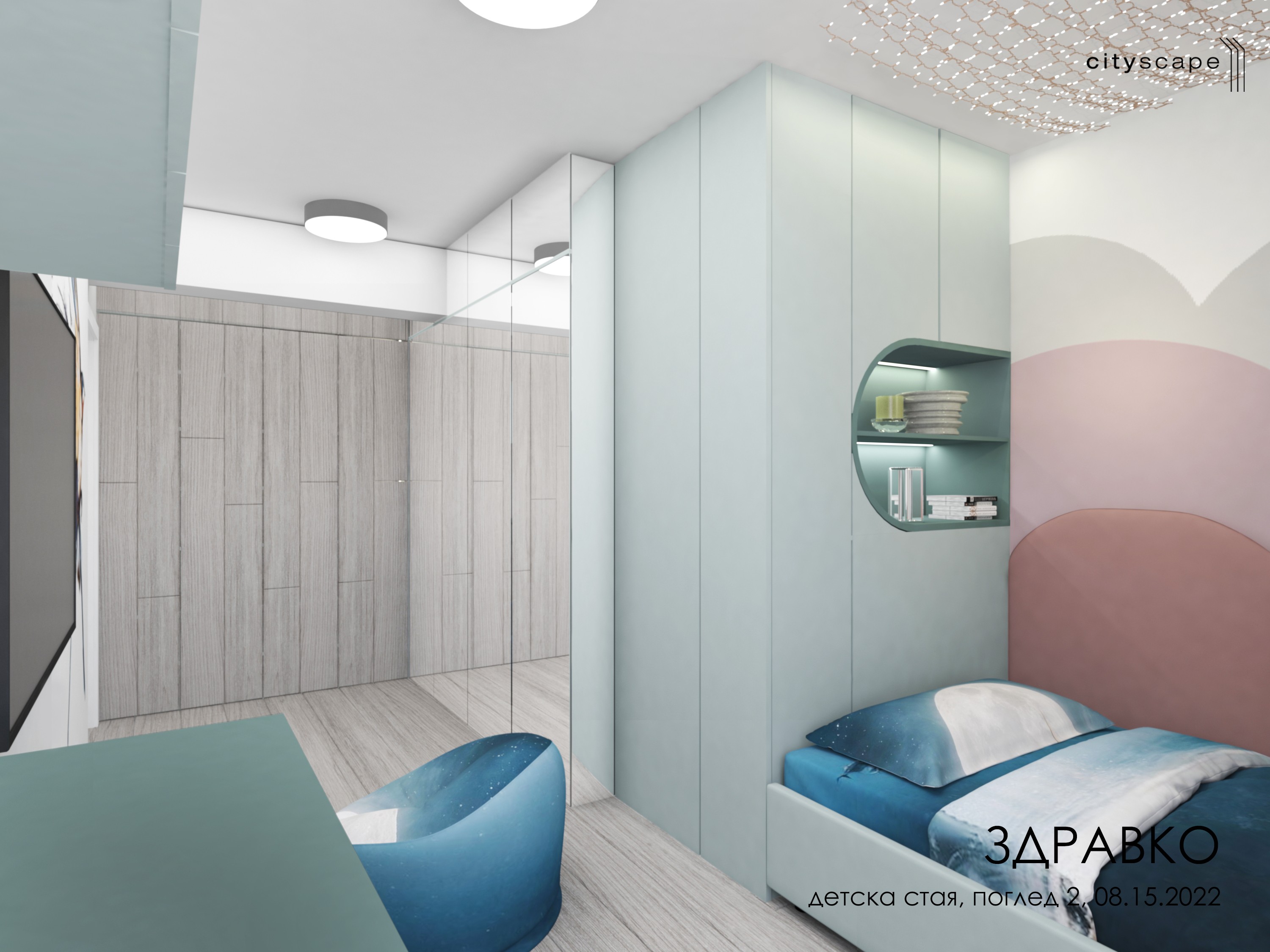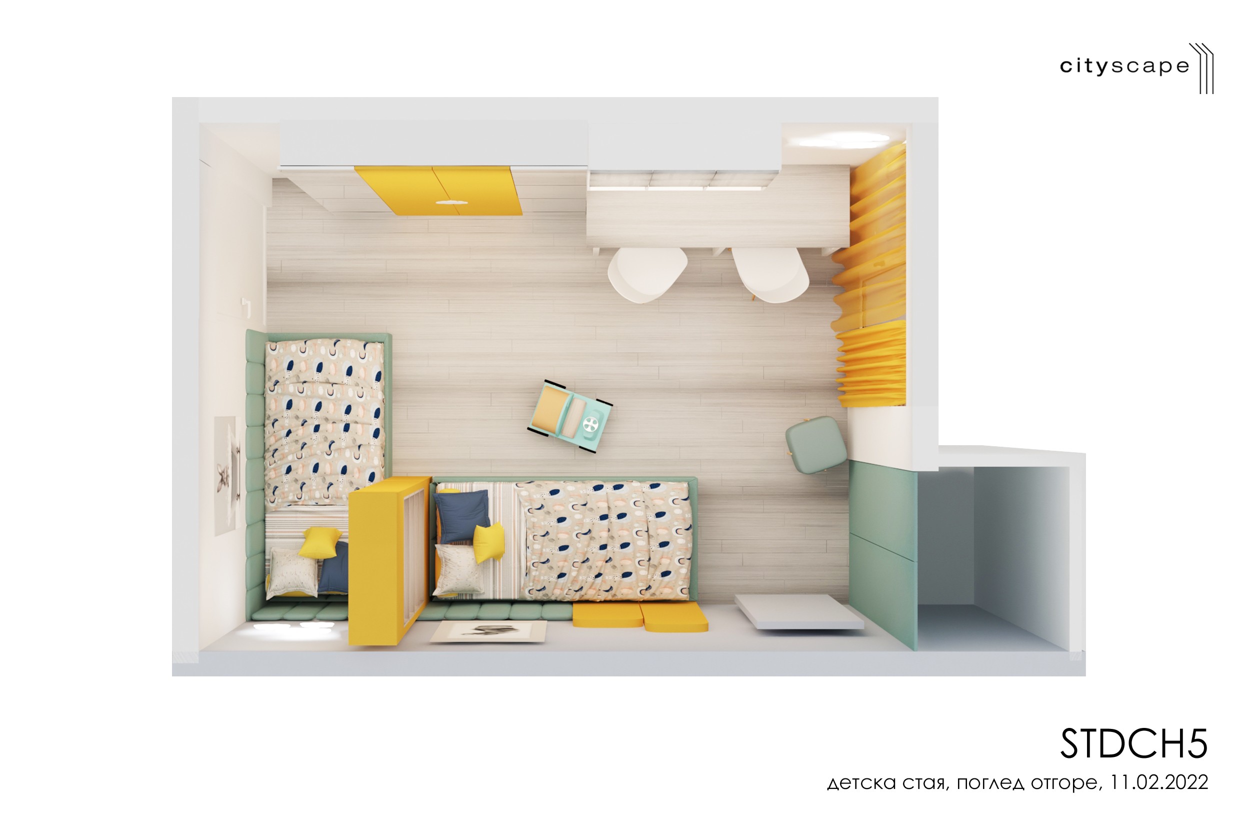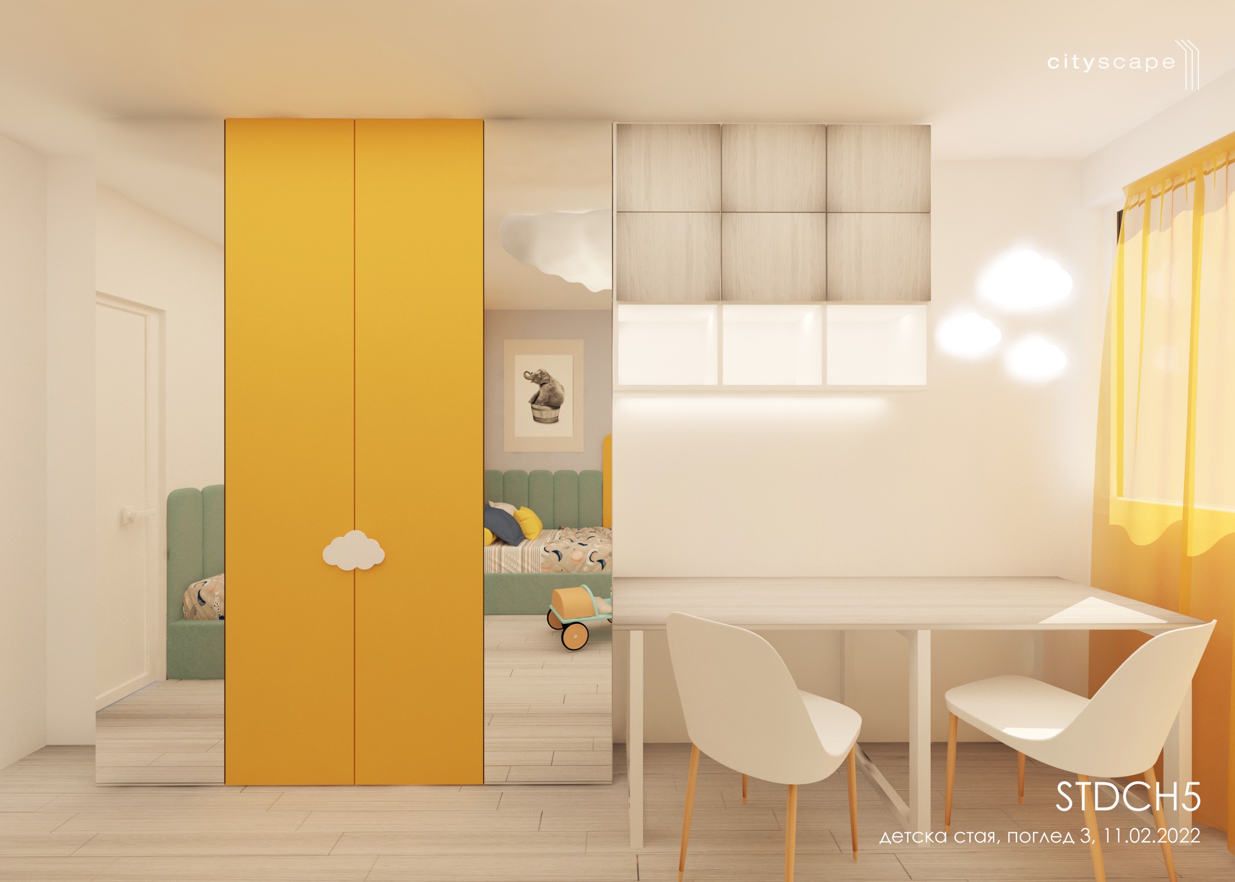 A minimalist kids room interior design for two siblings, fully custom designed furniture, three themes explored - mountain, blue bunny and yellow bunny.