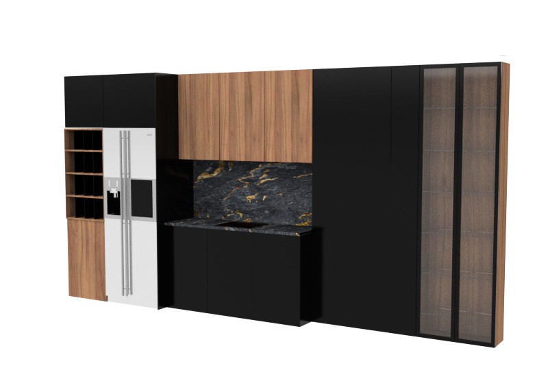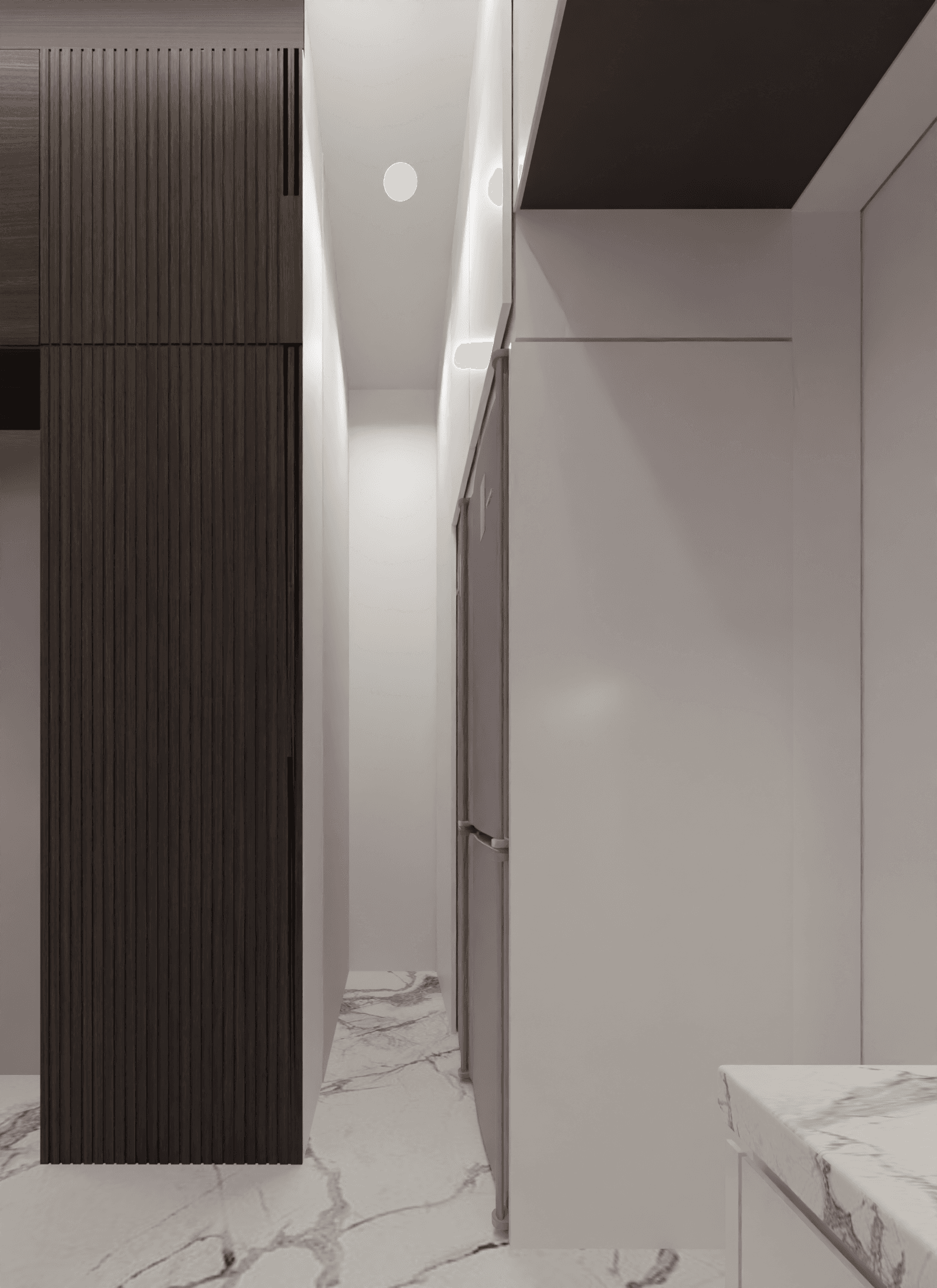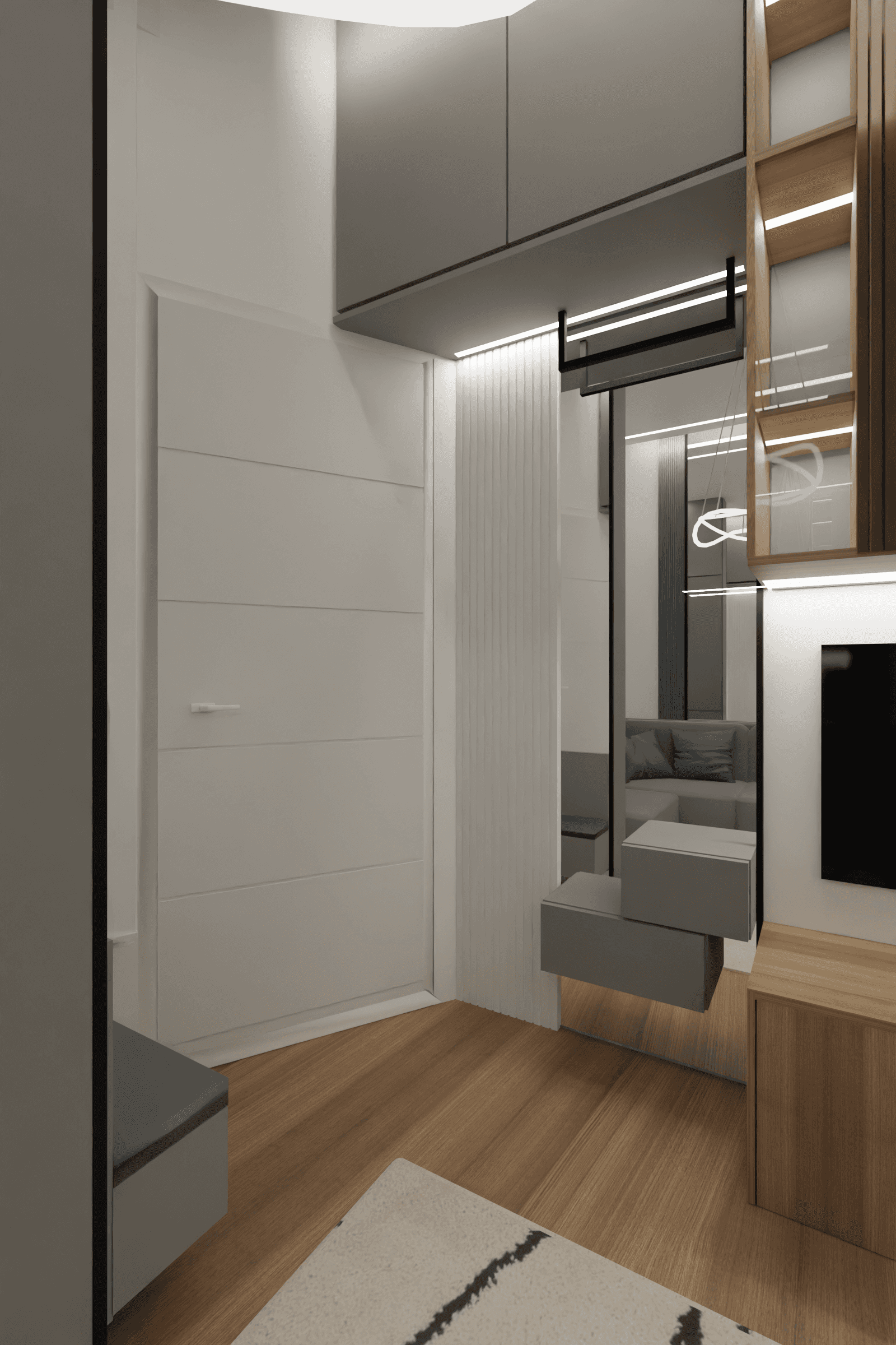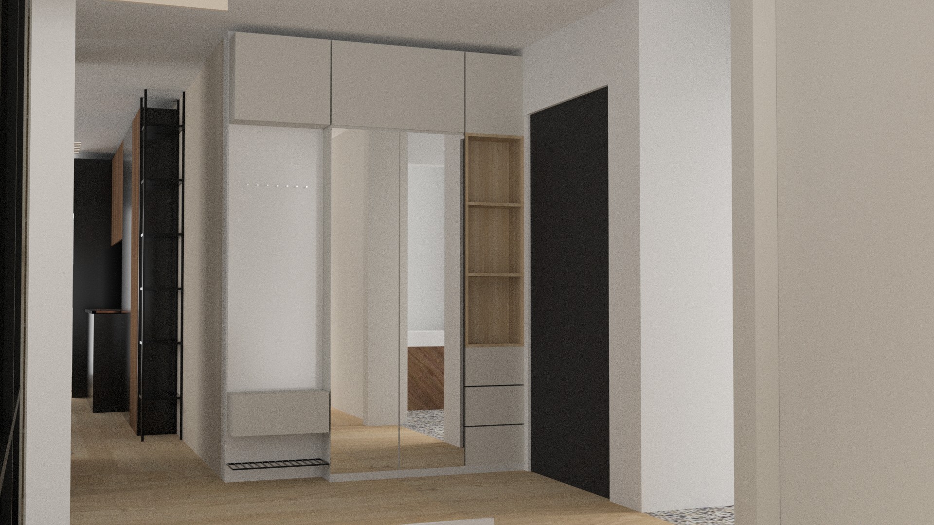 An interior design project for a 3-room residence, natural dark wood materials used for bespoke furniture throughout.