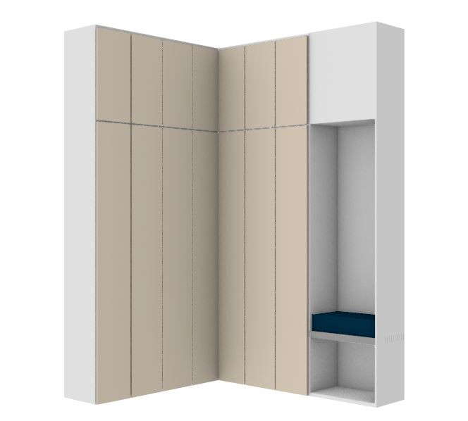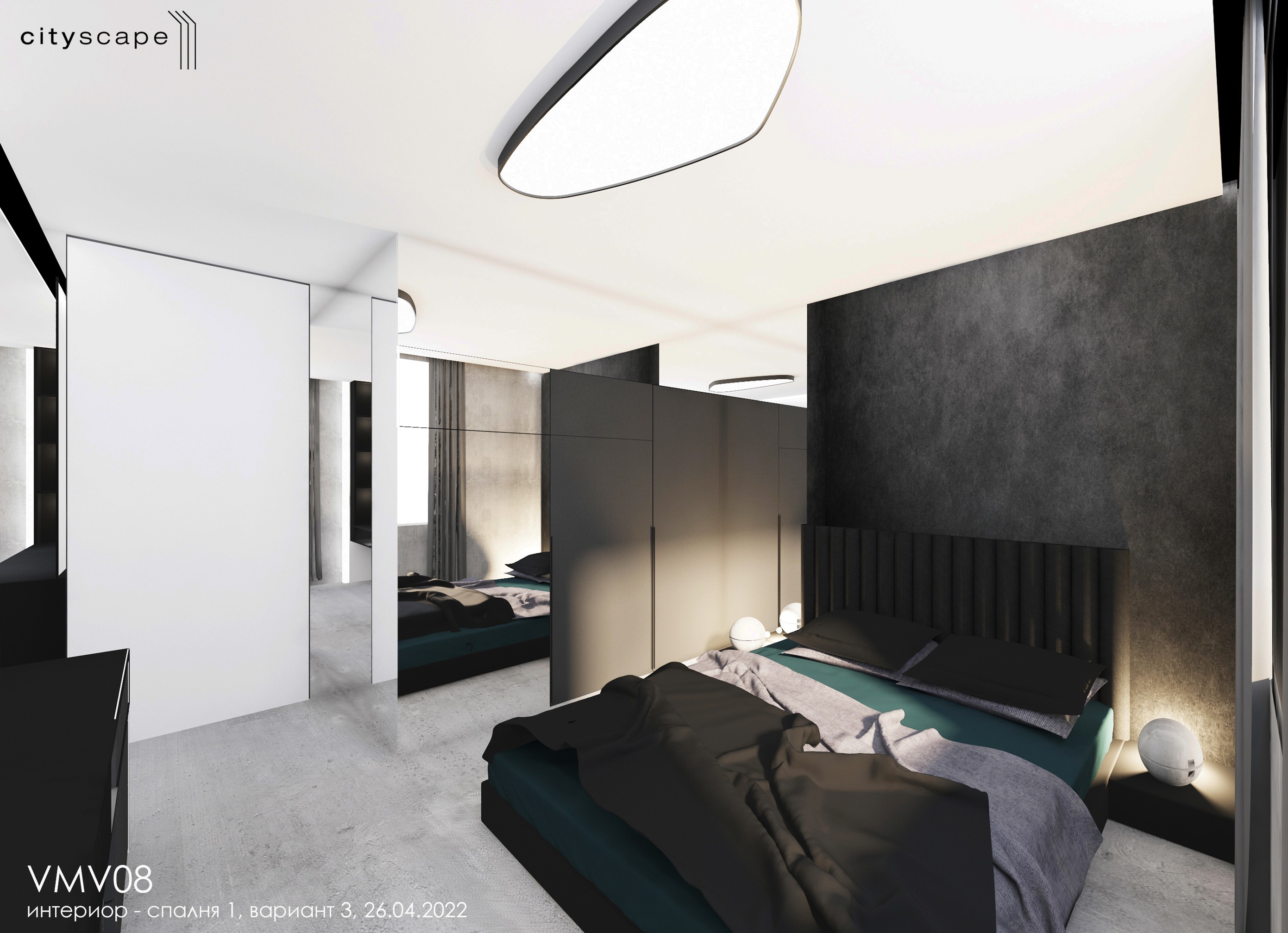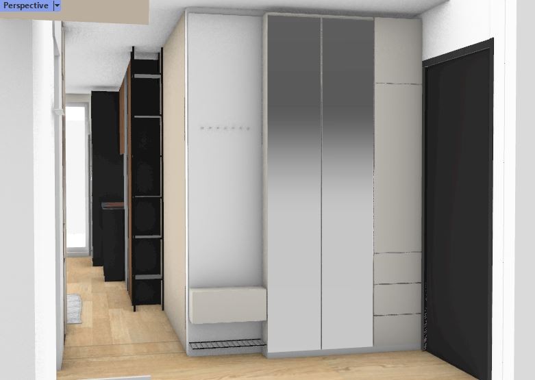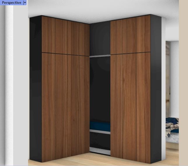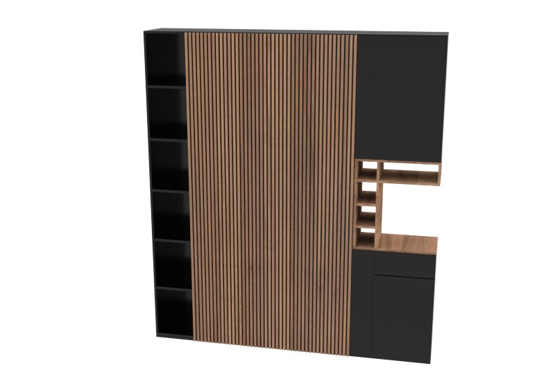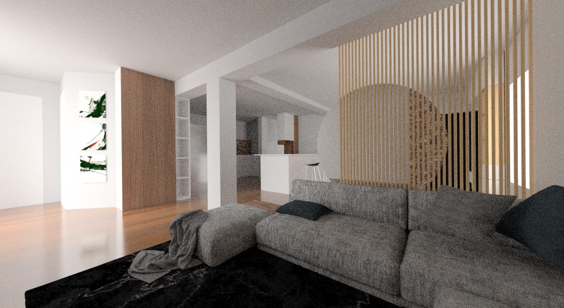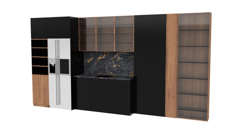 An interior design project for a 3-room residence, natural dark wood materials used for bespoke furniture throughout.