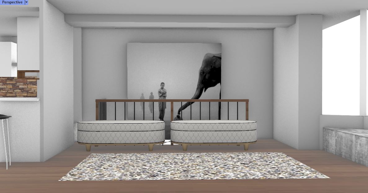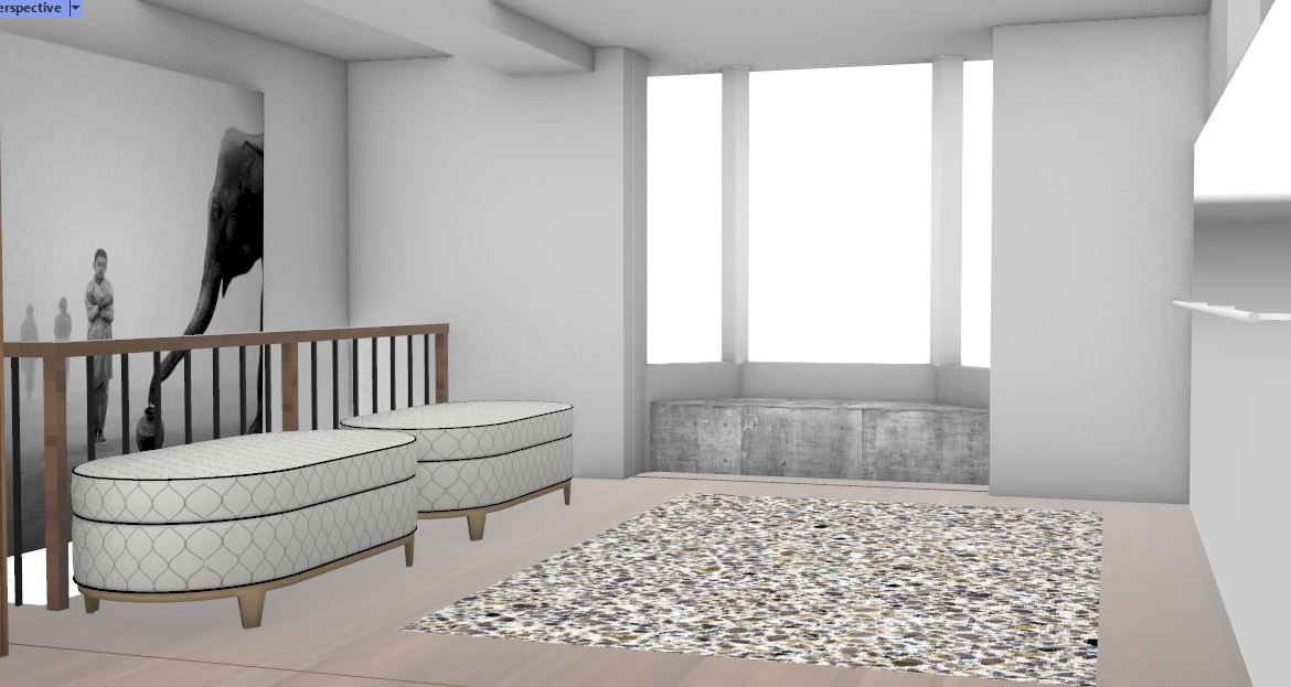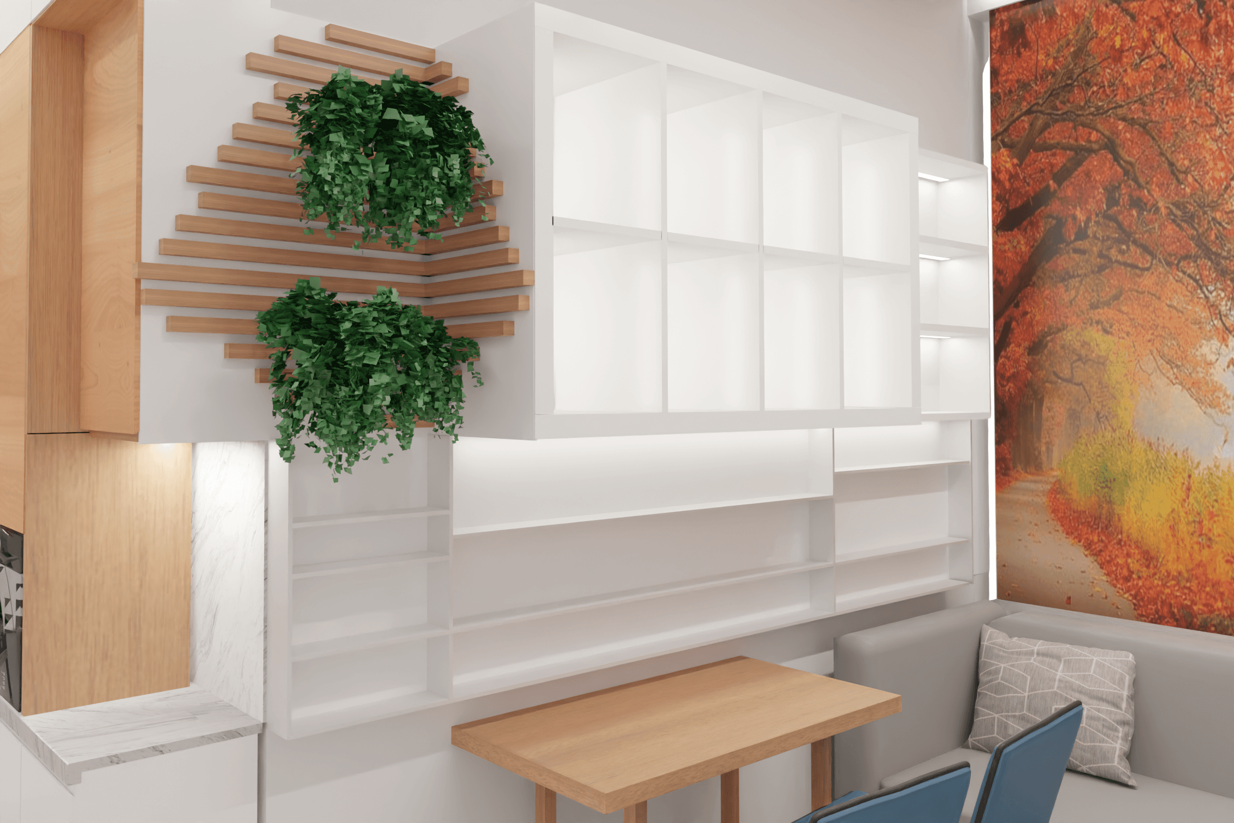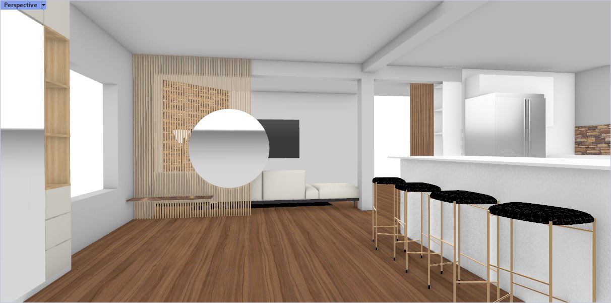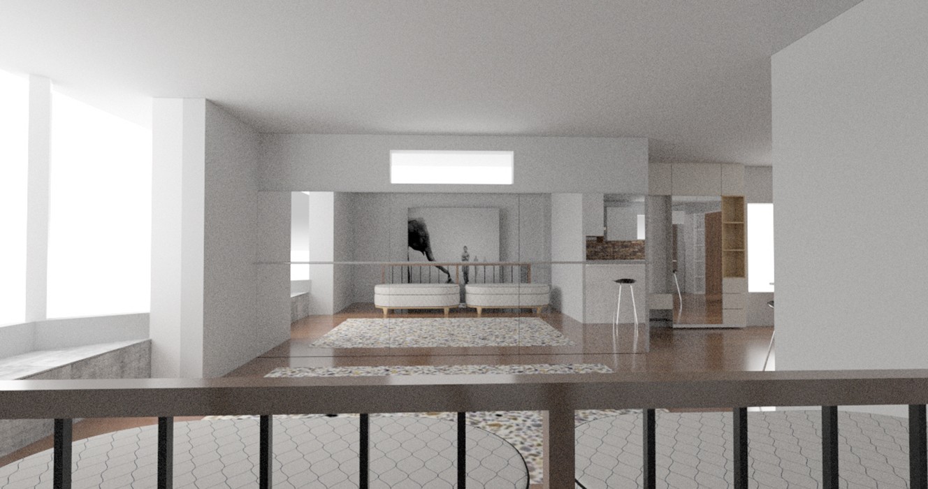 An interior design project for an open plan dance studio with a kitchen and lounge area.