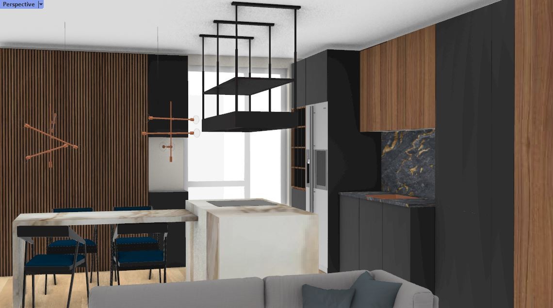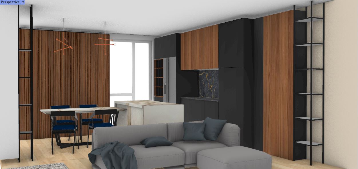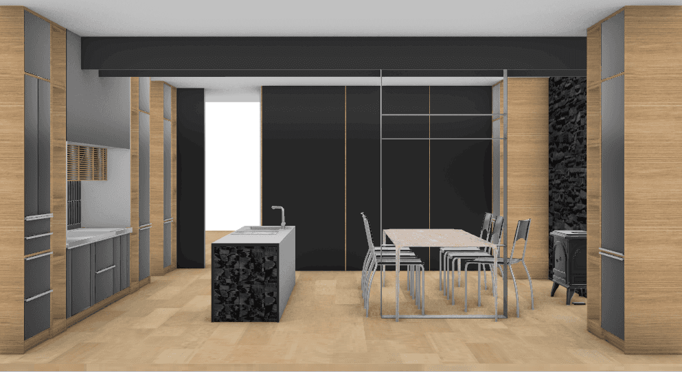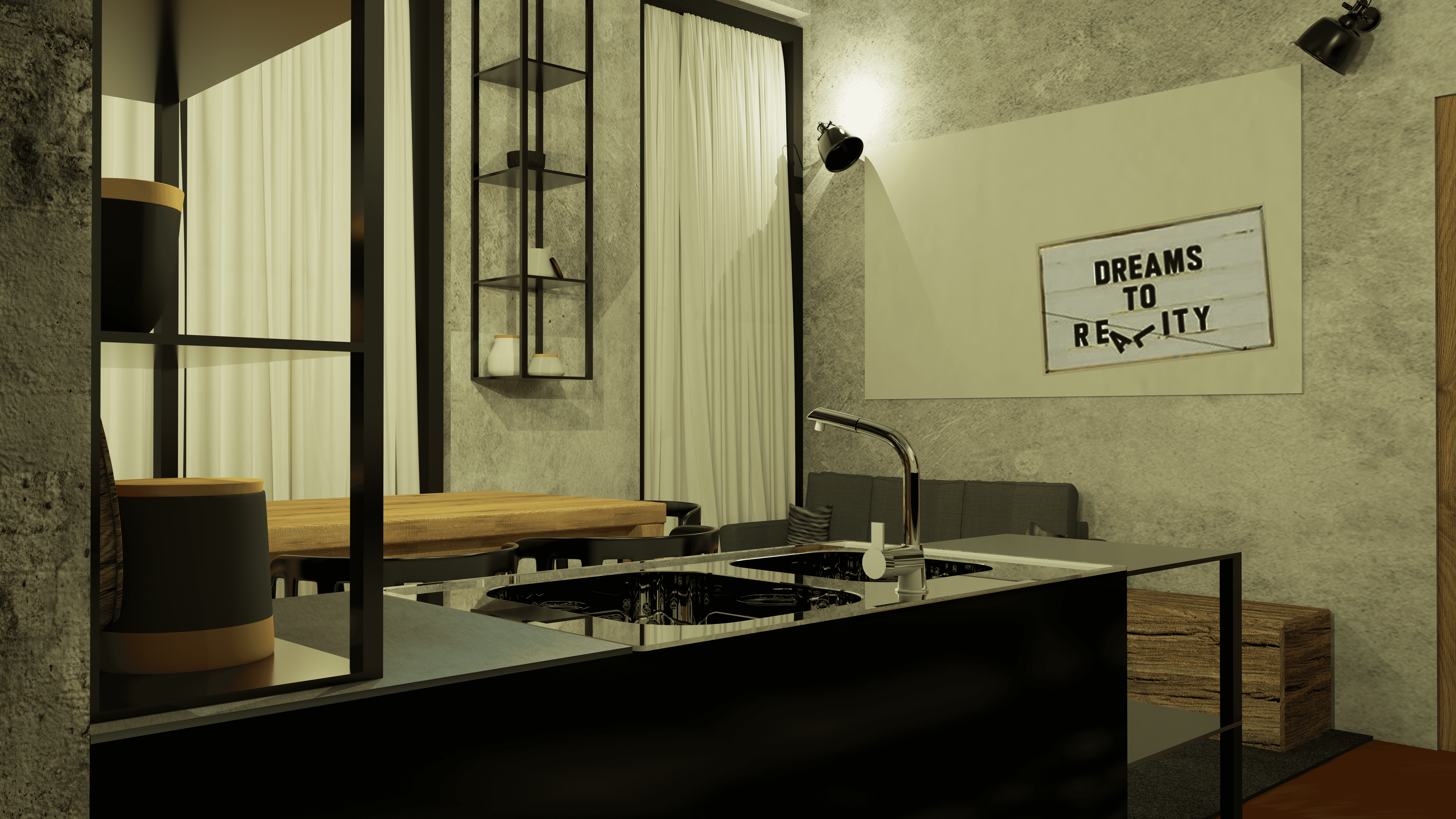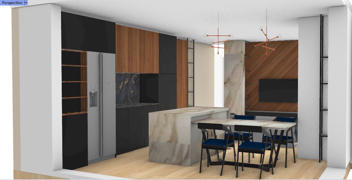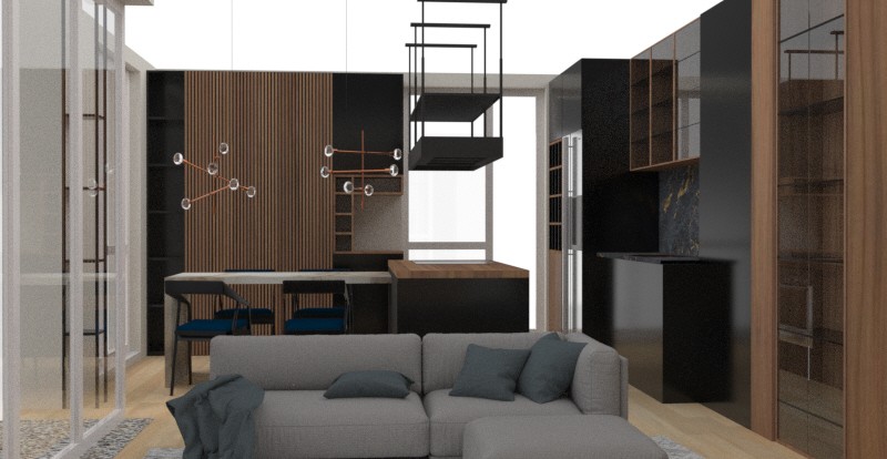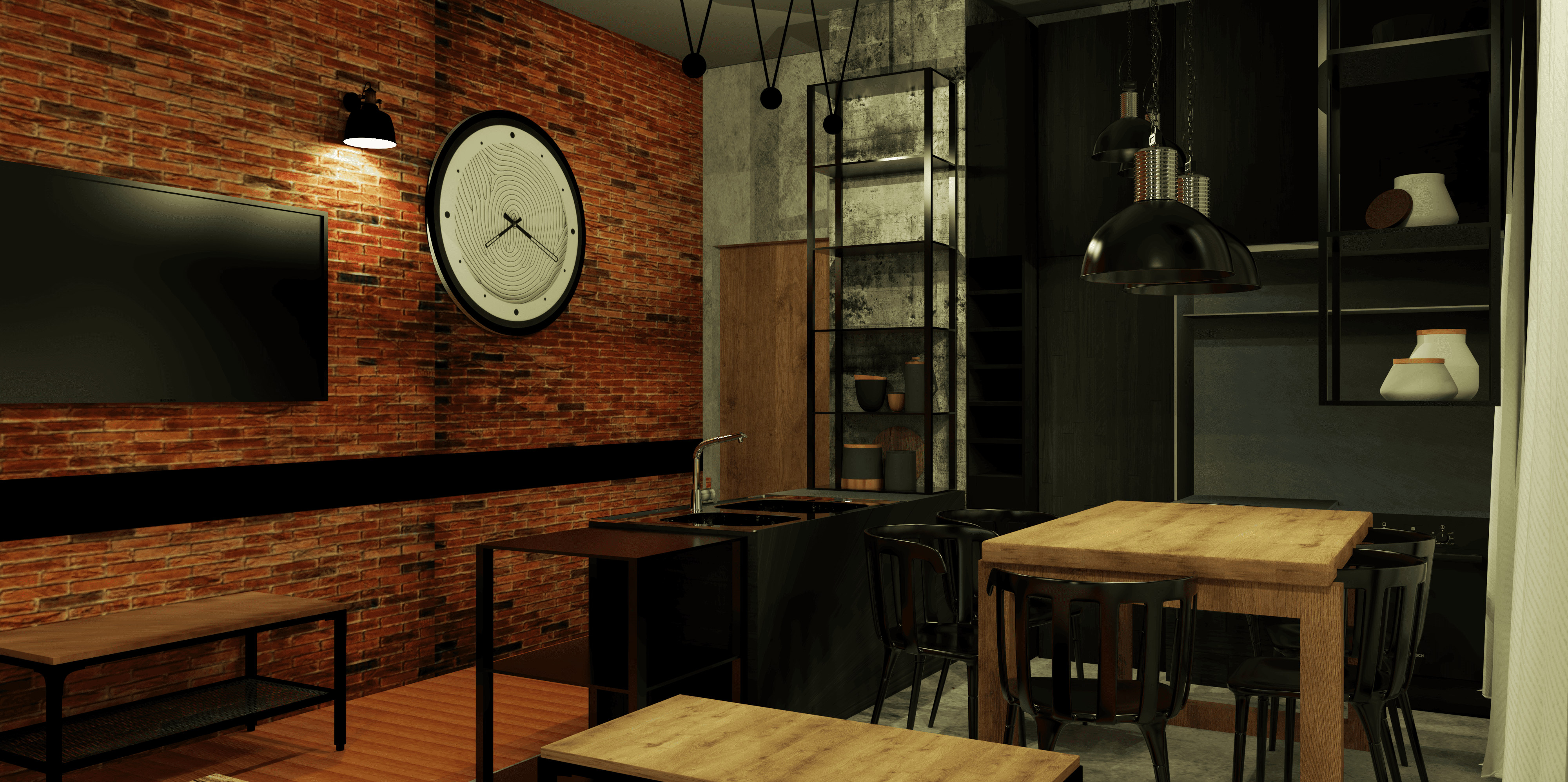 An interior design project for an open plan contemporary kitchen and apartment inspired by Manhattan industrial loft style.