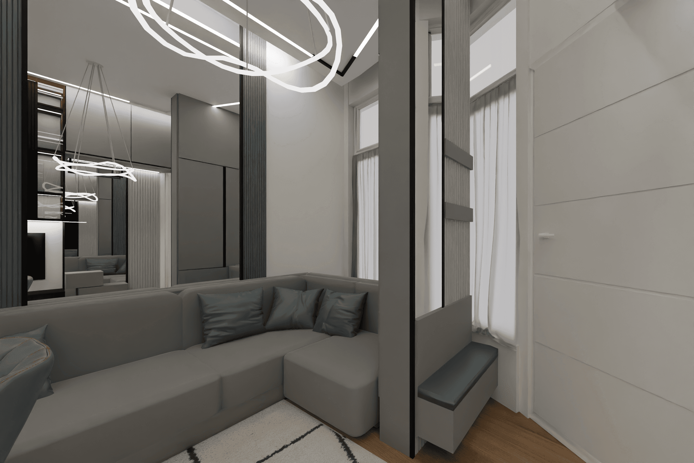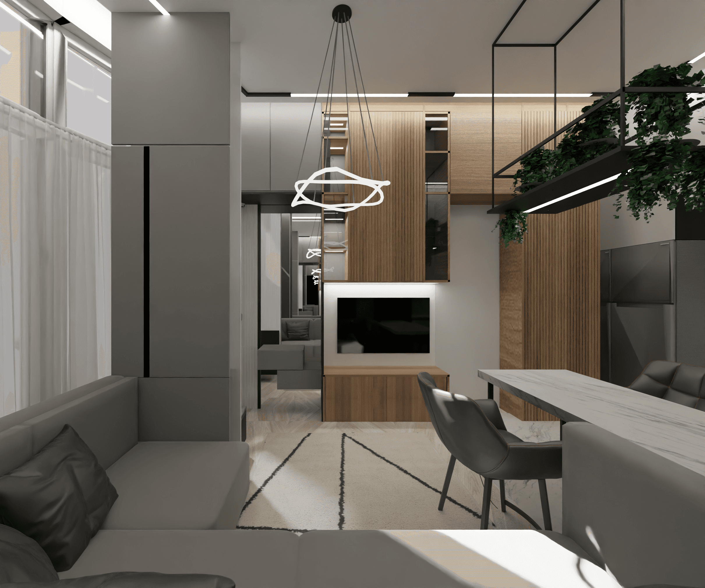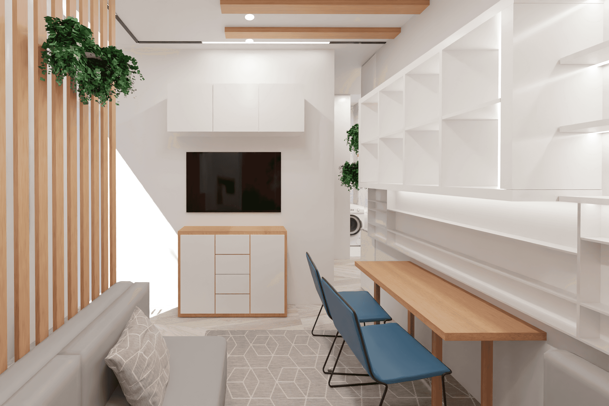 A minimalist apartment interior design IKEA affordable furniture with several bespoke elements.