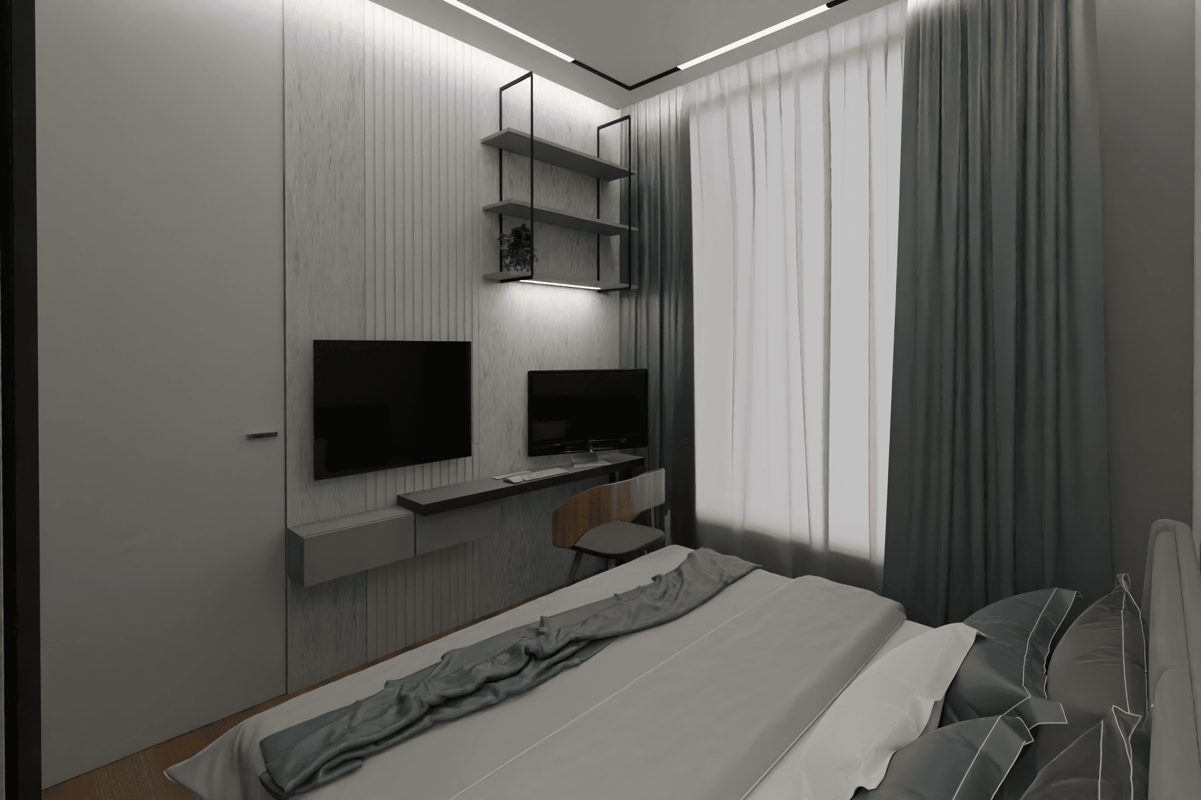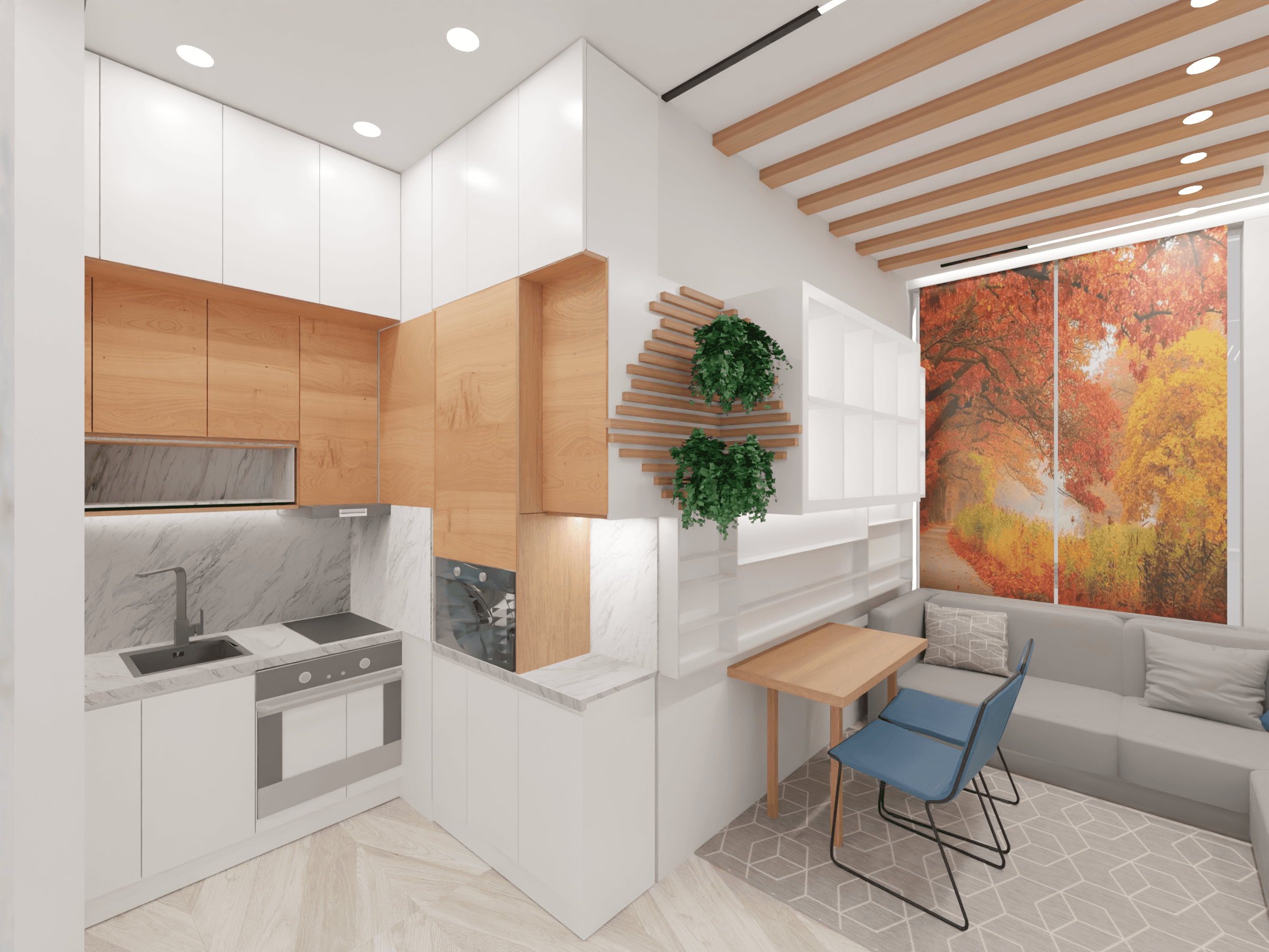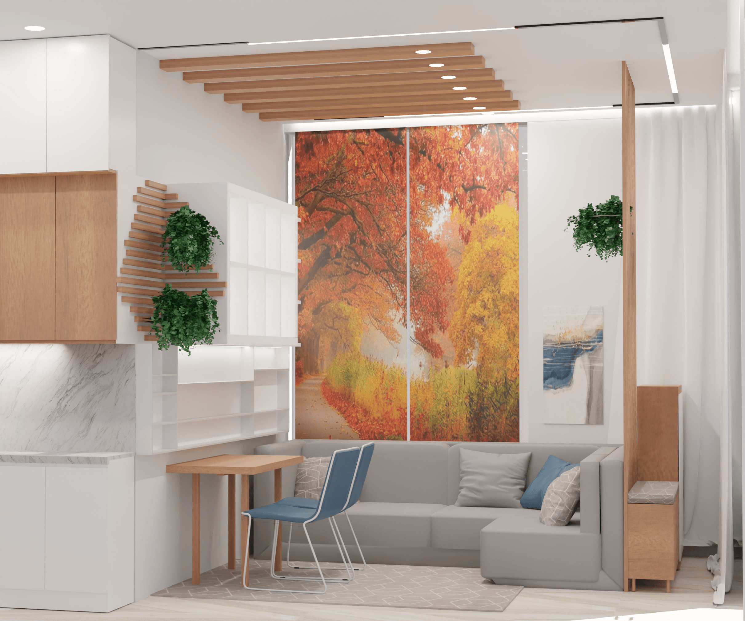 A minimalist apartment interior design IKEA affordable furniture with several bespoke elements.